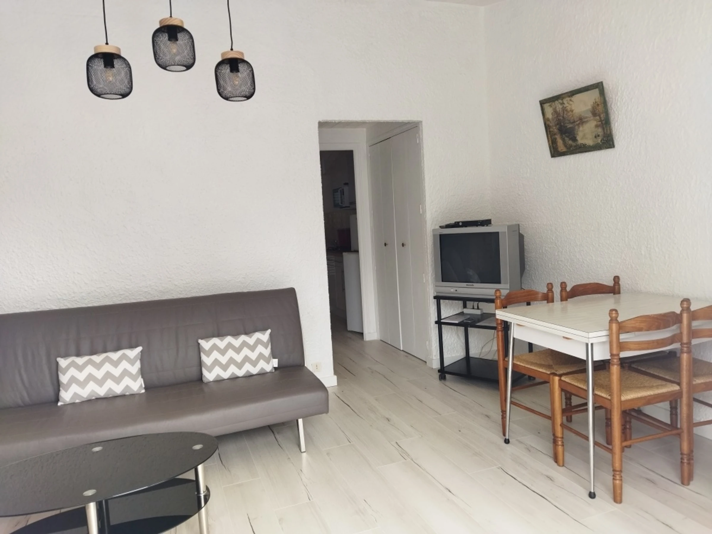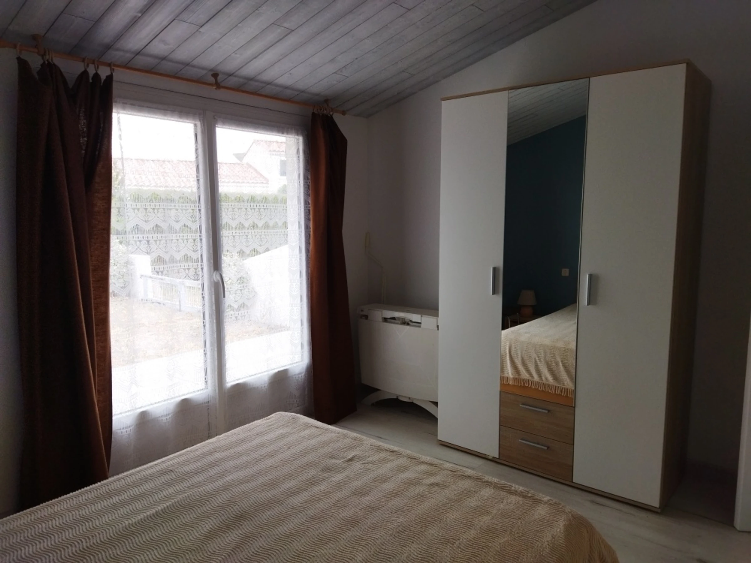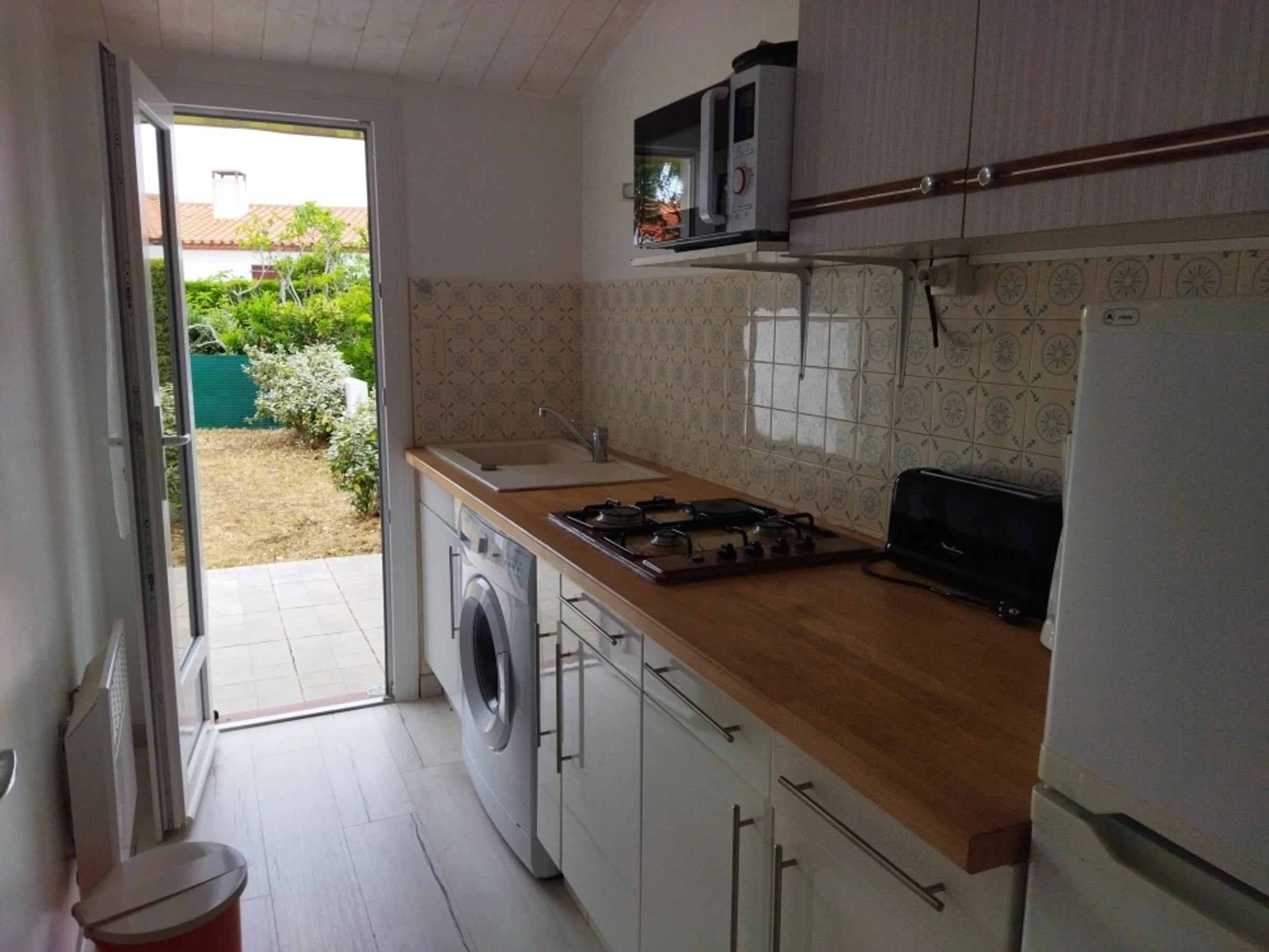 Logement comprenant un coin cuisine équipé (micro-onde réfrigérateur, 4 feux gaz, lave linge) donnant sur le jardin sans vis à vis, un salon/séjour avec 1 clic-clac et un canapé-lit de 140 et TV, 1 grande chambre avec un lit de 140 et une porte fenêtre donnant sur le jardin clos, salle de douche avec lavabo et wc, petit terrain clos devant et derrière avec terrasses, place de parking devant le logement.