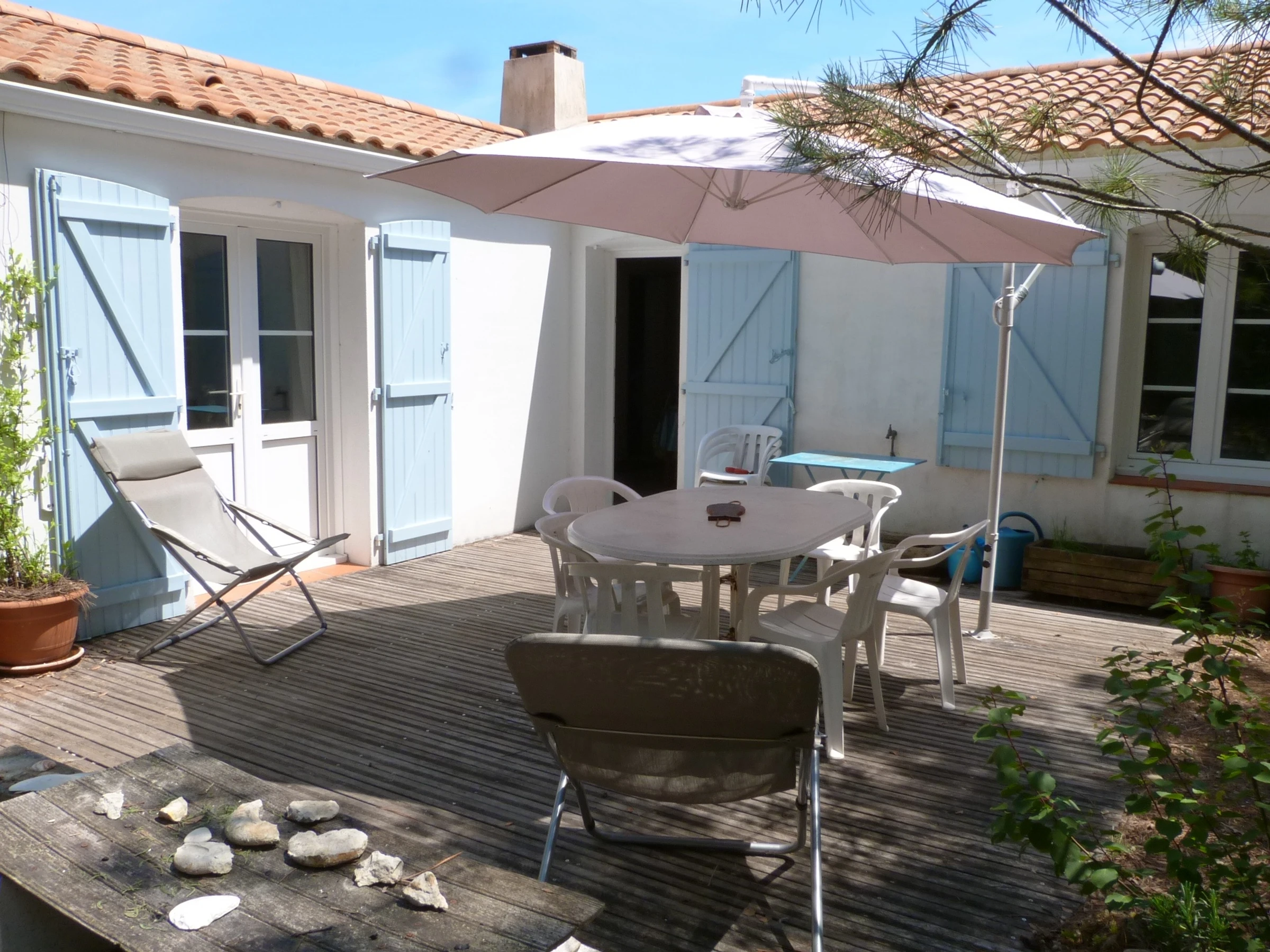 Terrasse avec salon de jardin, parasol, barbecue à charbon, bain de soleil,