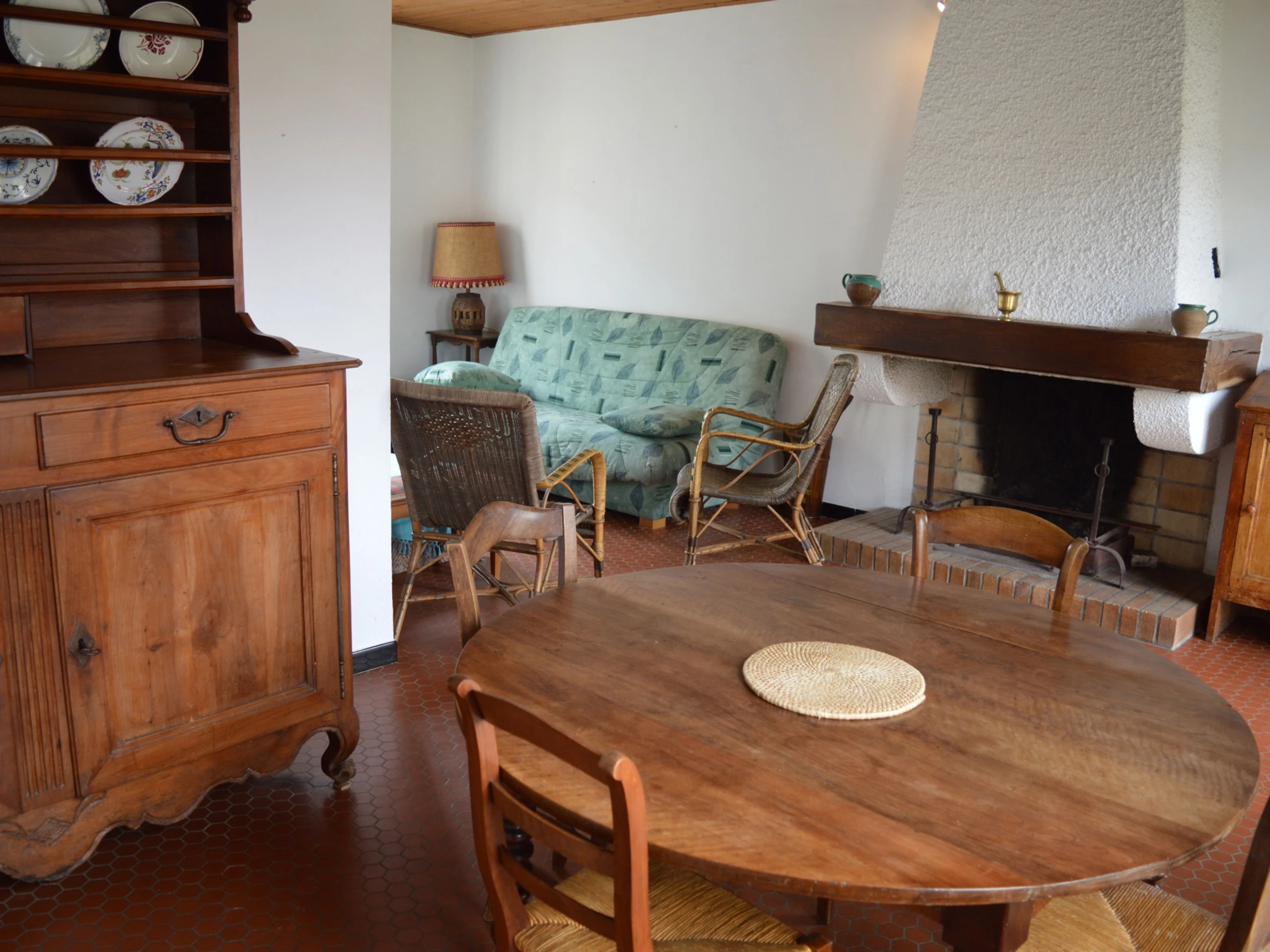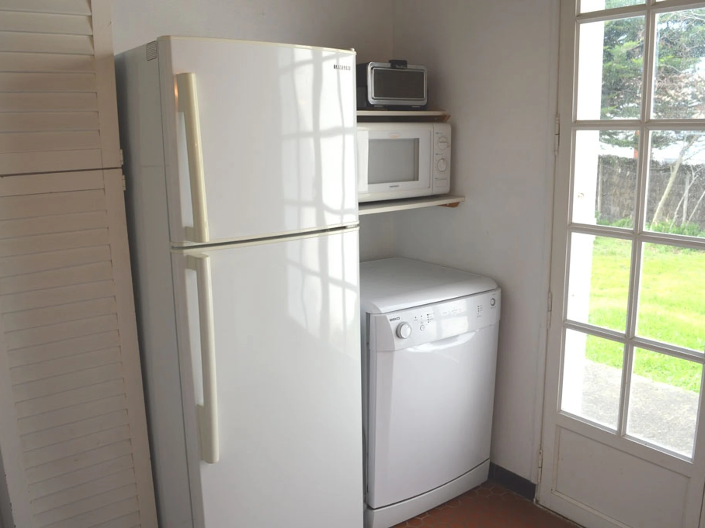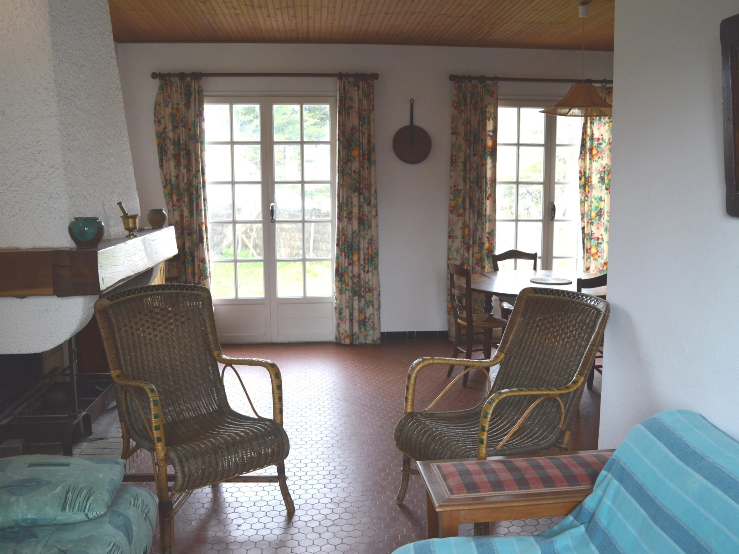 Agencement : 1 séjour-salon avec une partie salon : 2 canapés, 2 fauteuils, 1 TV écran plat (petit format) et 1 cheminée (uniquement décorative) ; et une partie séjour, ouvrant sur la terrasse et le jardin, à l'avant de la maison (côté rue) - 1 petite cuisine (7 m²) : 1 gazinière (4 feux) avec four, 1 micro-ondes, 1 mini-four, 1 réfrigérateur avec petit congélateur et 1 lave-vaisselle - 2 chambres dont 1 avec 2 lits 1 pers. (80) et l'autre avec un lit 2 pers. (140) - 1 salle d'eau (lavabo, cabine de douche et meuble de rangement) - 1 WC séparé - dans le couloir, un placard mural avec lave-linge.