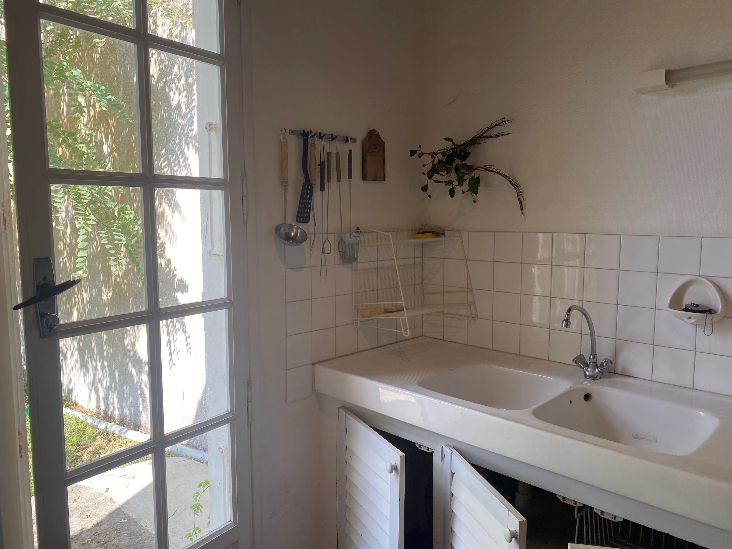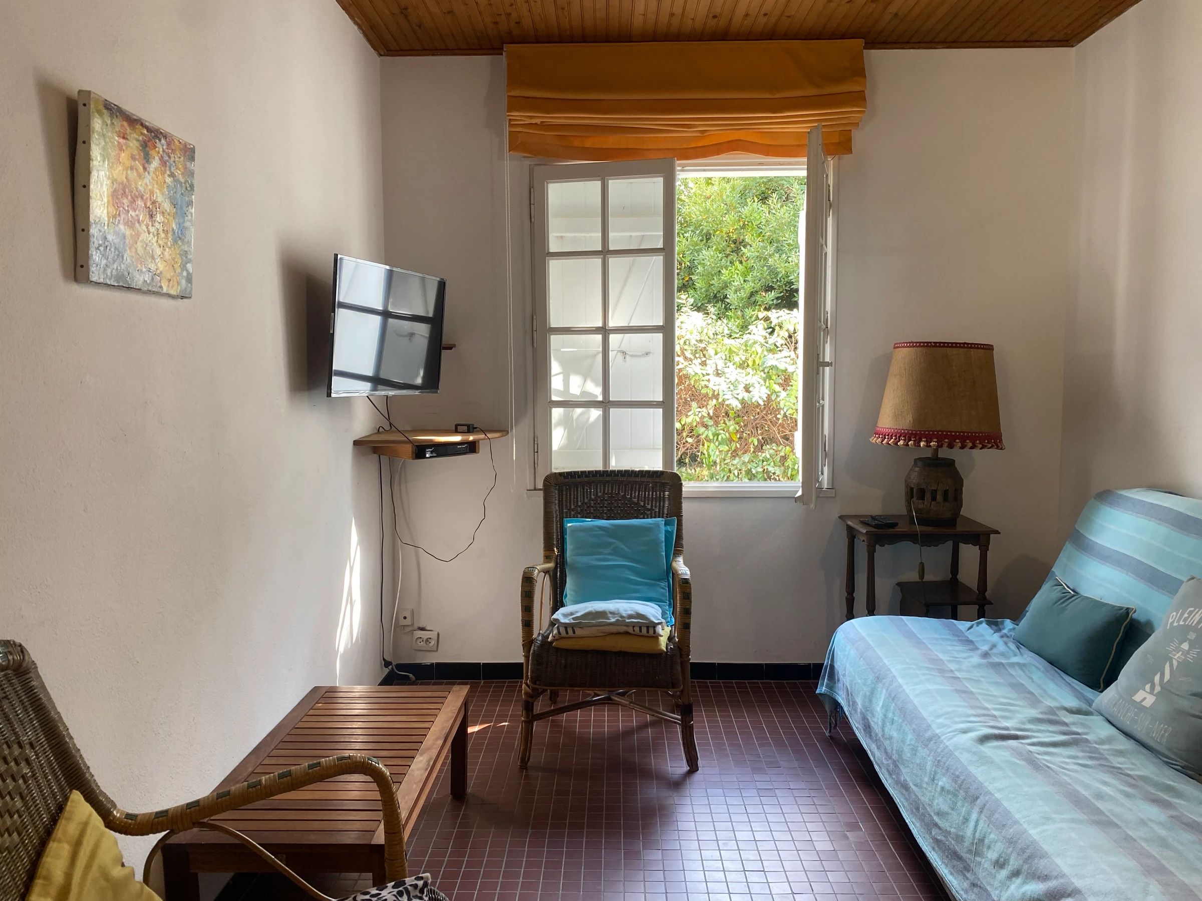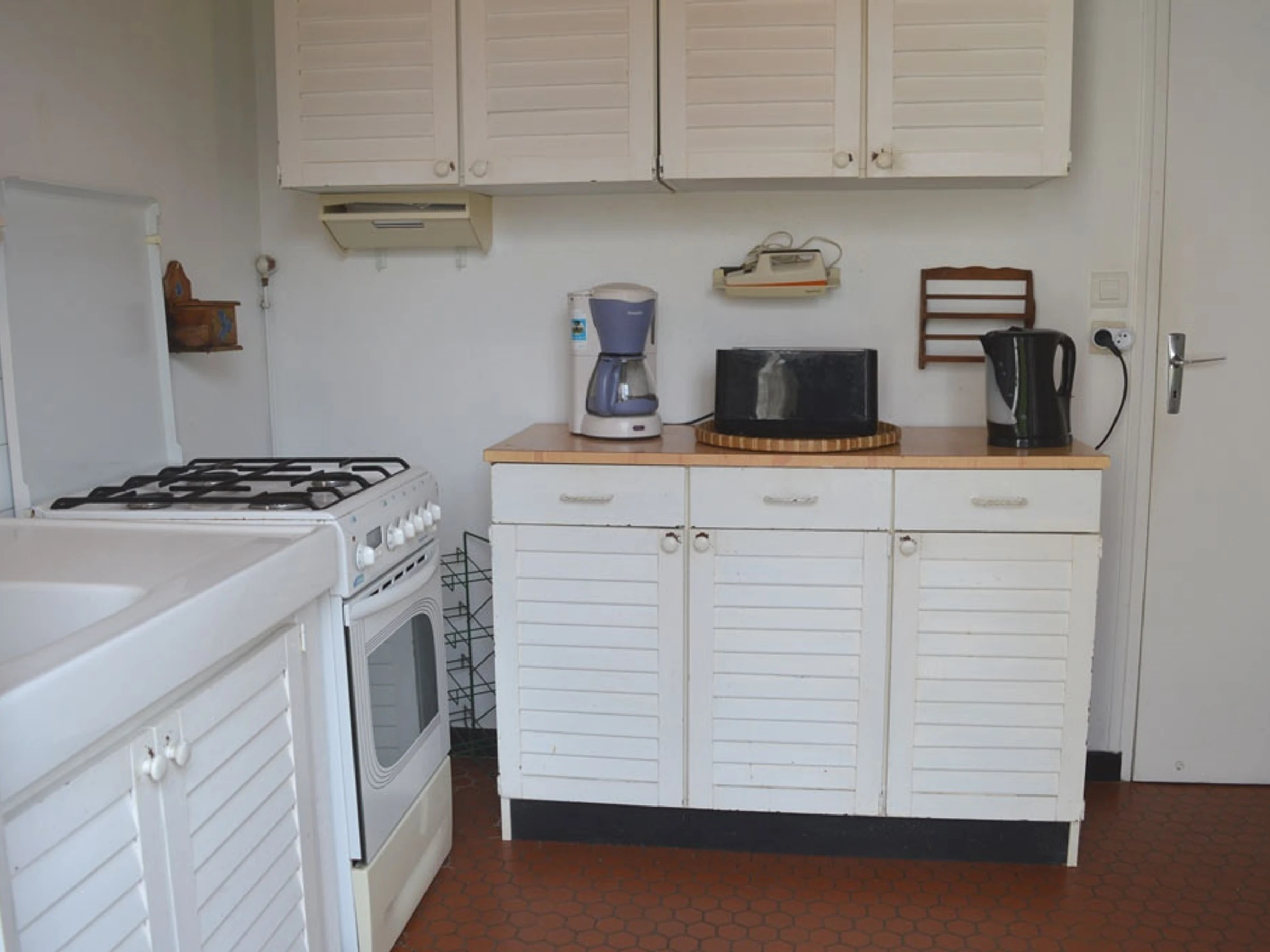 Agencement : 1 séjour-salon avec une partie salon : 2 canapés, 2 fauteuils, 1 TV écran plat (petit format) et 1 cheminée (uniquement décorative) ; et une partie séjour, ouvrant sur la terrasse et le jardin, à l'avant de la maison (côté rue) - 1 petite cuisine (7 m²) : 1 gazinière (4 feux) avec four, 1 micro-ondes, 1 mini-four, 1 réfrigérateur avec petit congélateur et 1 lave-vaisselle - 2 chambres dont 1 avec 2 lits 1 pers. (80) et l'autre avec un lit 2 pers. (140) - 1 salle d'eau (lavabo, cabine de douche et meuble de rangement) - 1 WC séparé - dans le couloir, un placard mural avec lave-linge.