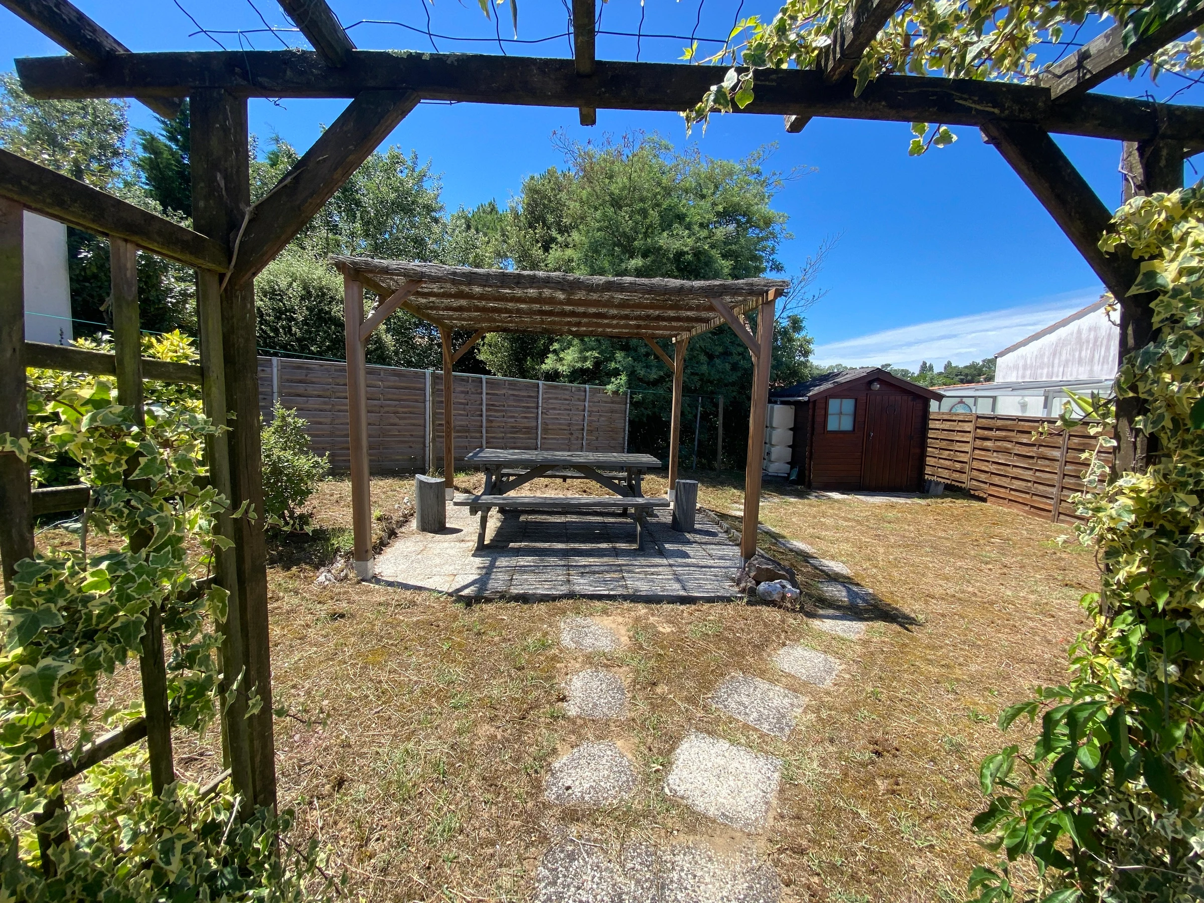 Extérieur : terrasse donnant sur jardin aménagé, en espalier, avec barbecue en dur et salon de jardin. Table "pique-nique" au fond du jardin. Parking sur terrain (allée goudronnée) côté rue.