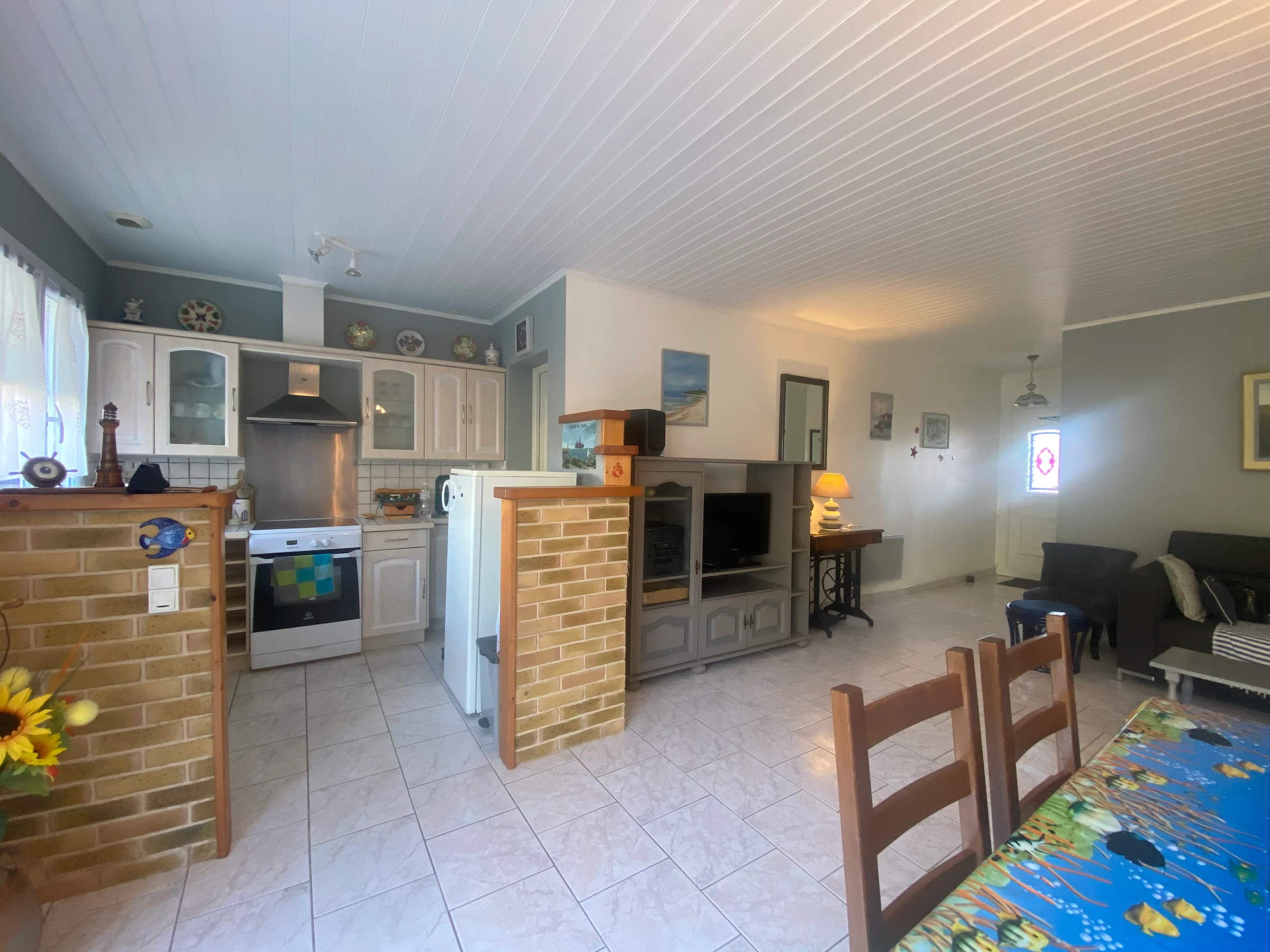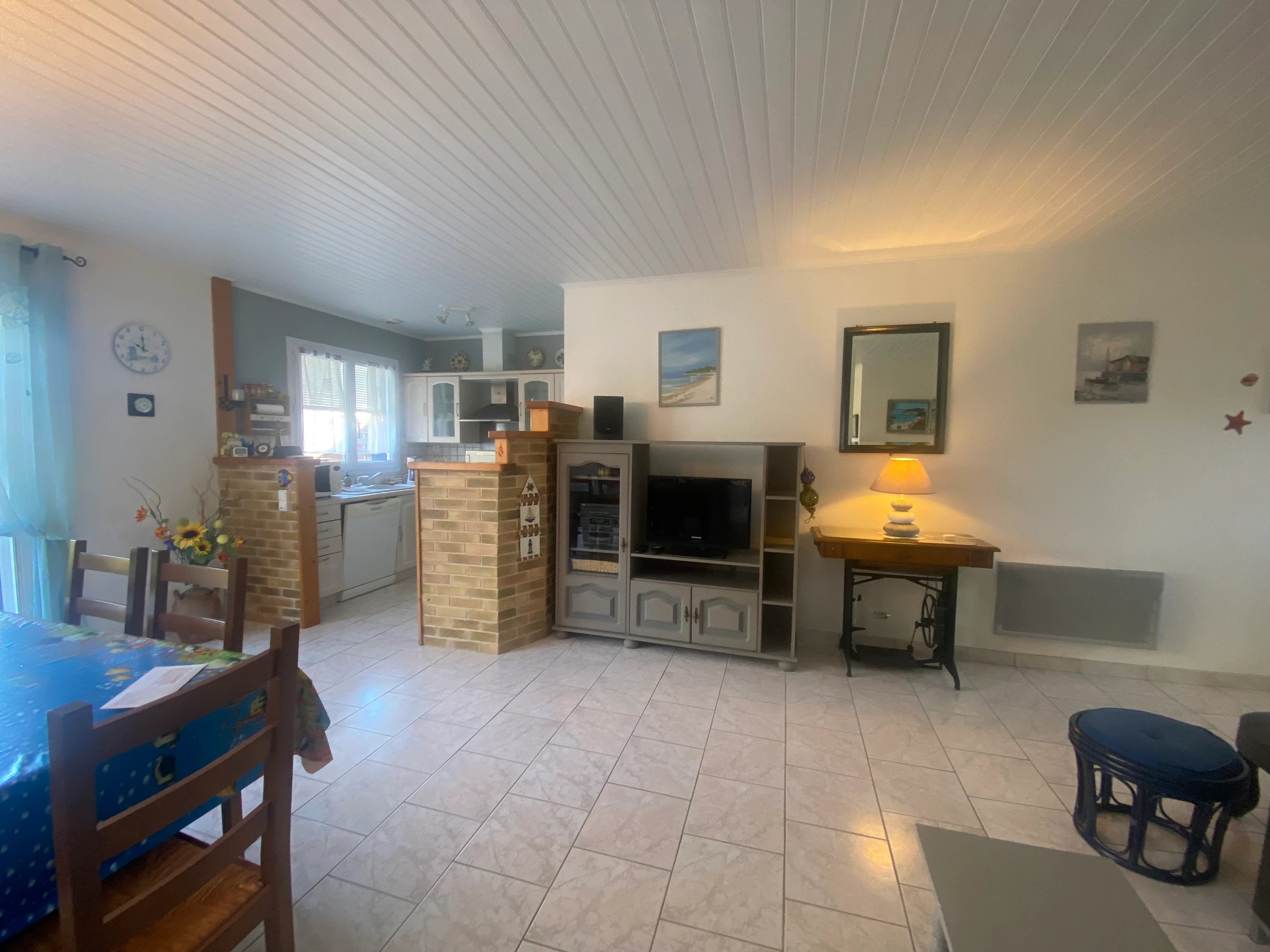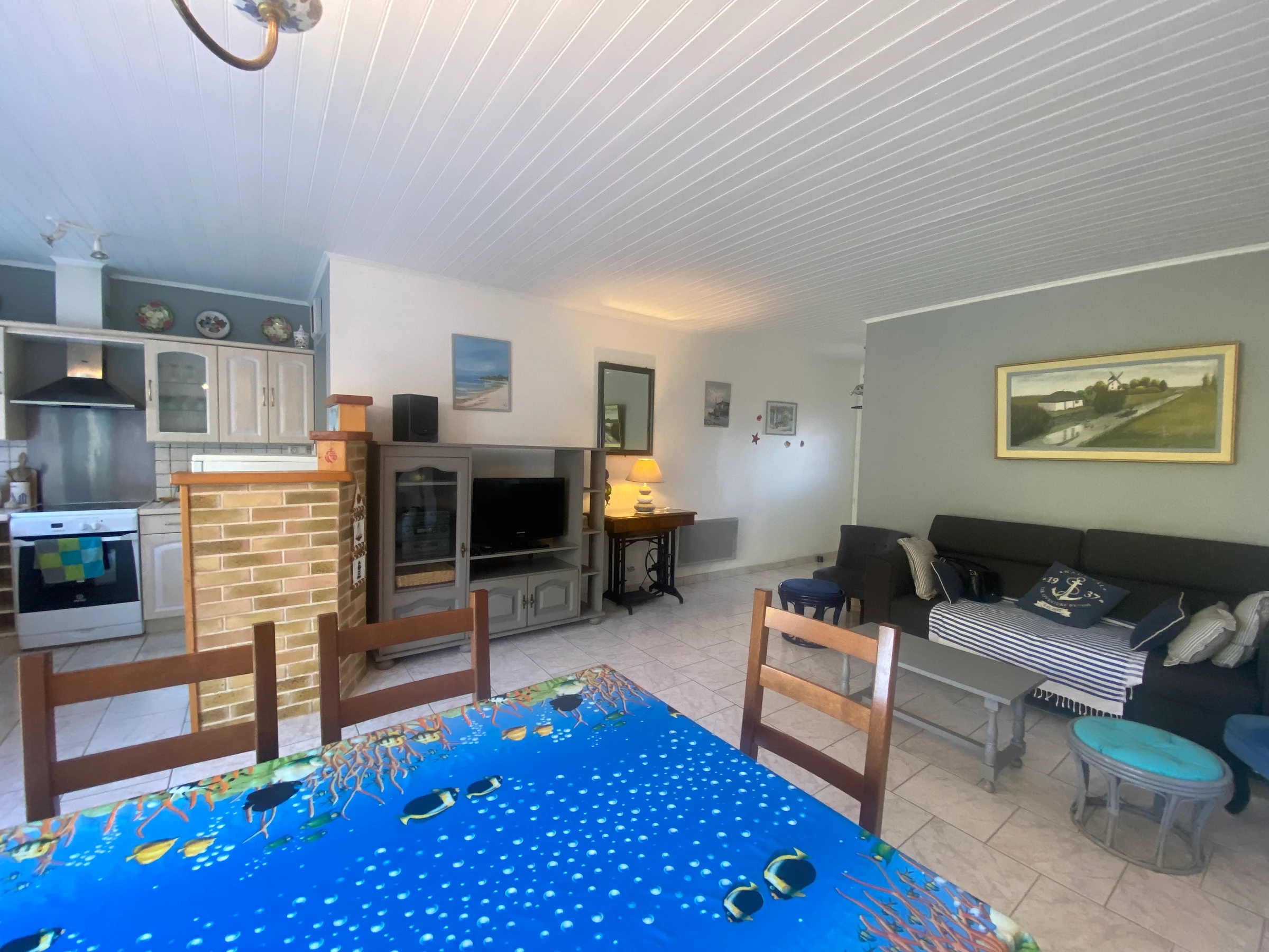 -> 1 séjour et 1 cuisine américaine (plaque vitrocéramique à 4 feux, hotte, four, micro-ondes, plan de travail carrelé, réfrigérateur, lave-vaisselle). Accès à la terrasse et au jardin par la baie vitrée du séjour.