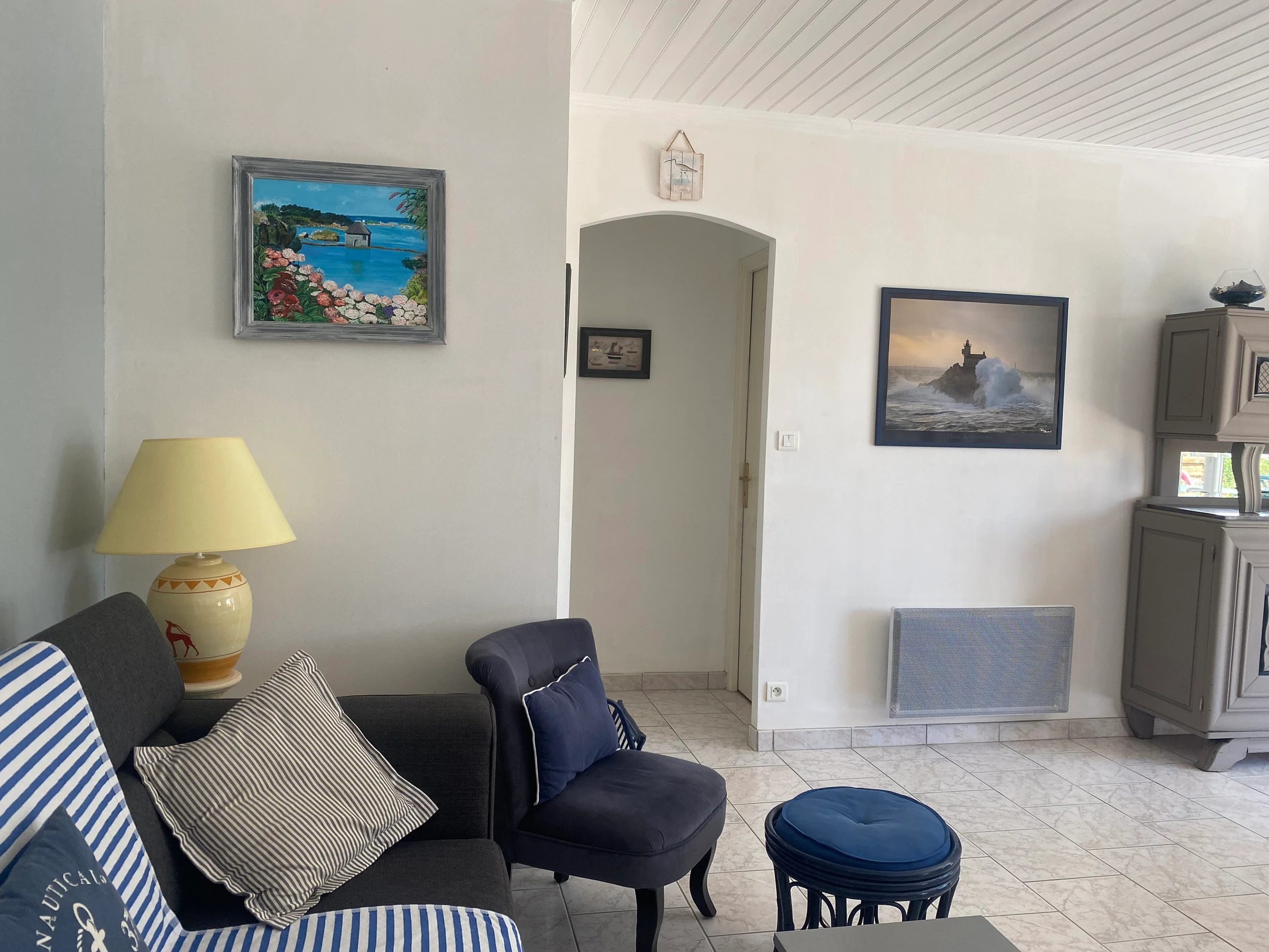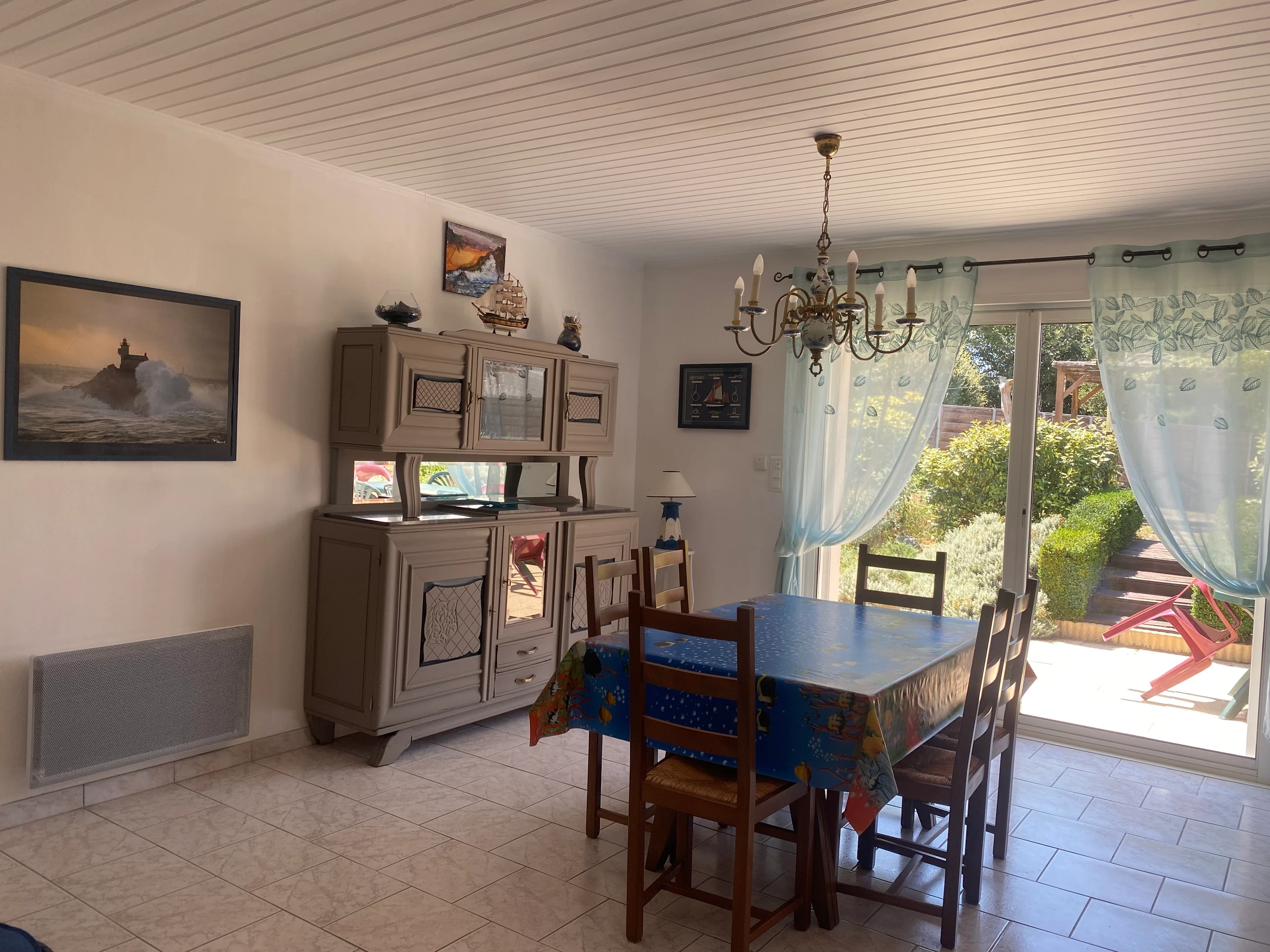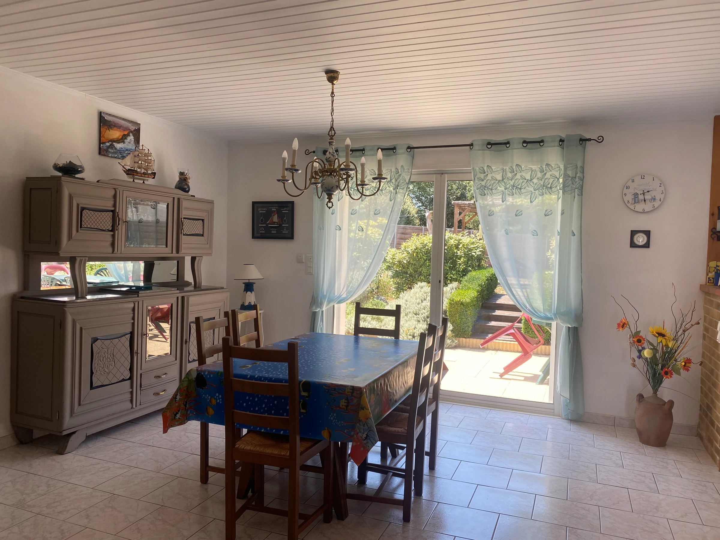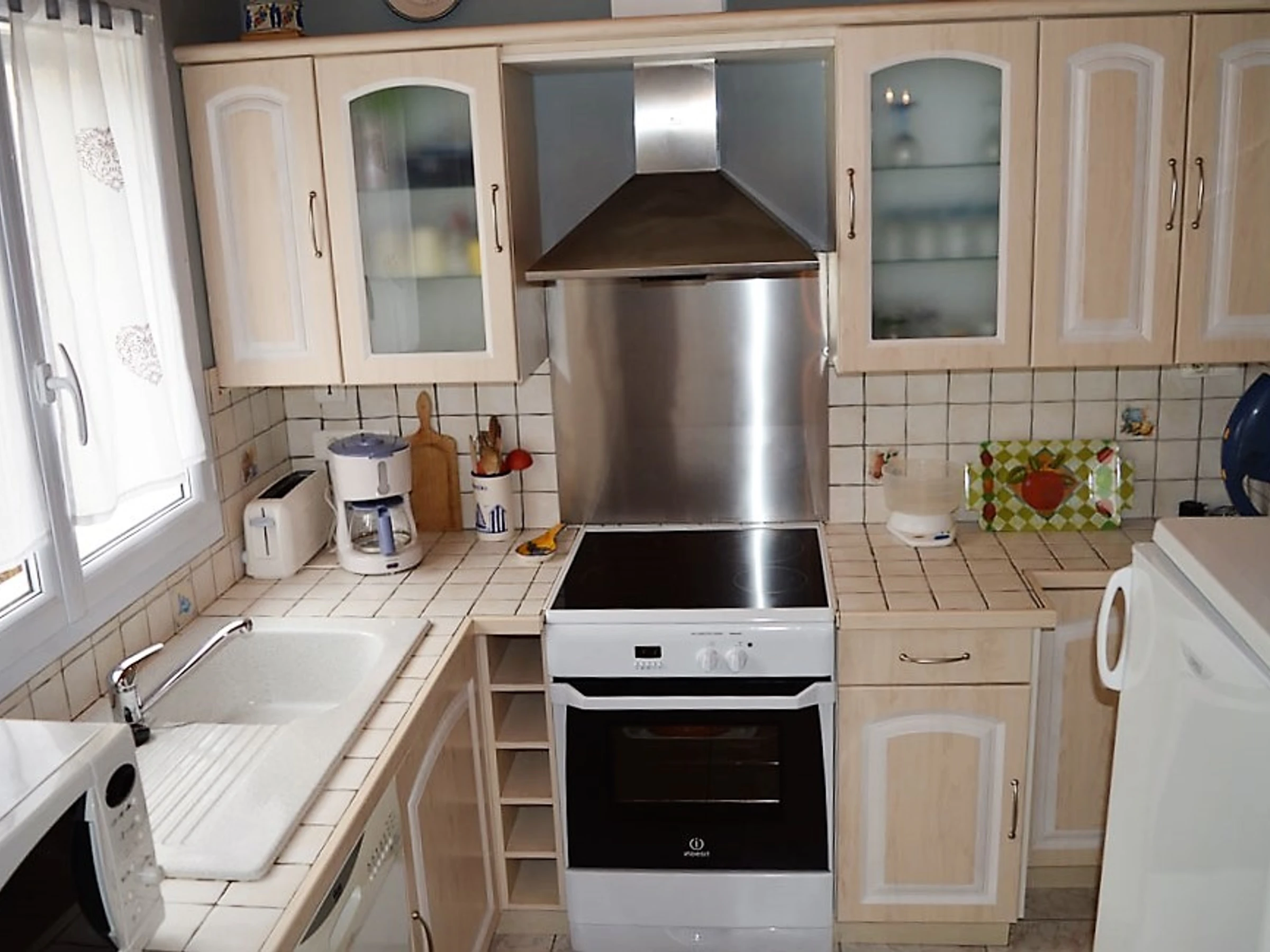 -> 1 séjour et 1 cuisine américaine (plaque vitrocéramique à 4 feux, hotte, four, micro-ondes, plan de travail carrelé, réfrigérateur, lave-vaisselle). Accès à la terrasse et au jardin par la baie vitrée du séjour.