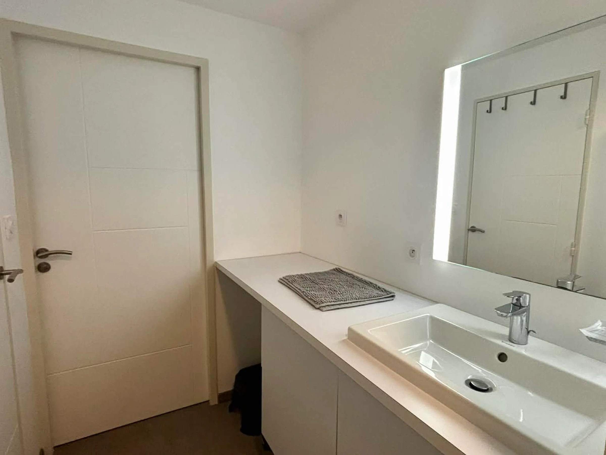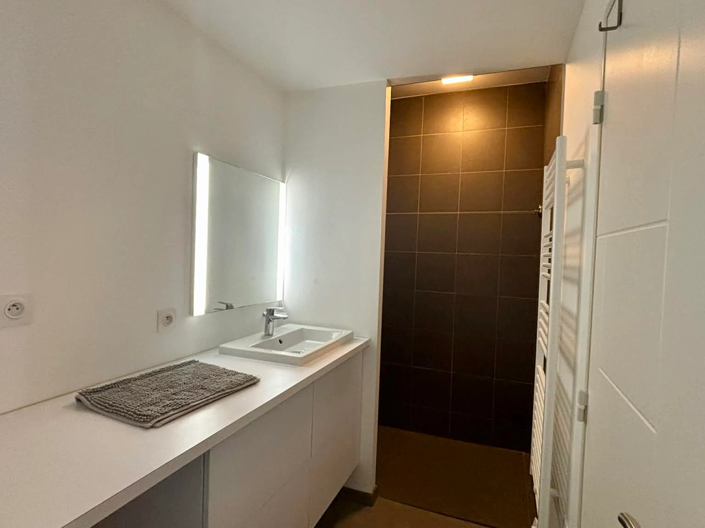 Salle d'eau avec douche à l'italienne, meuble vasque, sèche-serviette,