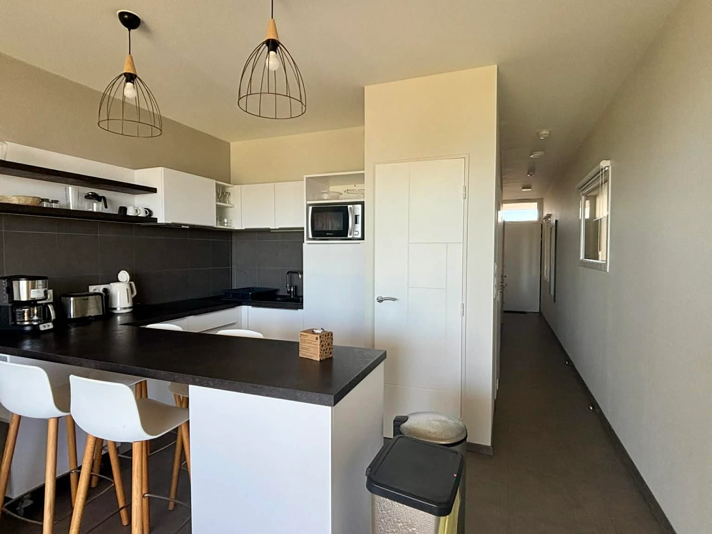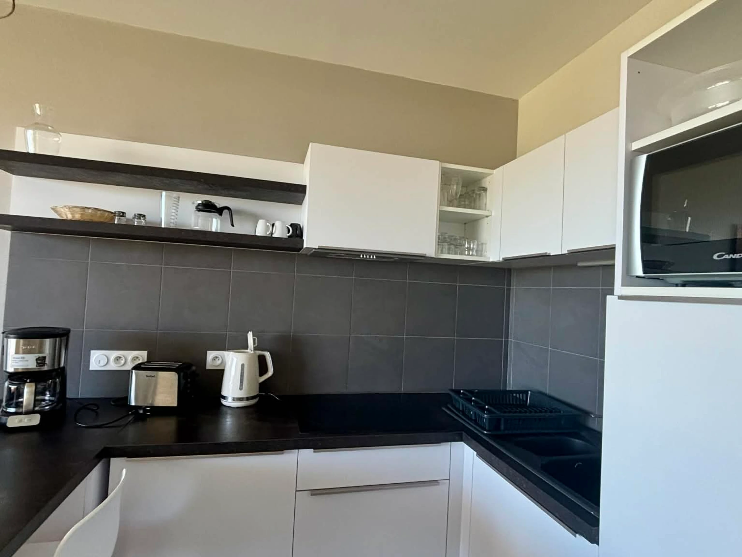 Cuisine équipée et aménagée ouverte (micro-ondes multifonctions, réfrigérateur/freezer, plaque induction, cafetière à filtre, grille-pain, bouilloire),