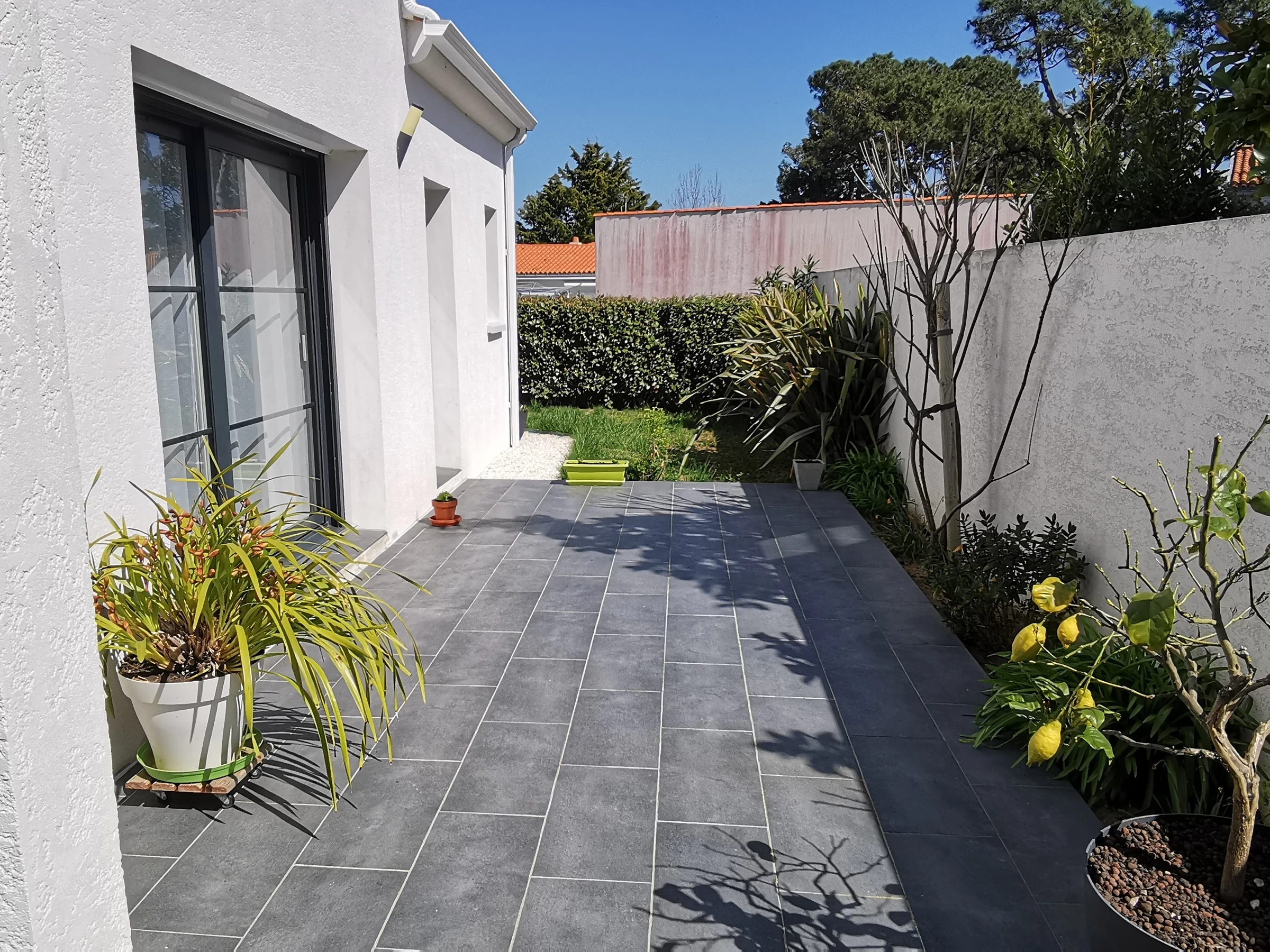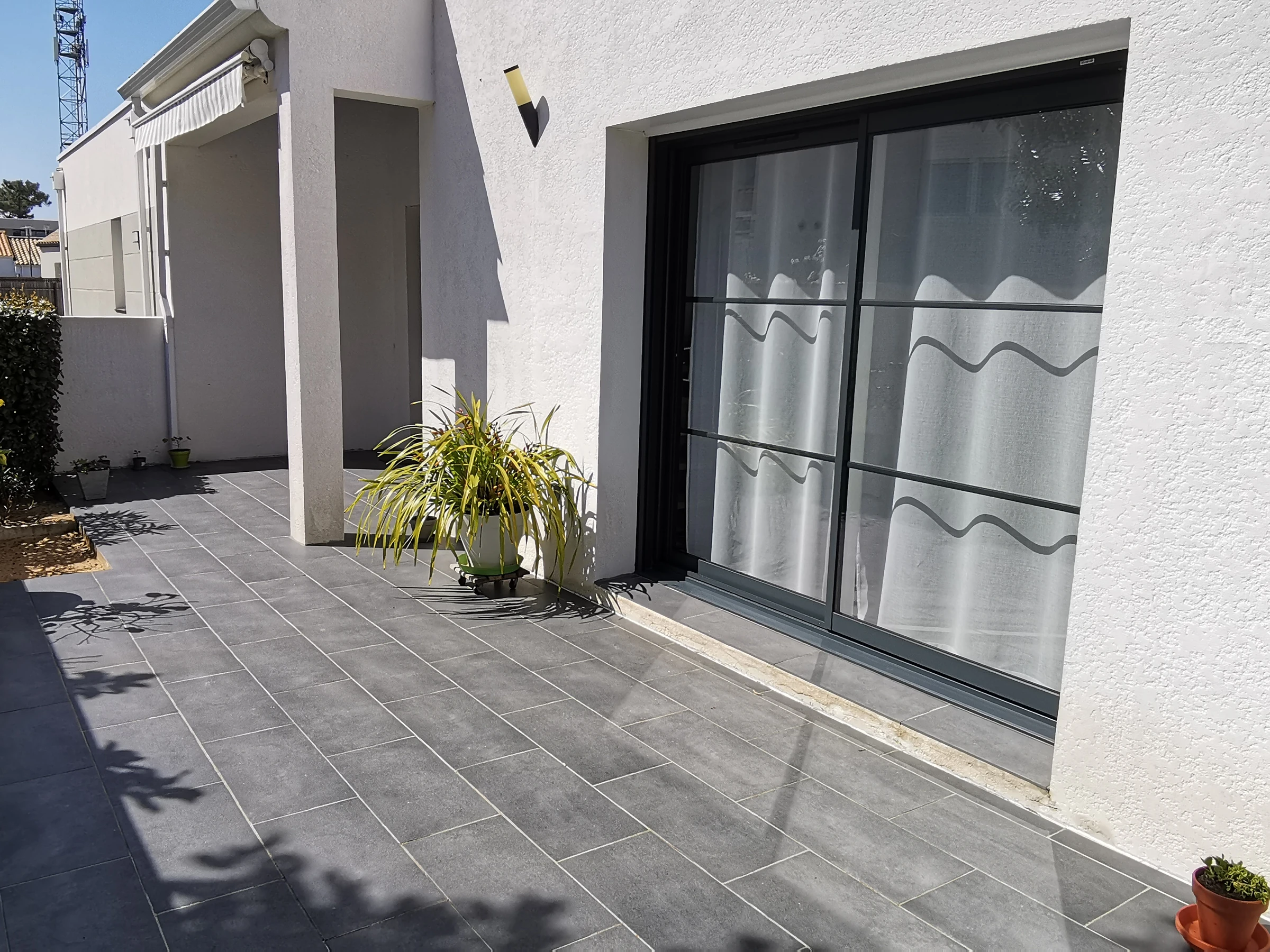 Terrasse avec auvent avec mobilier de jardin et barbecue.
