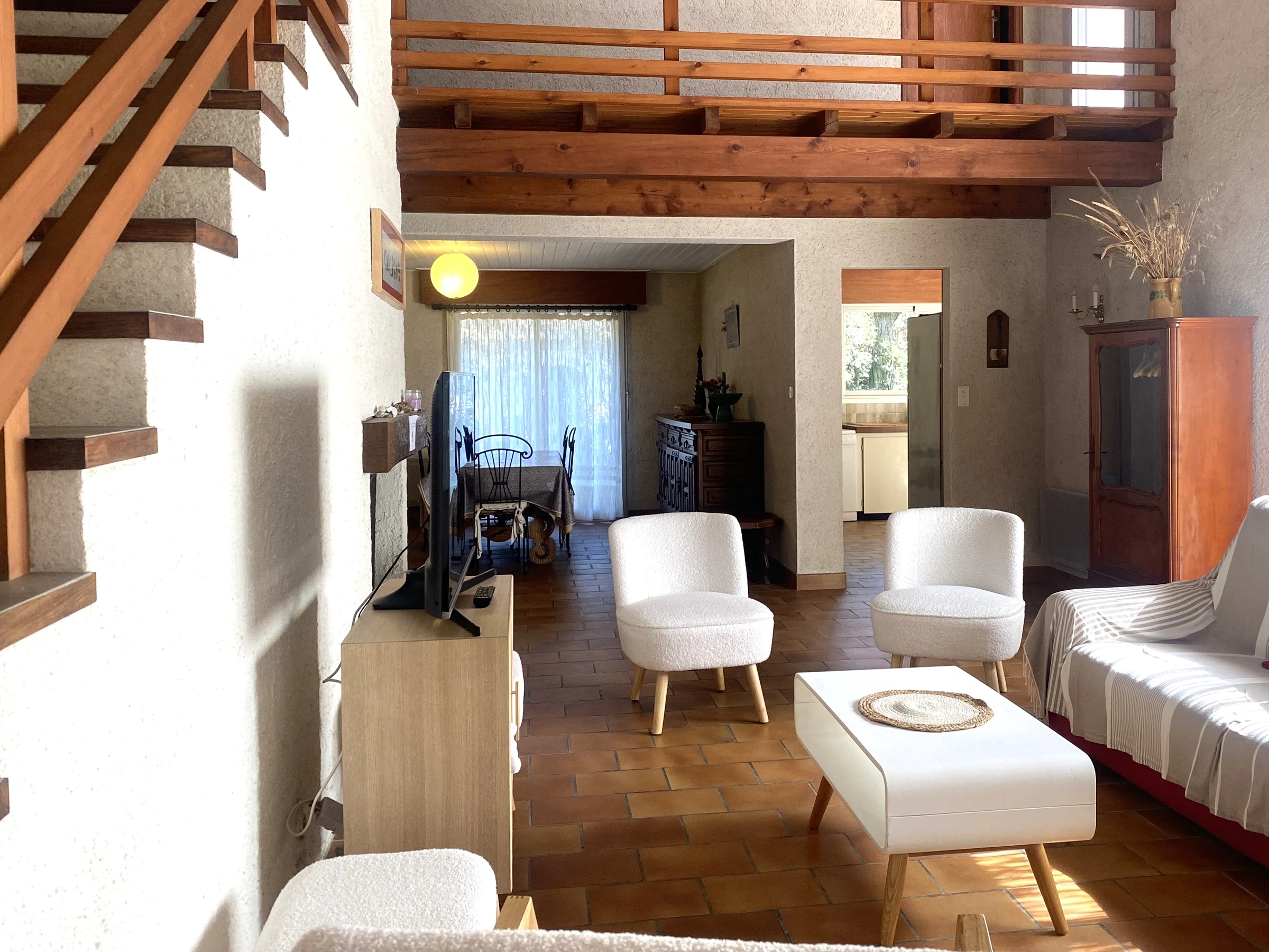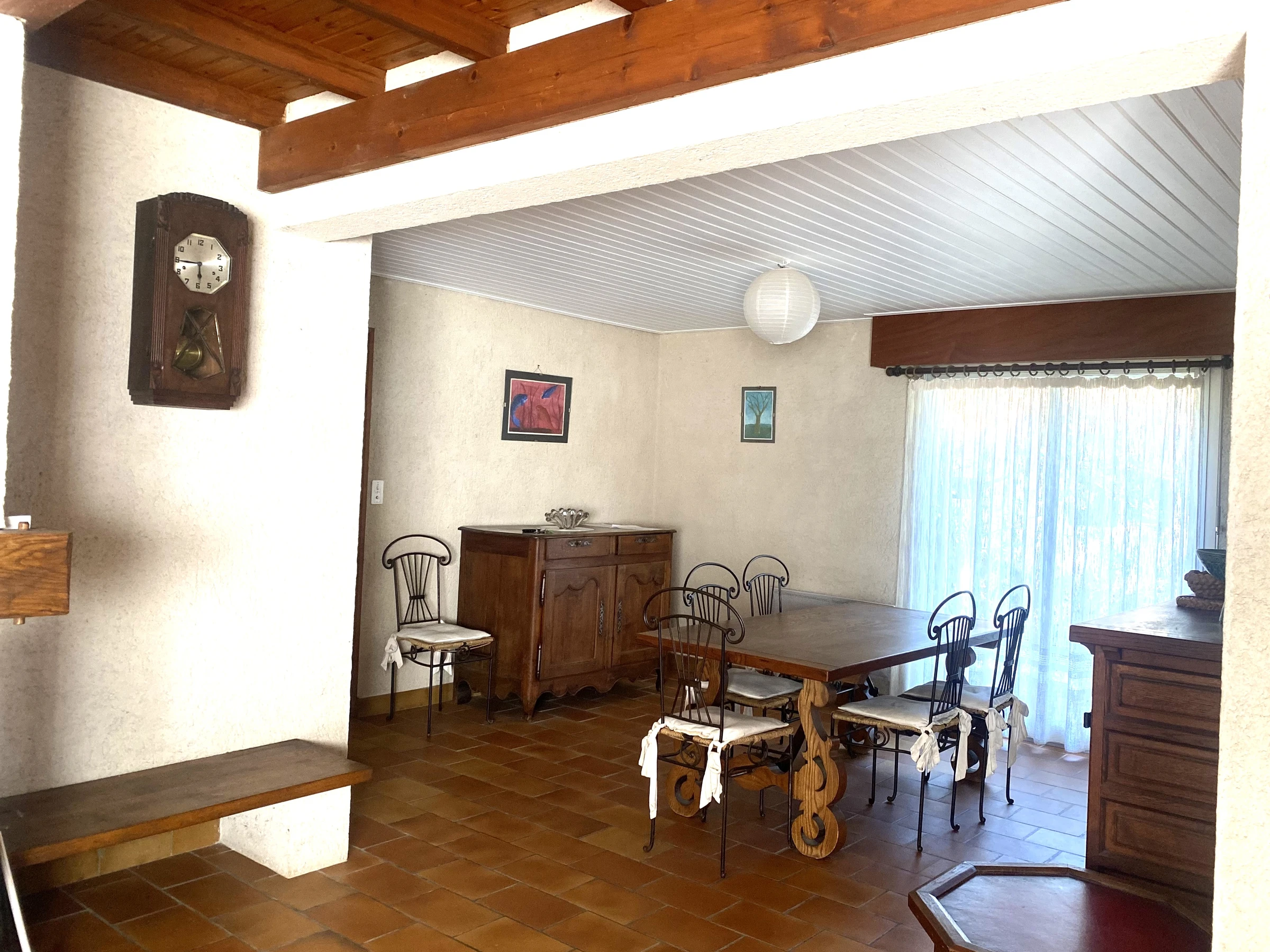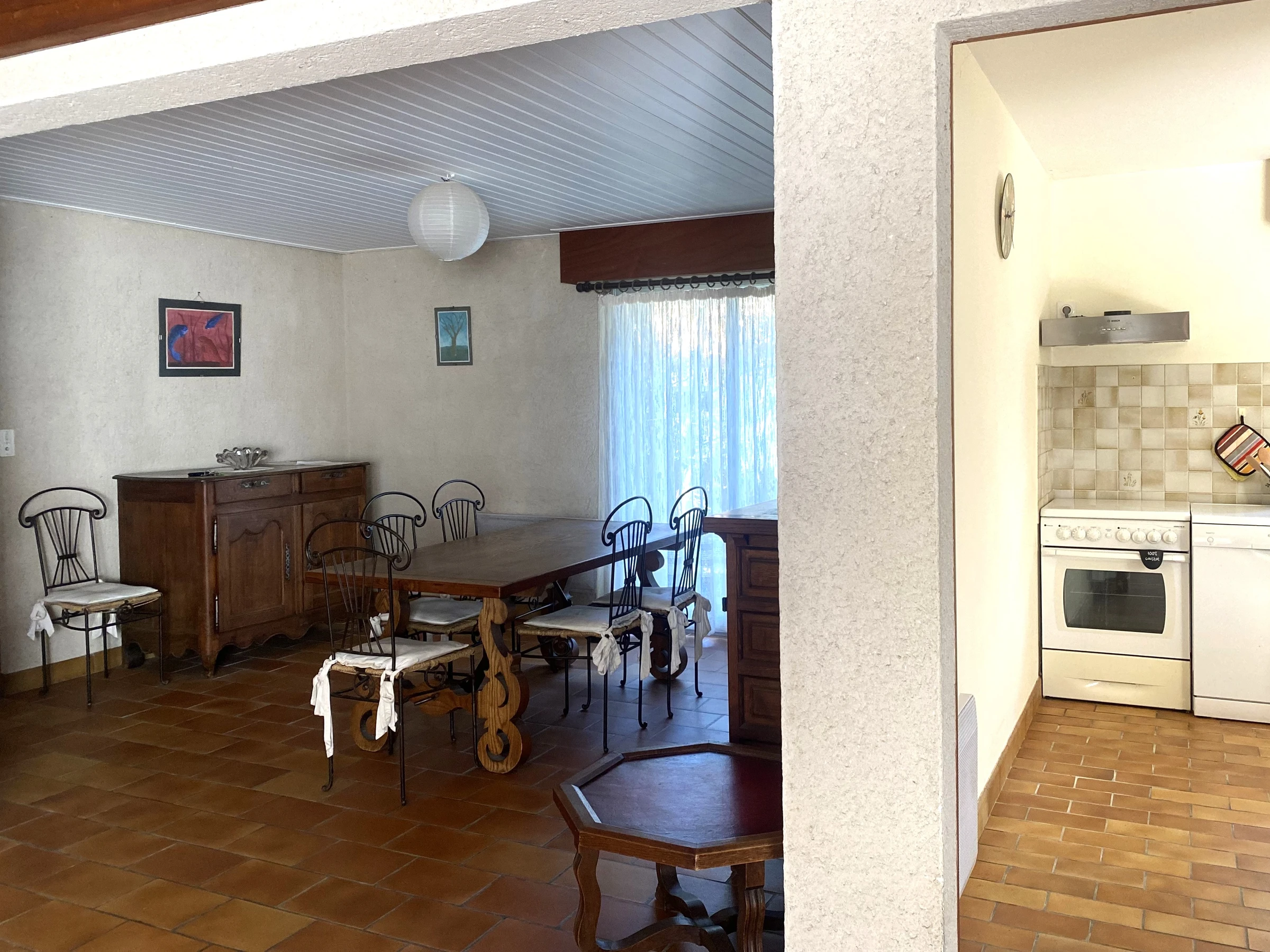 rez de chaussée : 1 salle à manger - salon, 1 cuisine donnant sur terrasse pour les repas sous préau et store banne. 1 salle d'eau (douche, lavabo) 1 wc séparé.