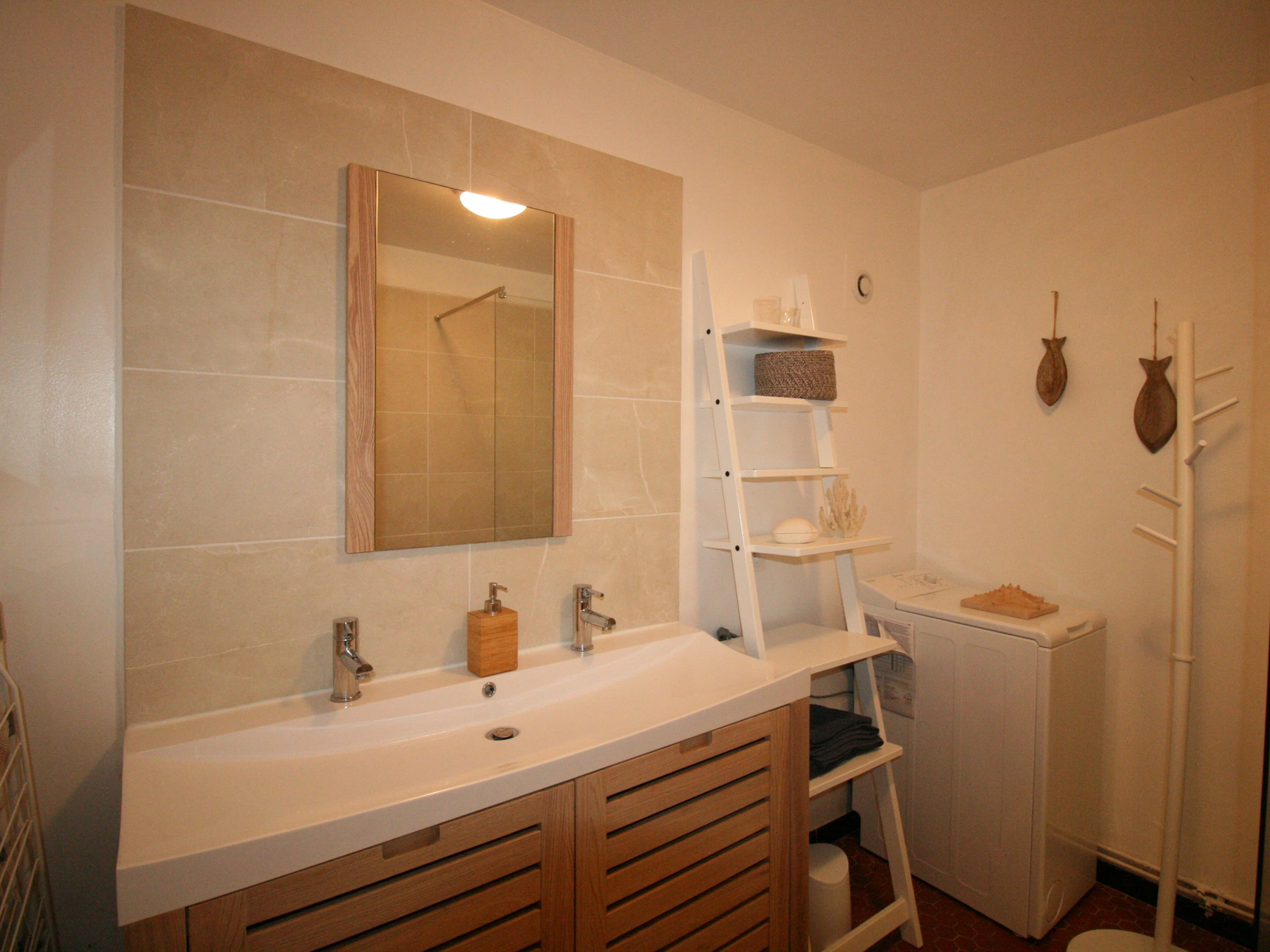 Equipements : 1 réfrigérateur - congélateur, 1 micro ondes, 1 caf. électrique, 1 four électrique, 1 lave vaisselle, 1 lave linge, 3 feux induction, vaisselle, couverts,