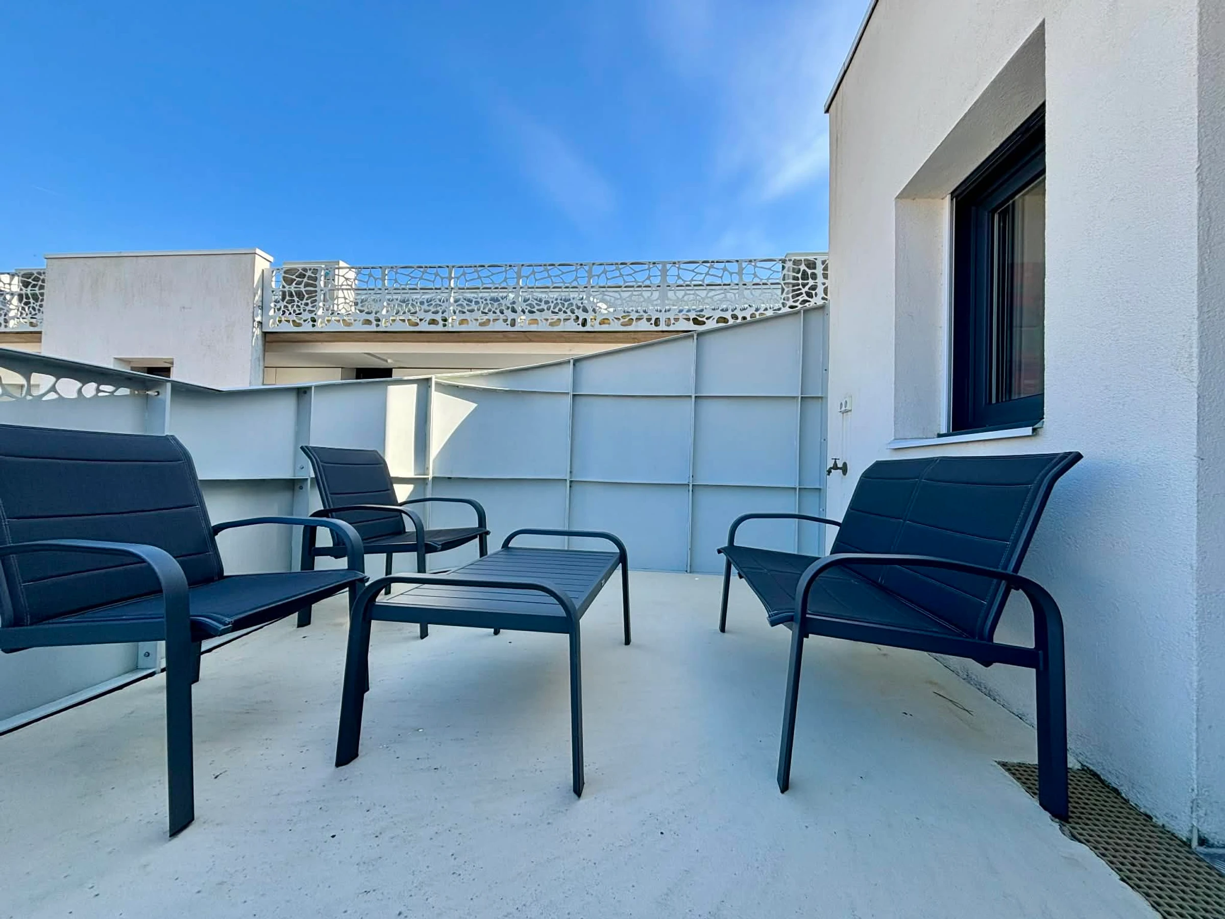 Balcon terrasse avec canapé, chilienne, table et chaises pour les repas.