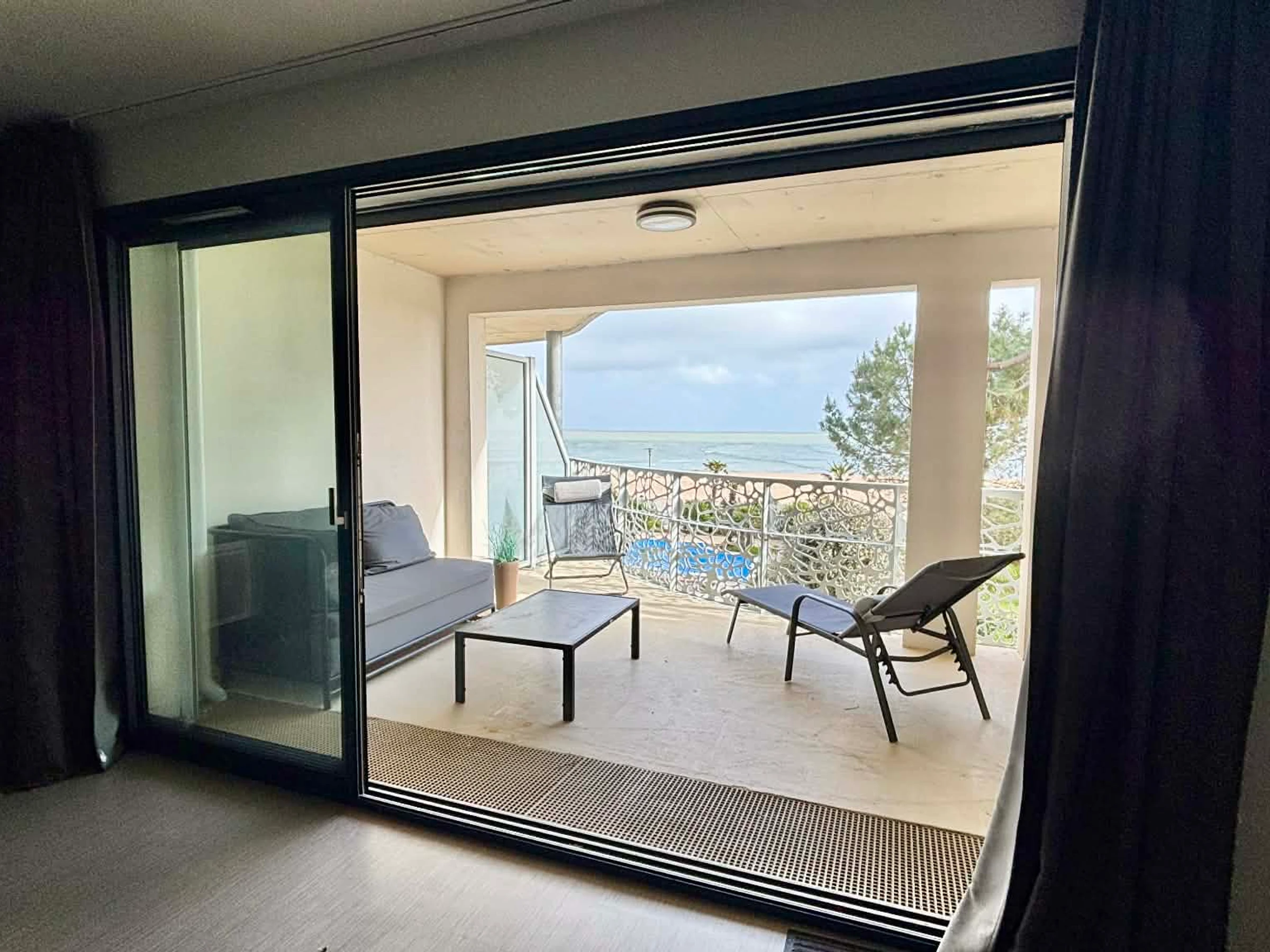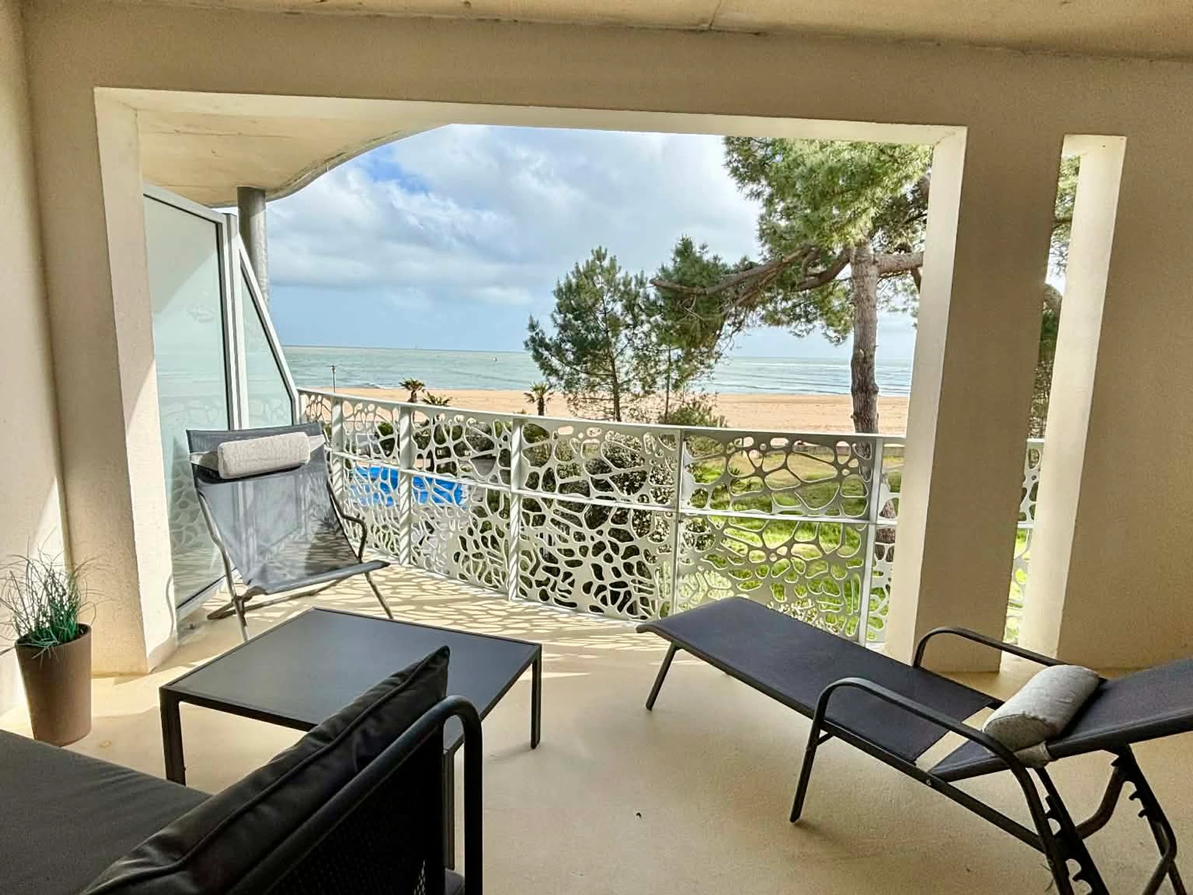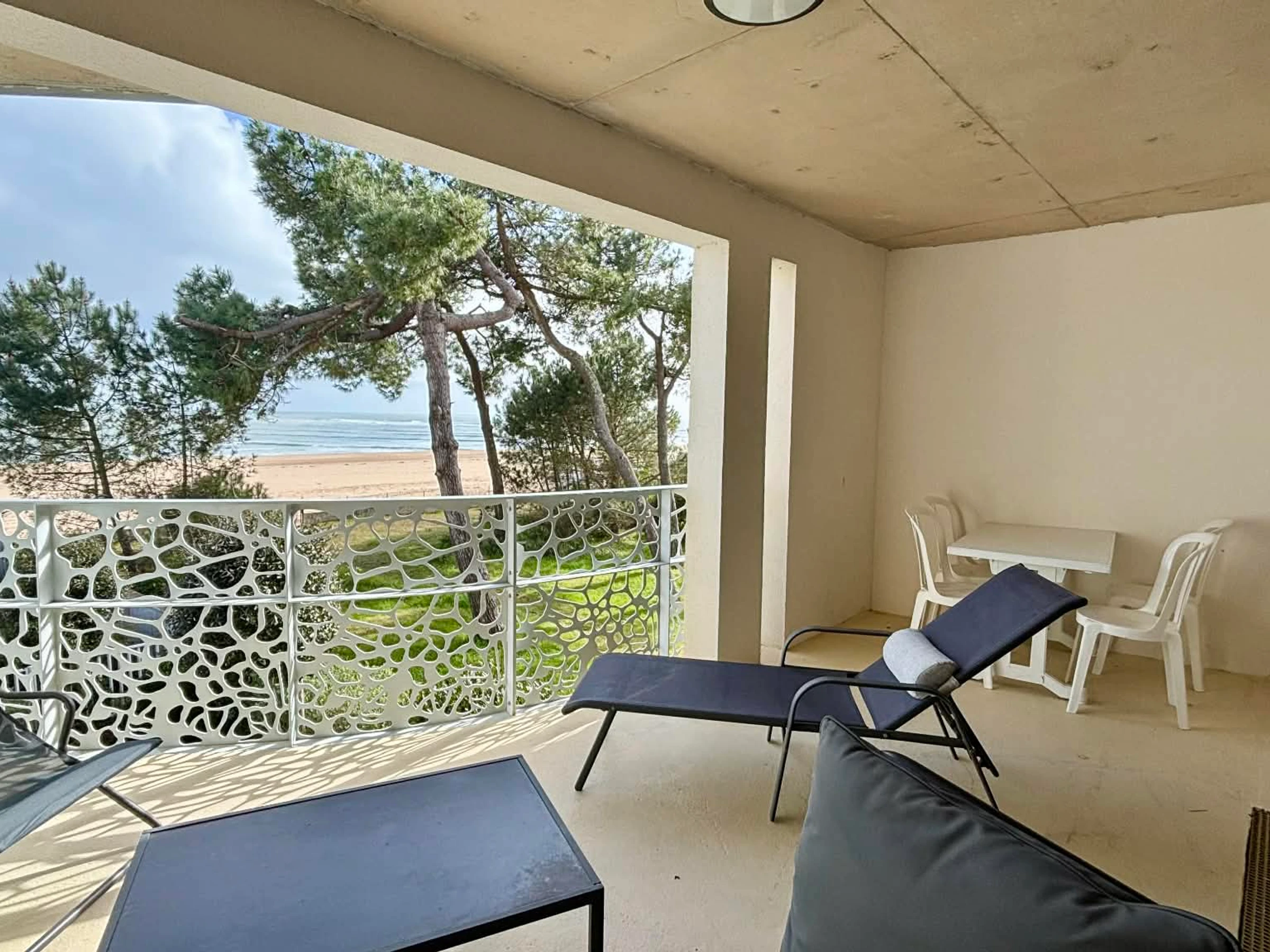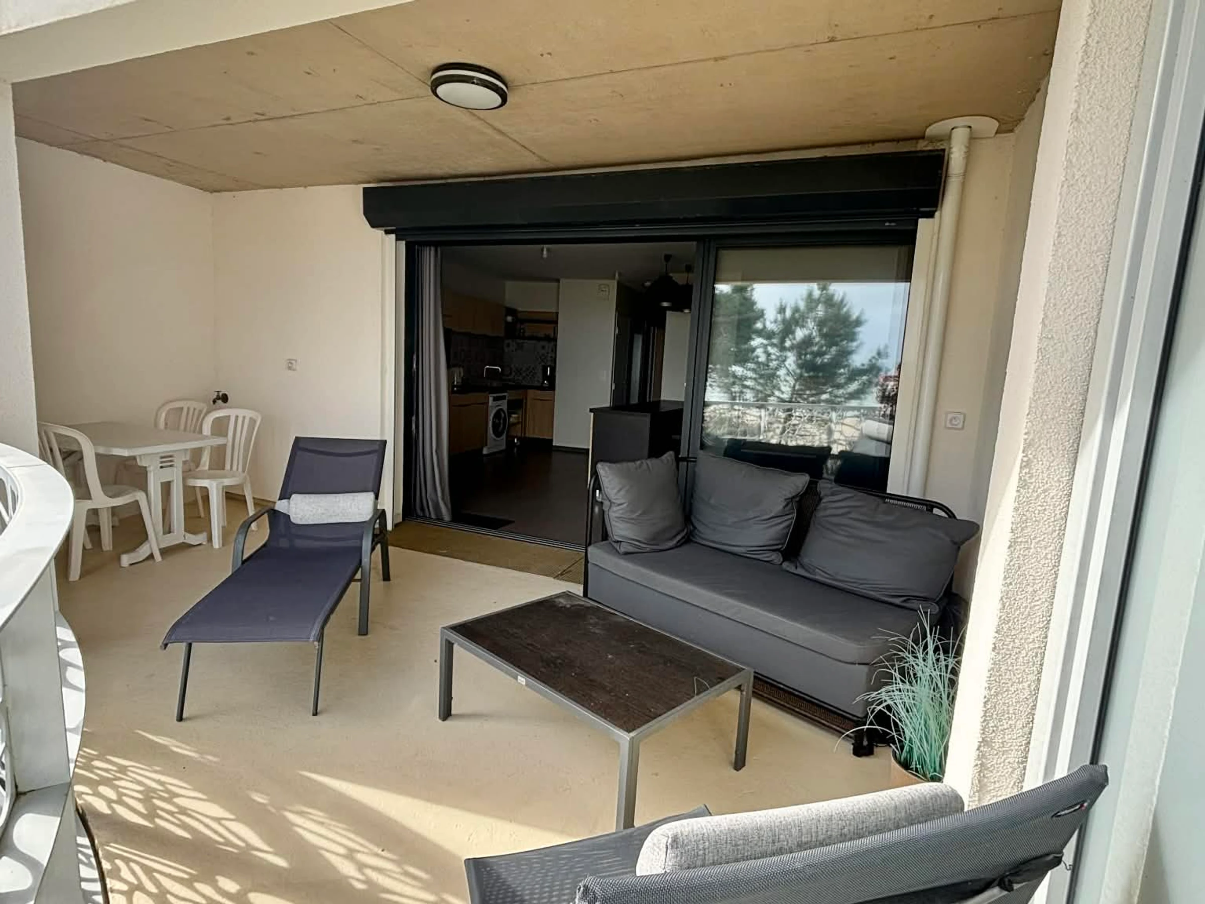 Balcon terrasse avec canapé, bain de soleil, table et chaises pour les repas.