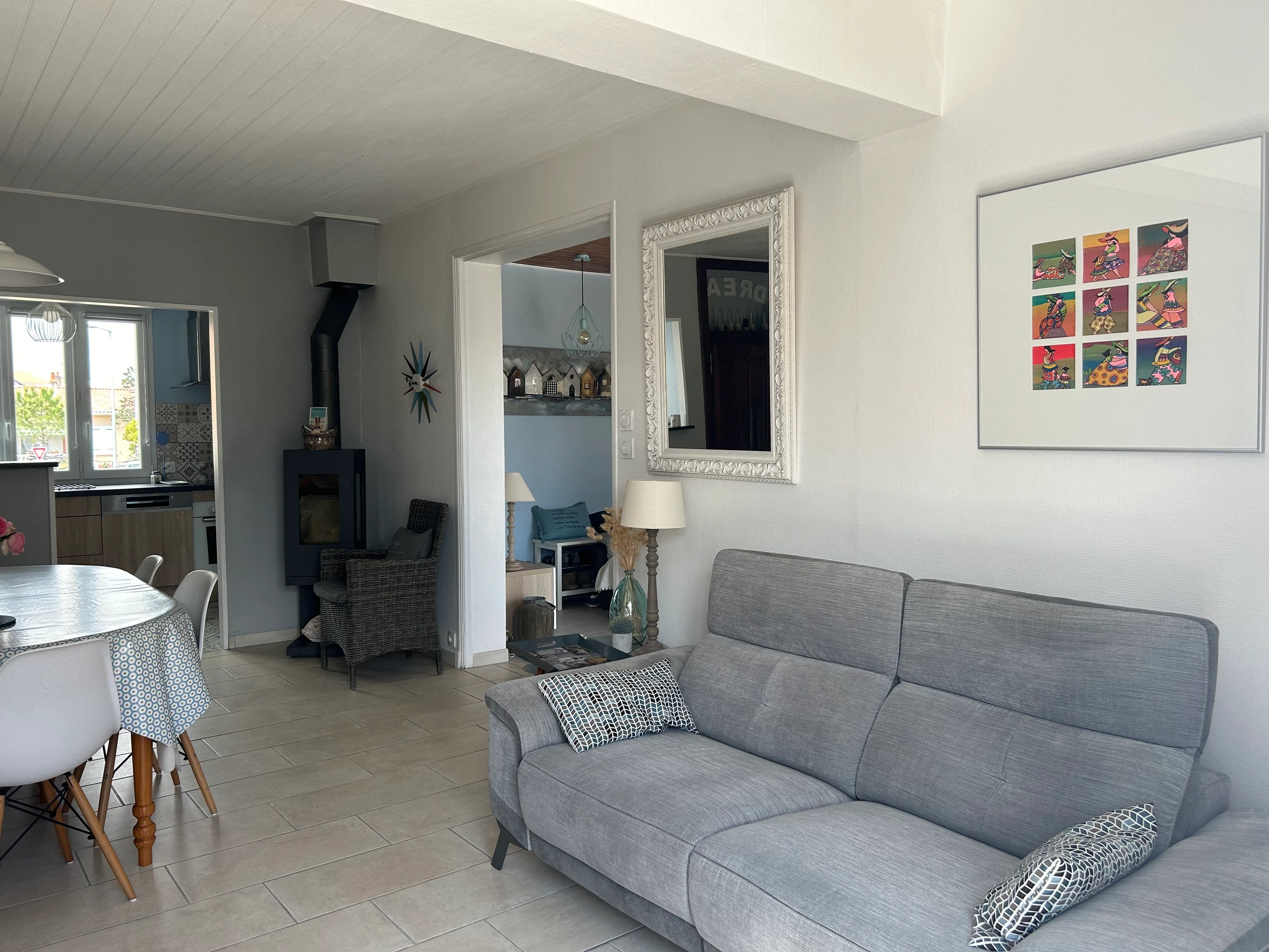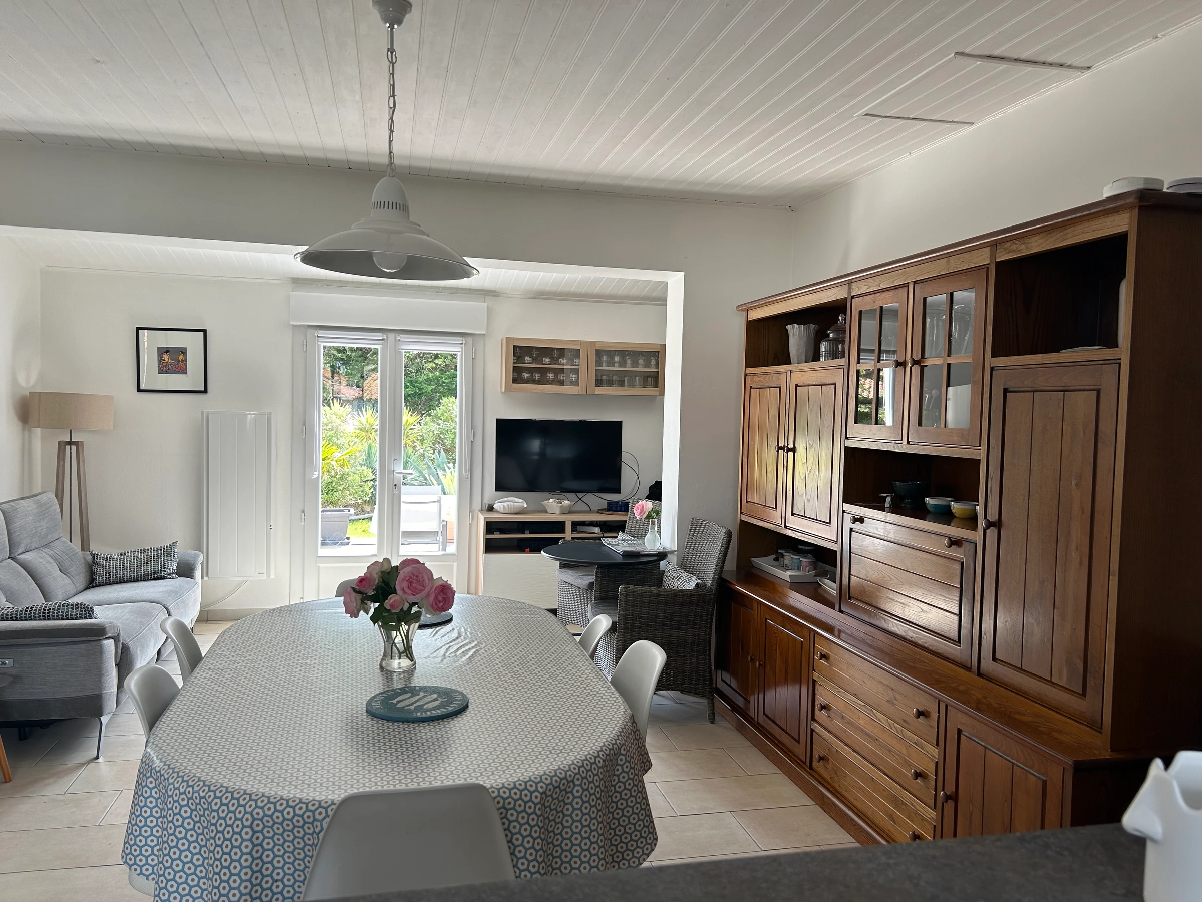 Equipements : télévision, wifi, réfrigérateur-congélateur, lave vaisselle, plaques induction, four, micro ondes, lave linge. Poêle en décoration, bouilloire, 1 fer à repasser, aspirateur,