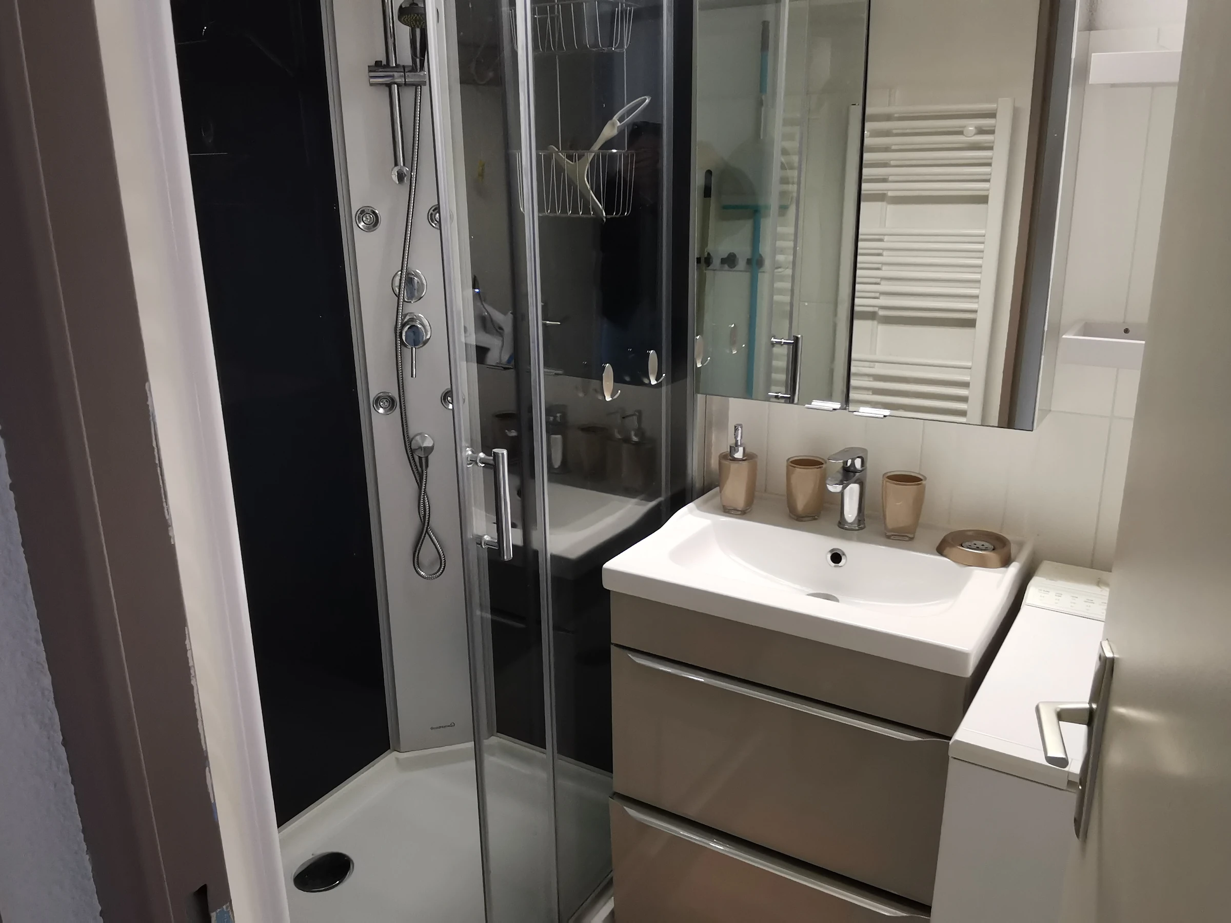 Une salle d'eau avec la machine à laver. WC séparé.