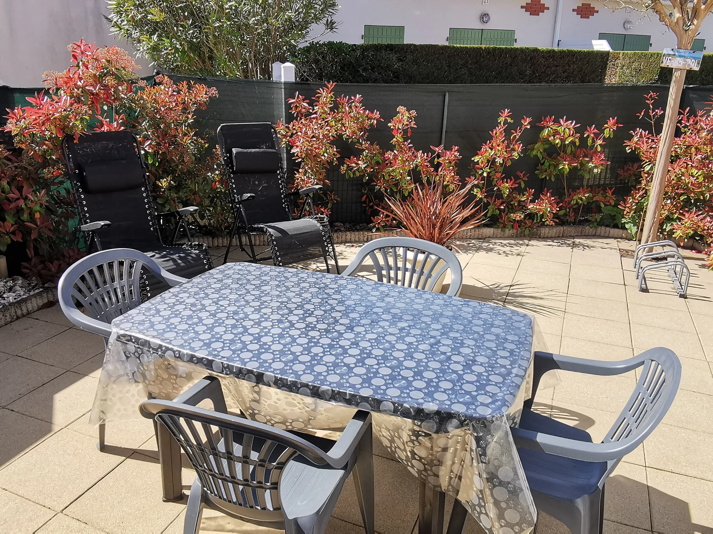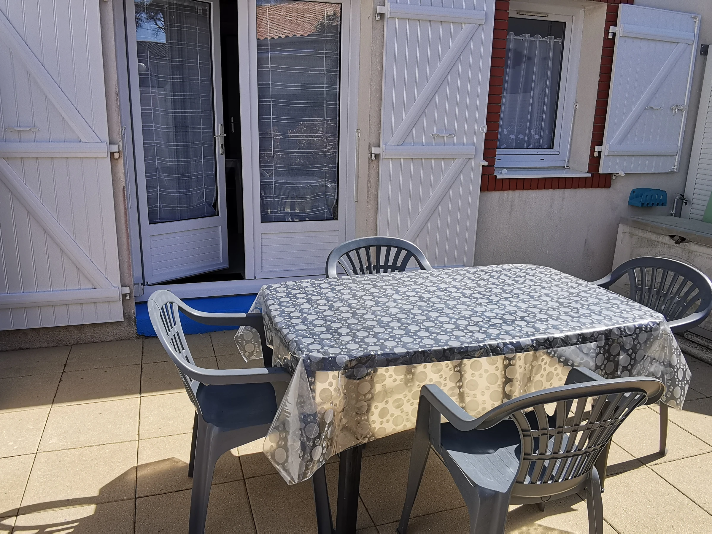 Petit extérieur avec une terrasse avec son mobilier de jardin, un store banne manuel.