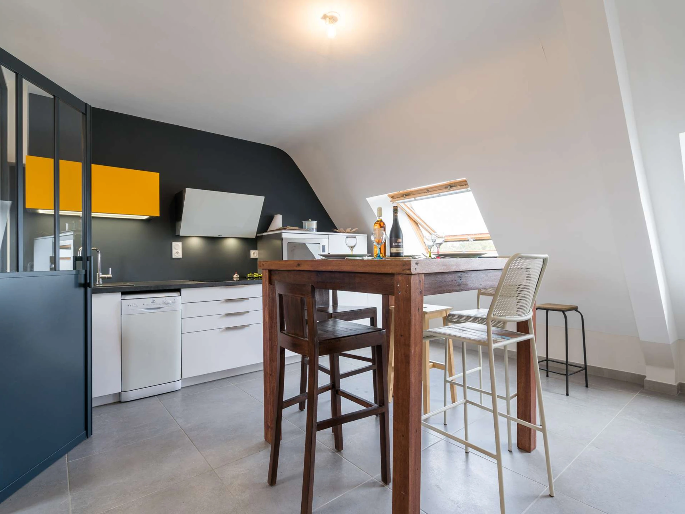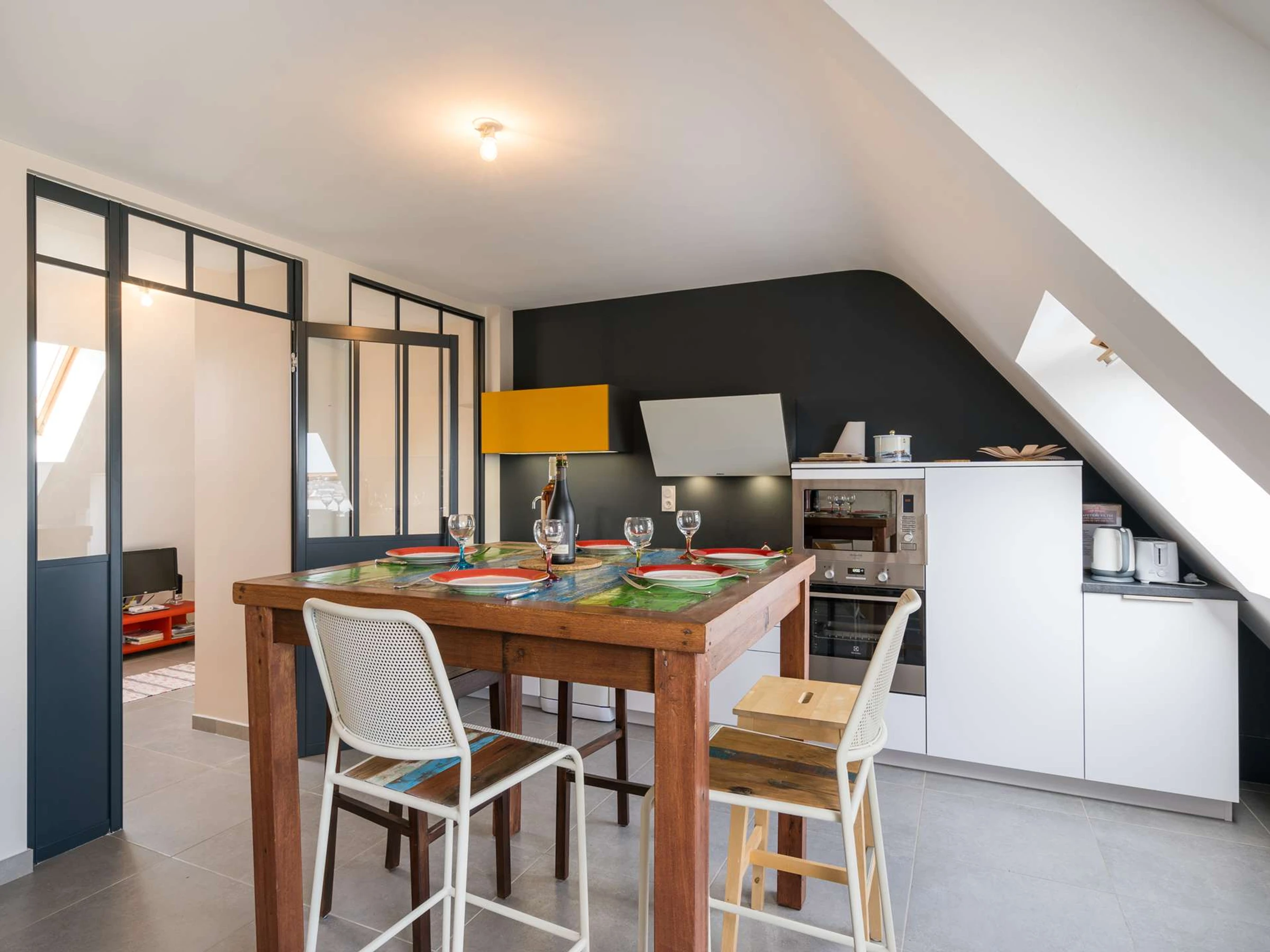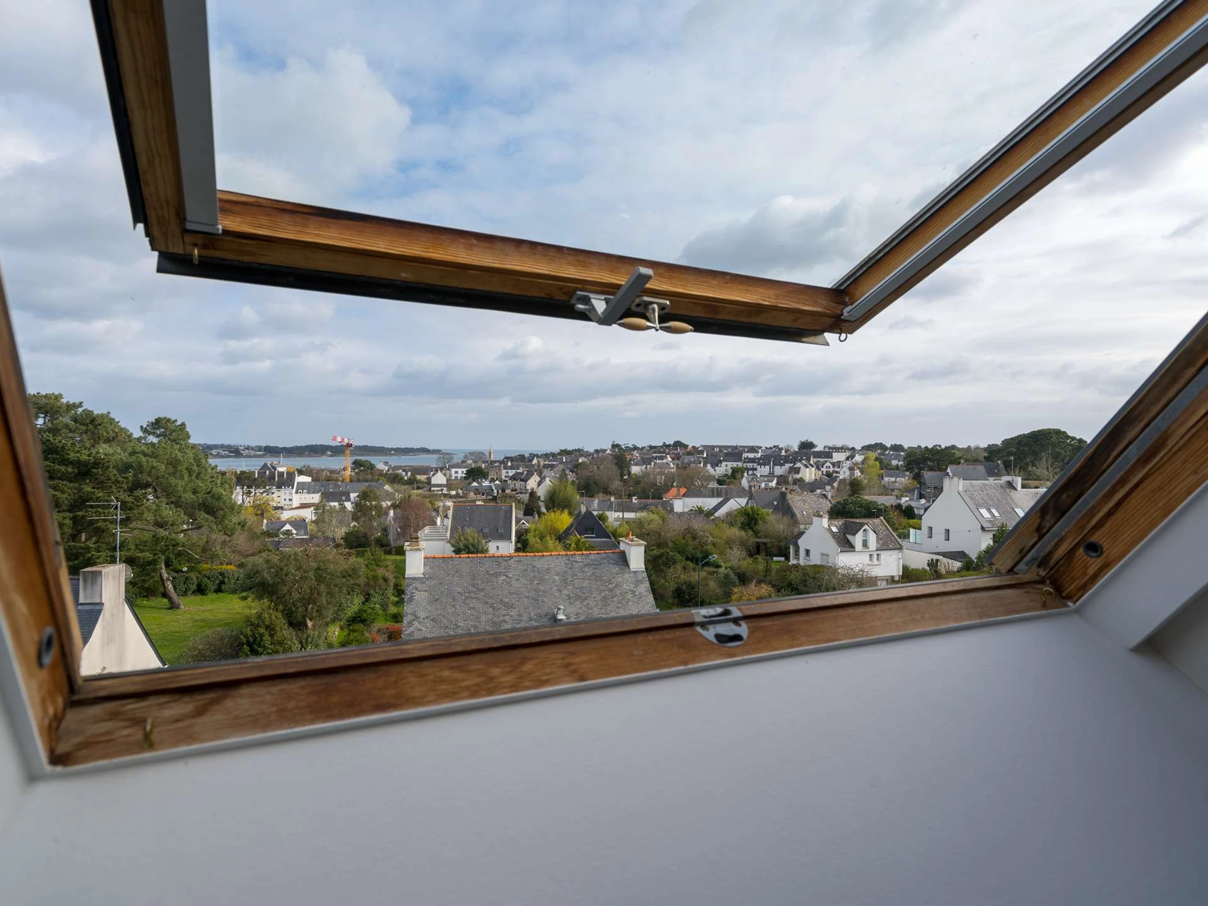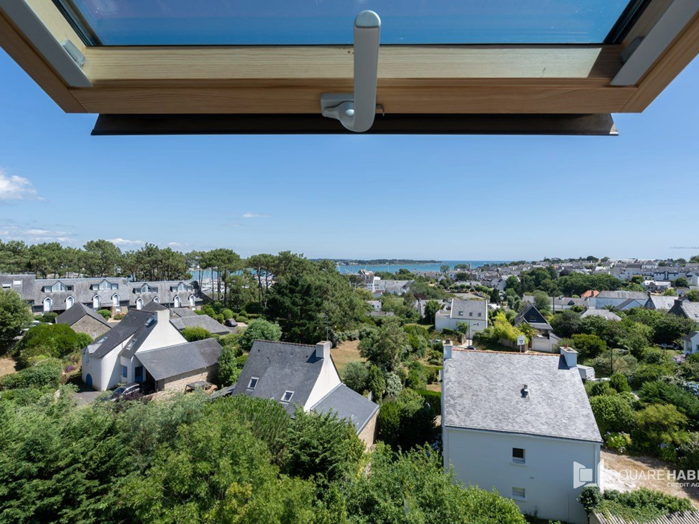 - Séjour avec partie repas (table et chaises hautes) offrant une vue surplombante de La Trinité Sur Mer par velux