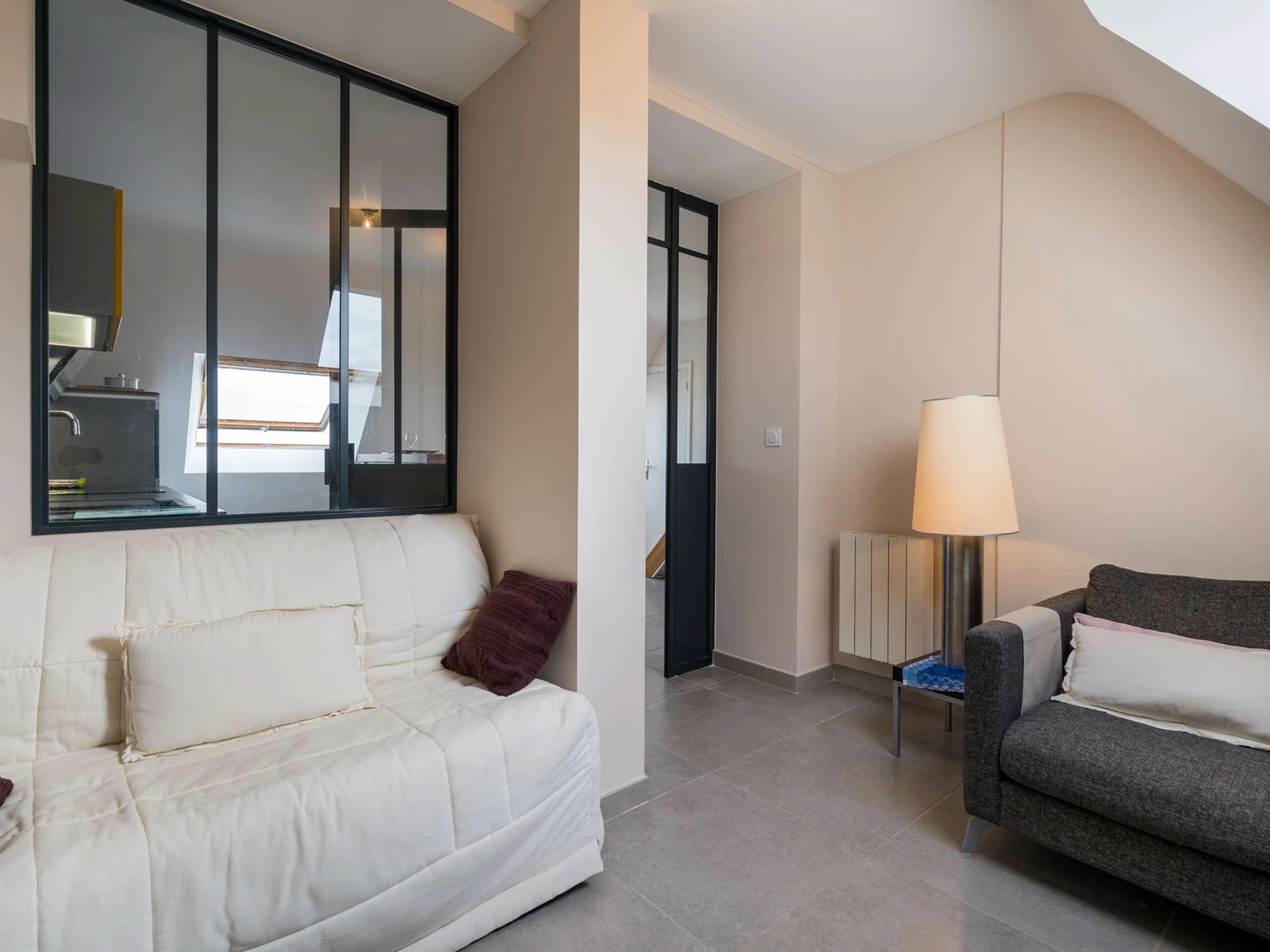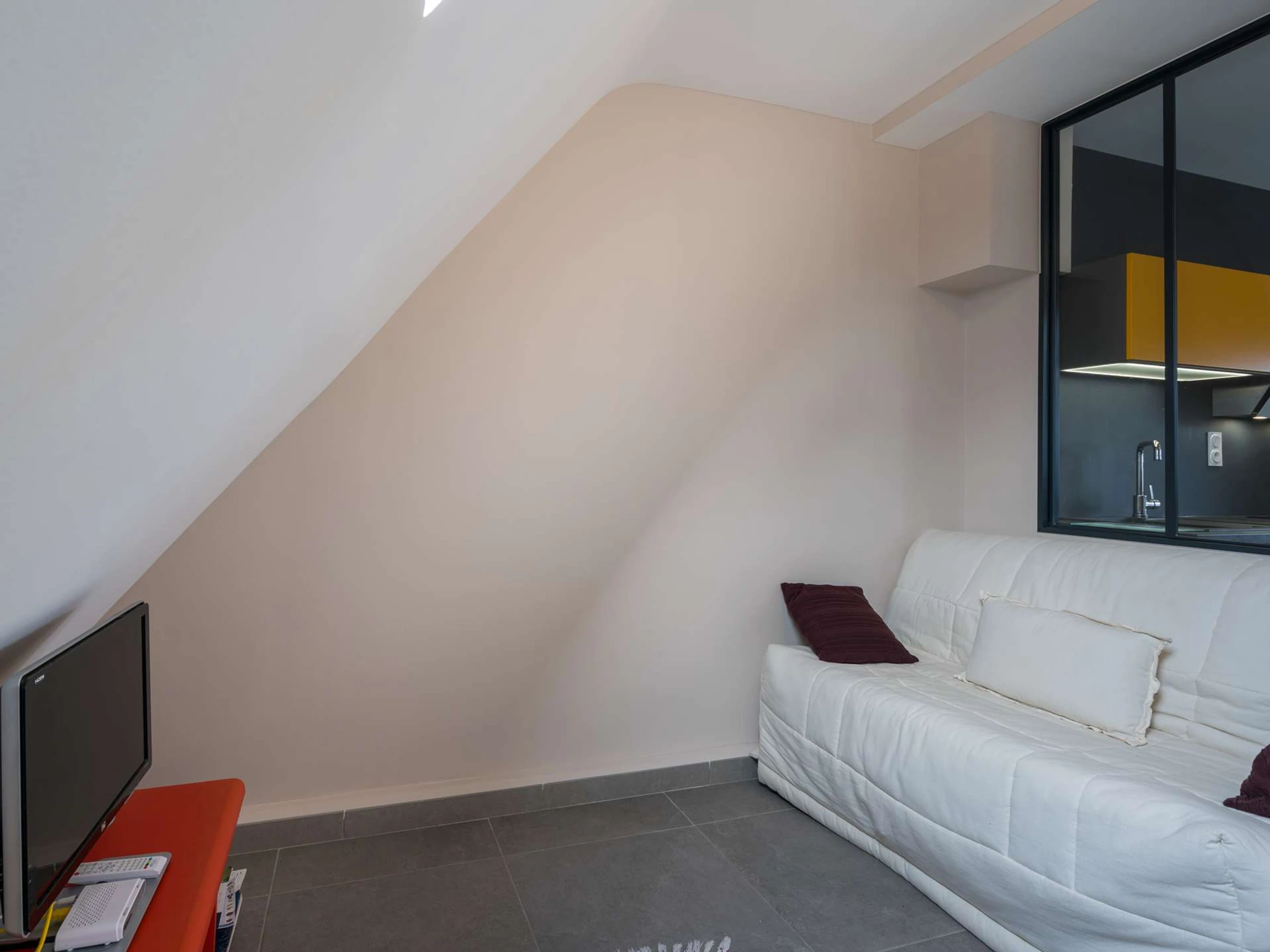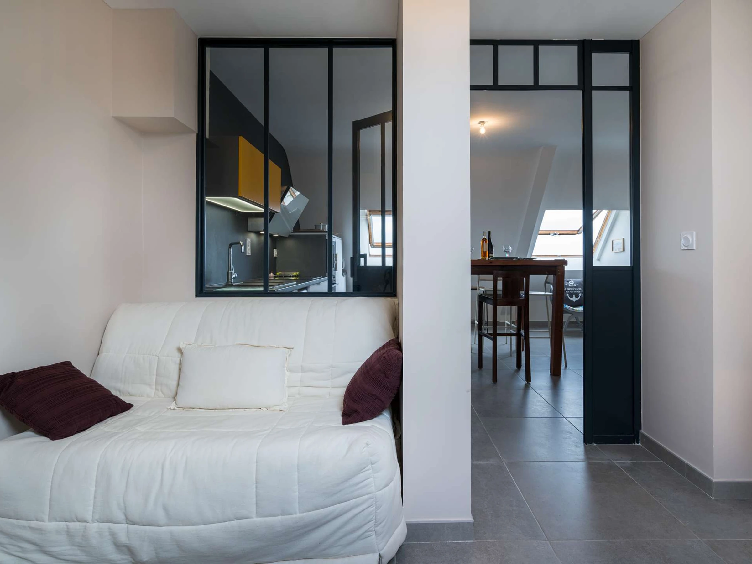 - Salon séparé par cloison vitrée style "atelier d'artiste" (TV, canapé BZ : couchage 2 personnes, couette)