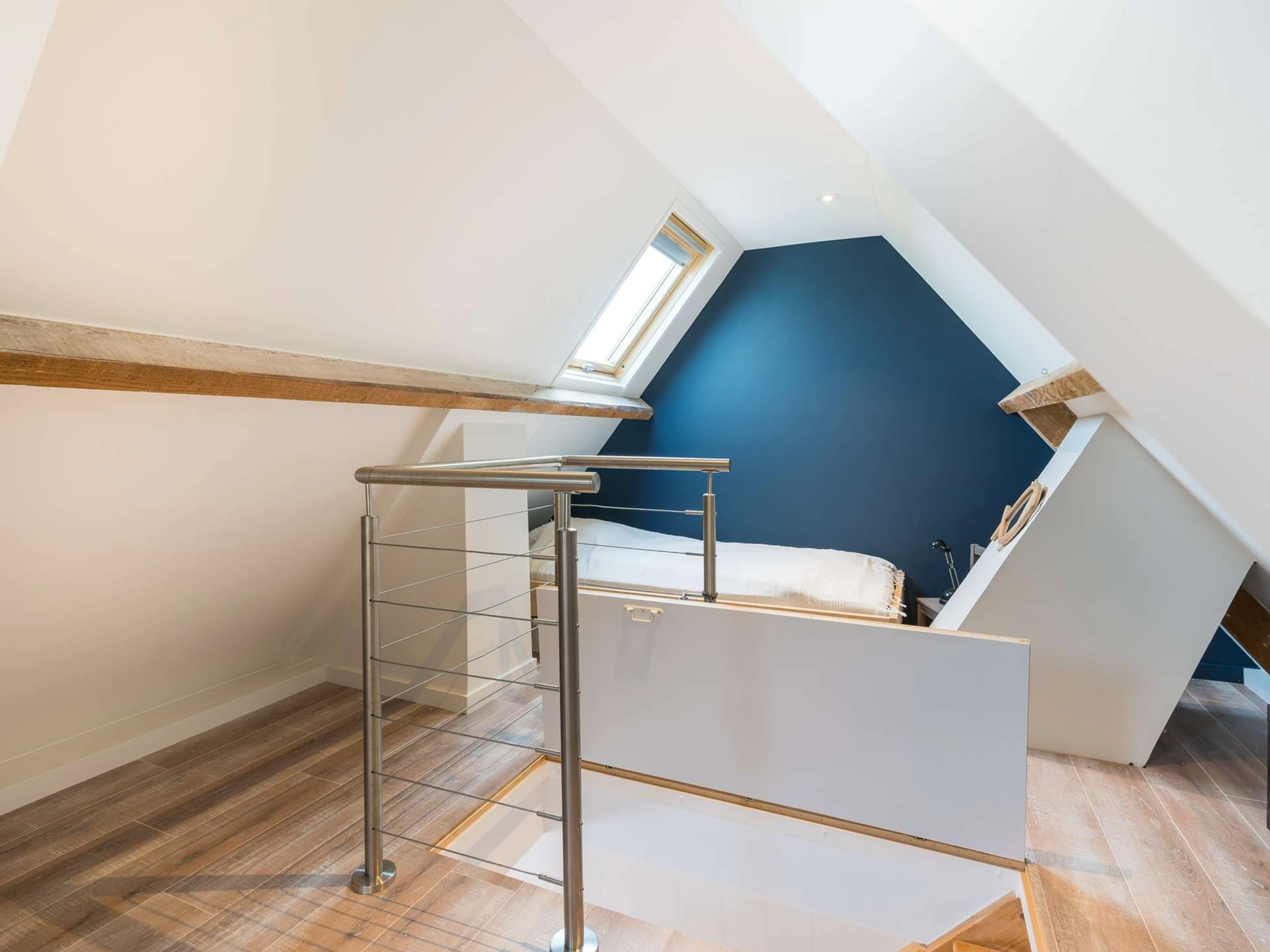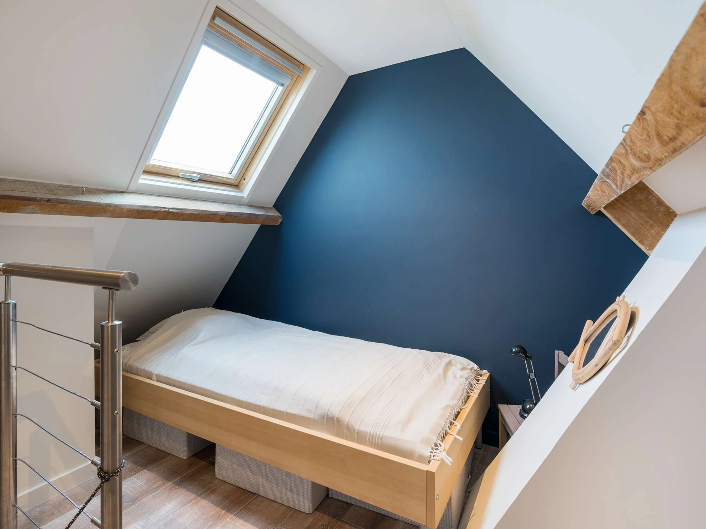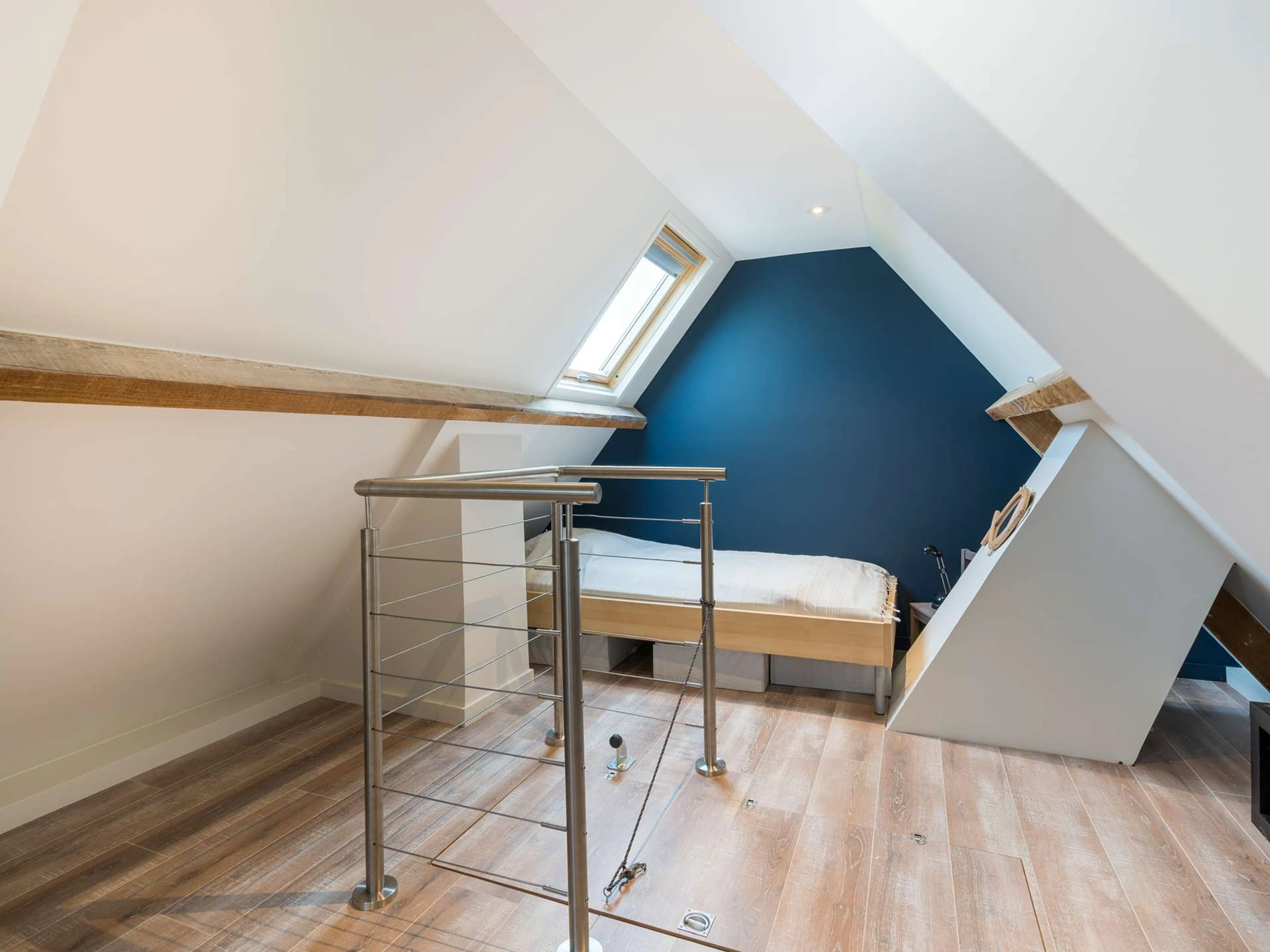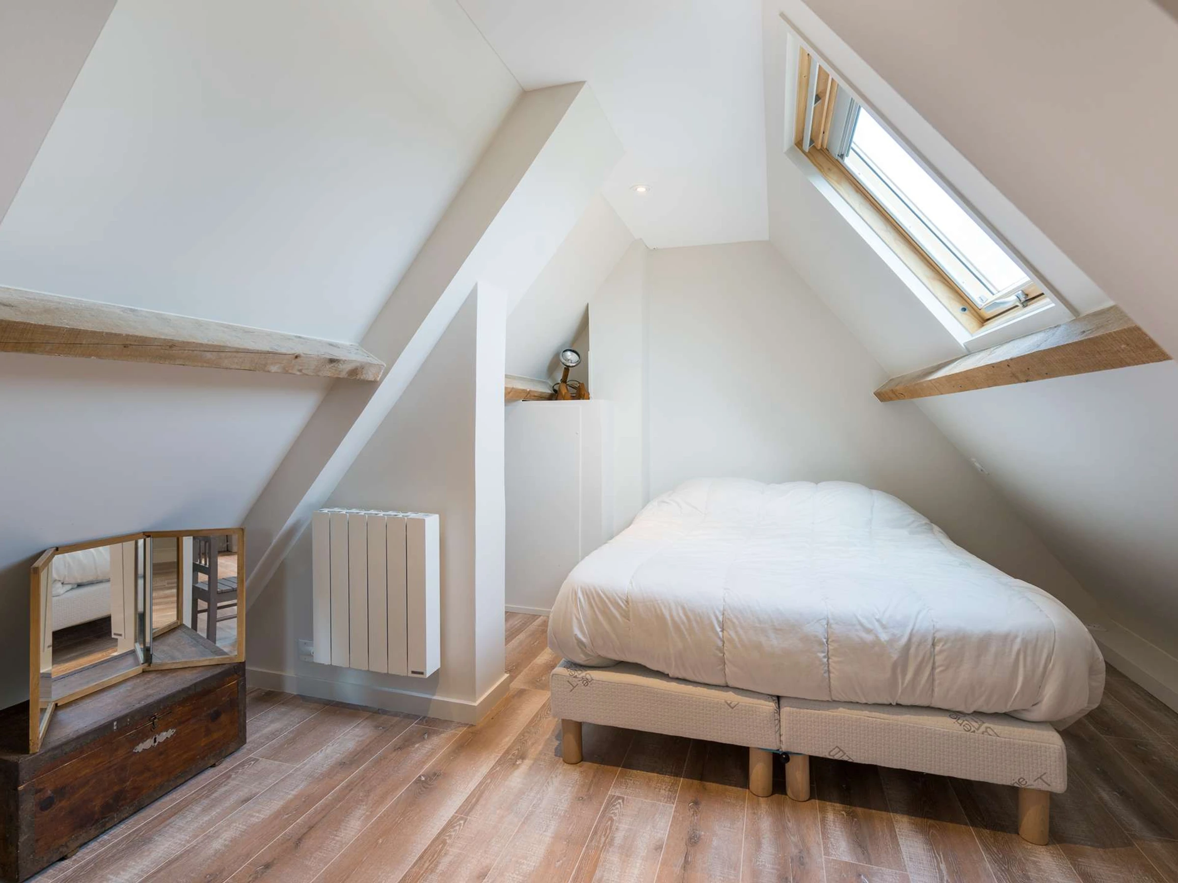 - 1 grande chambre mansardée avec 1 lit double (140, couette) et 1 lit individuel (90, couette)