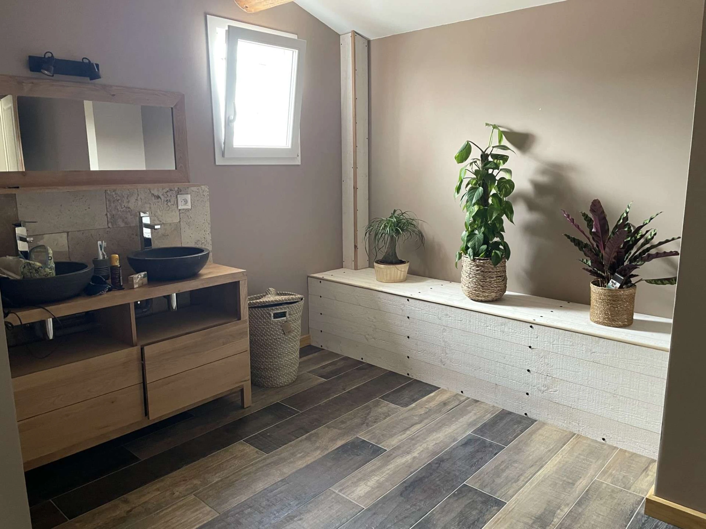 Vous retrouverez à l'étage deux chambres avec un lit en 160 ainsi qu'une salle de bain (douche et baignoire), un WC indépendant et deux terrasses.