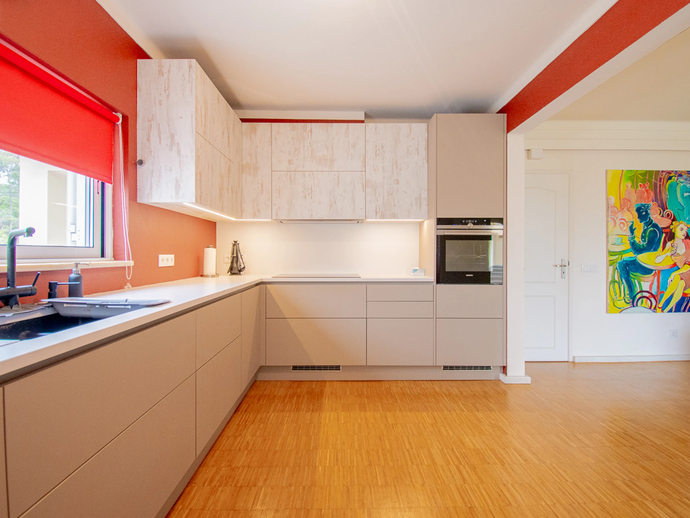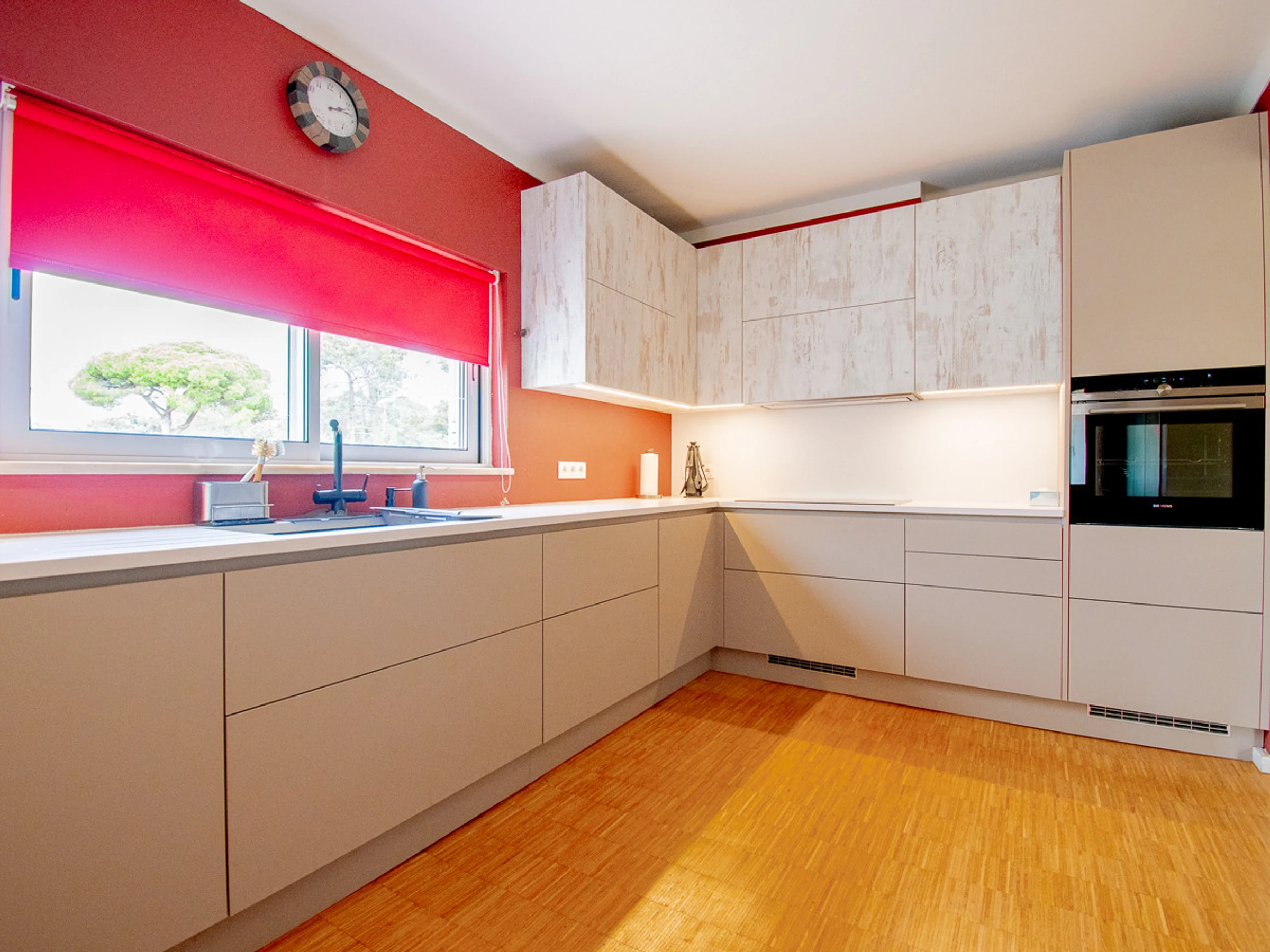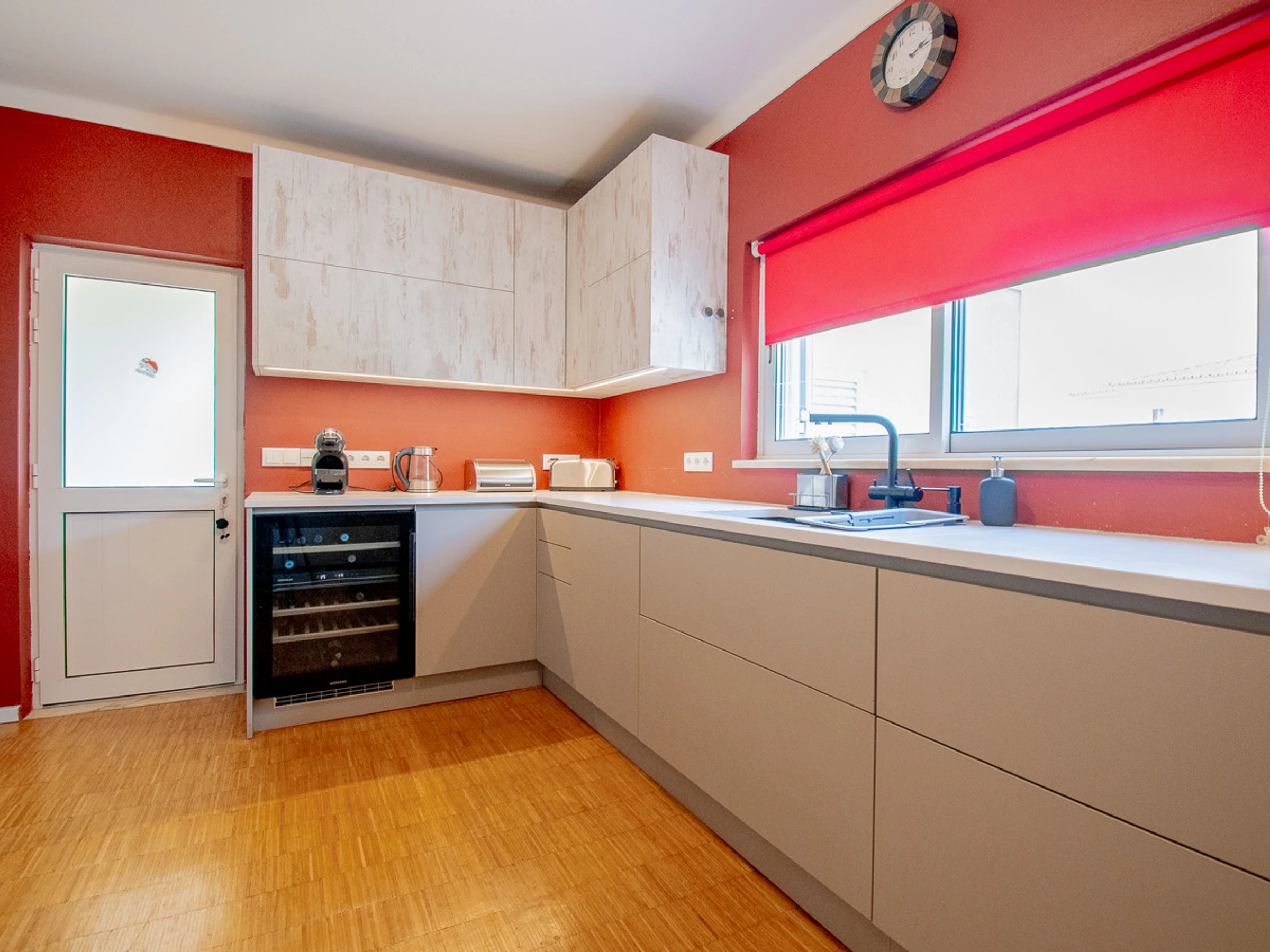 La cuisine américaine, à induction, est équipée avec réfrigérateur, micro-ondes, four, congélateur, lave-vaisselle, vaisselle/couverts, ustensiles/cuisine, cafetière, grille pain, bouilloire et presse-agrumes.