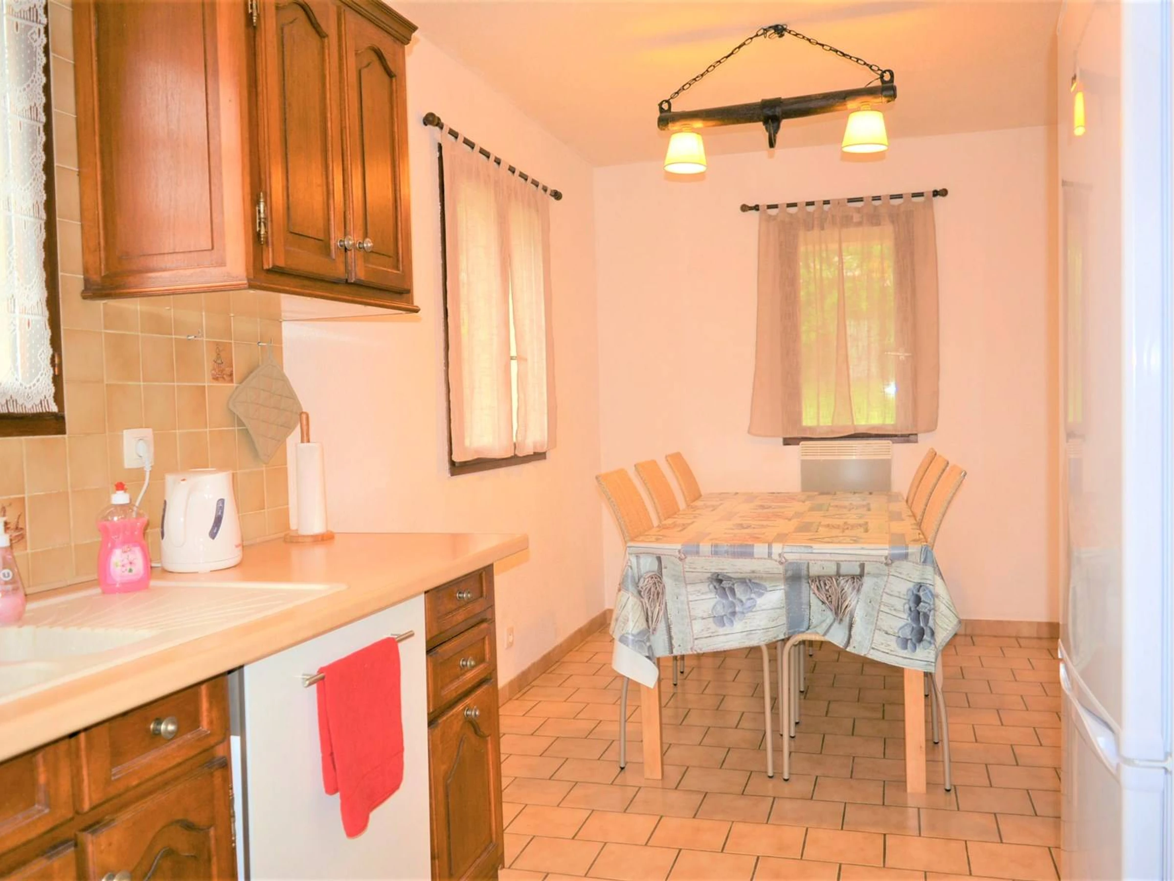 La maison se compose en rez-de-chaussée d'un séjour, d'une cuisine équipée avec un coin repas, de deux chambres avec lit en 140, d'une salle d'eau et d'un WC.