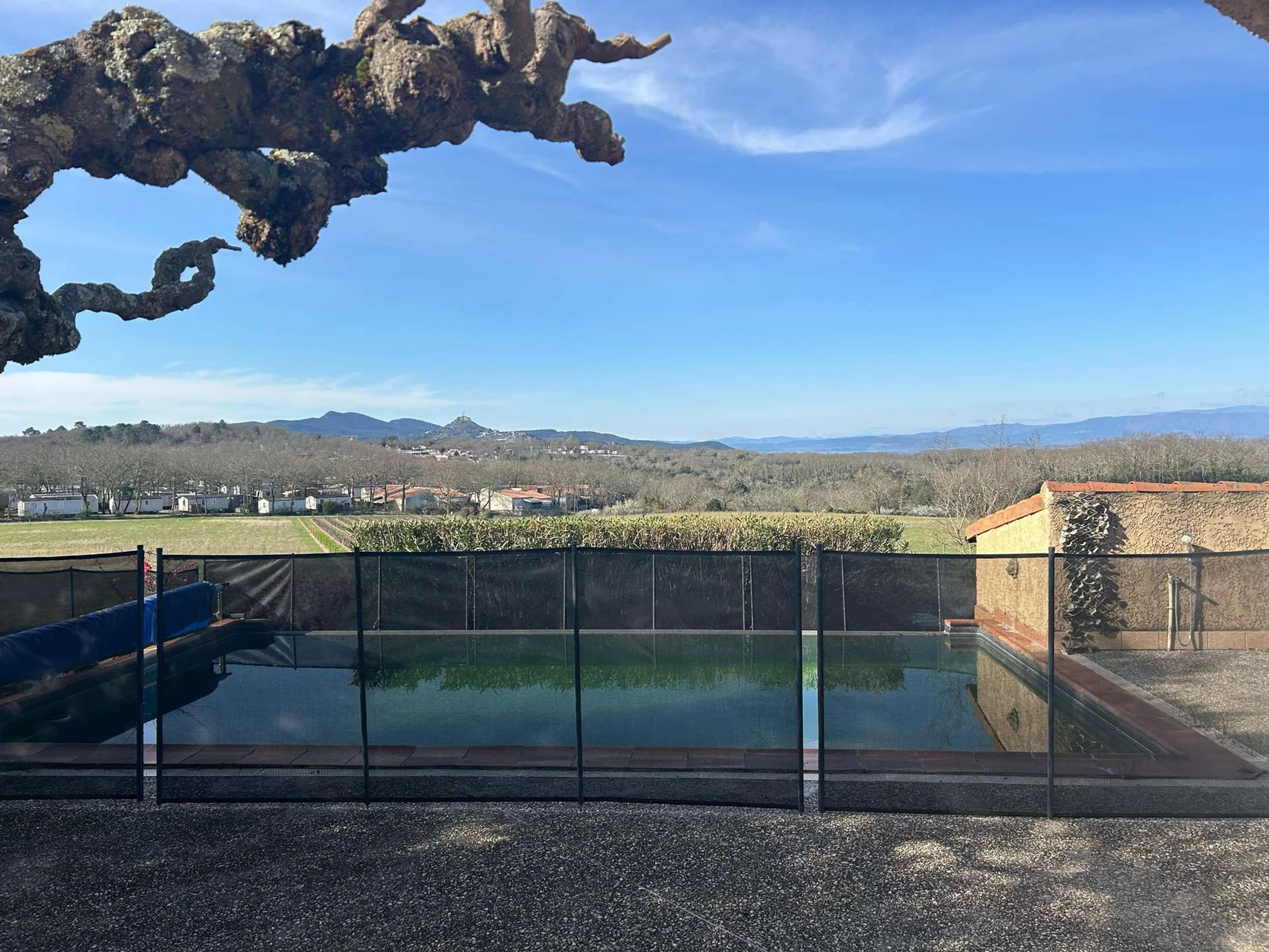 Vous pourrez profiter d'une piscine privative (8x4, profondeur 1m40 à 1m60) sécurisée par des barrières, d'une terrasse avec une vue dégagée et d'un jardin d'environ 1200 m².