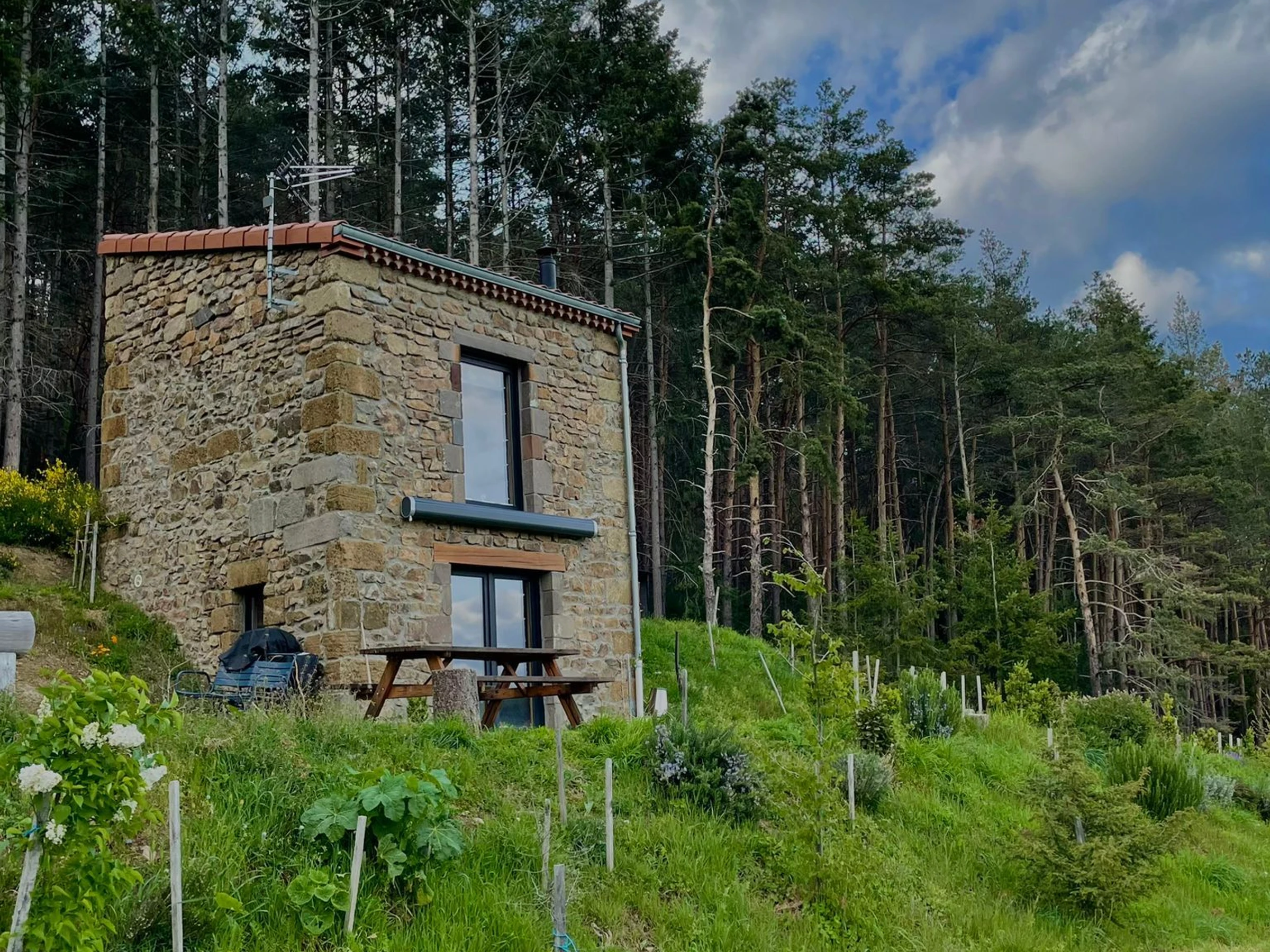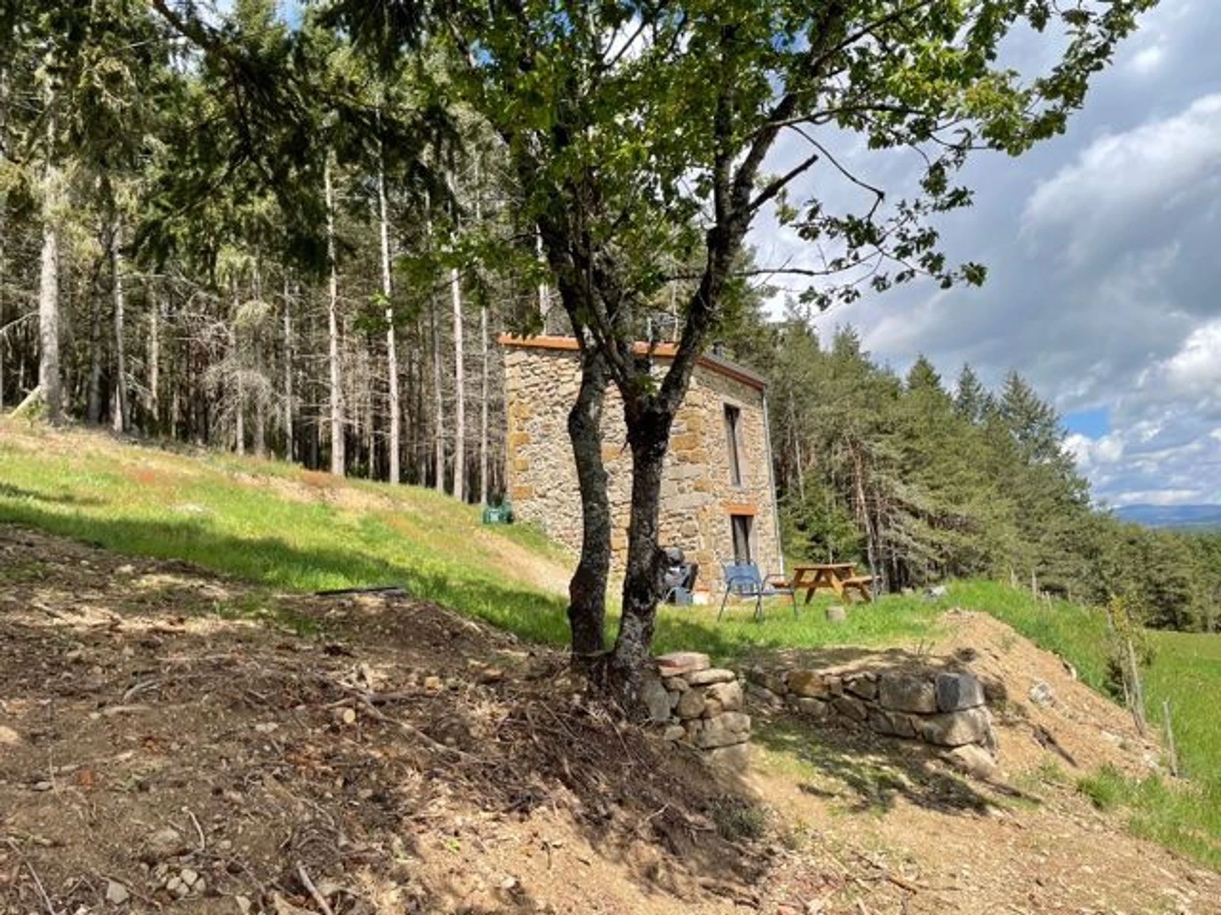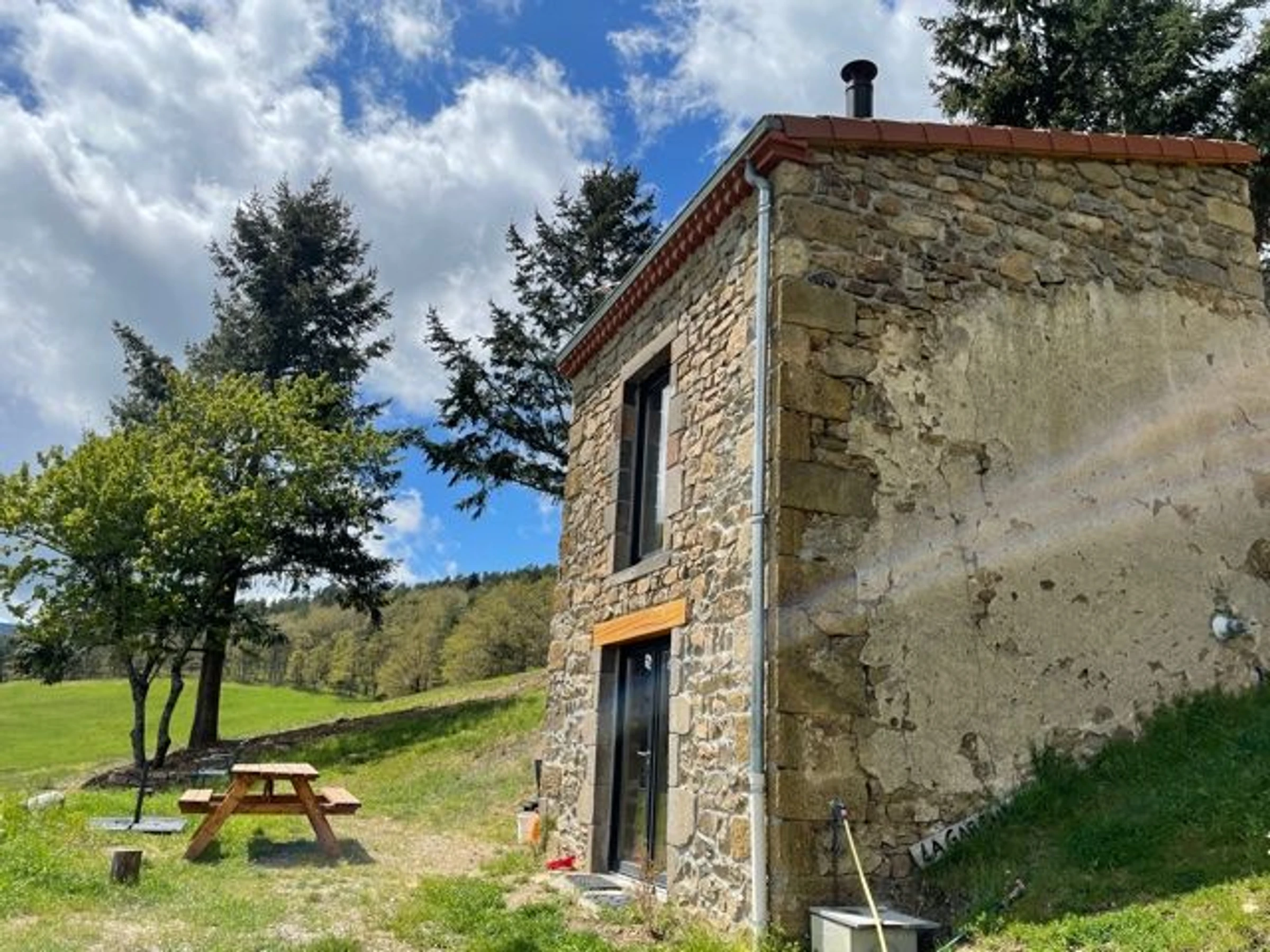 Un peu plus loin : le village de Saugues peuplé de légendes, Brioude et sa basilique classée monument historique, la ville du Puy en Velay et ses nombreux monuments classés au patrimoine Mondial de l'UNESCO... Sur environ 3 Ha de terrain cette ancienne maison de vignes dont le rez de chaussée est aménagée en salon avec espace kitchenette. A l'étage, une chambre équipée de deux couchages, (dont un en mezzanine, hauteur sous plafond 1m) et d'une cabine de douche avec accès direct sur l’extérieur. Toilettes sèches à une vingtaine de mètre de la maison.