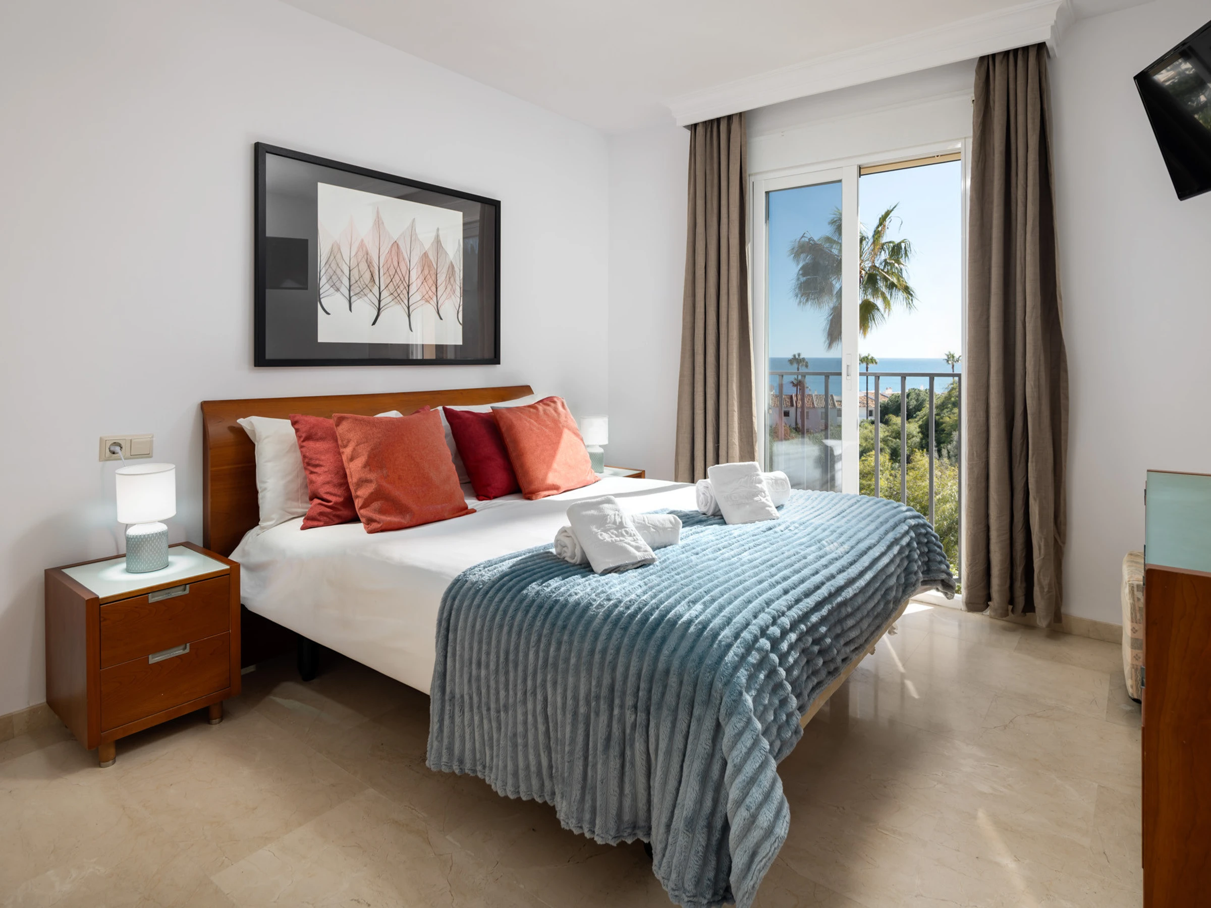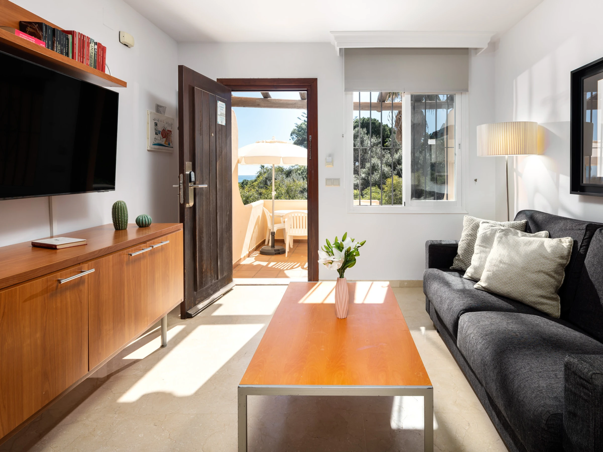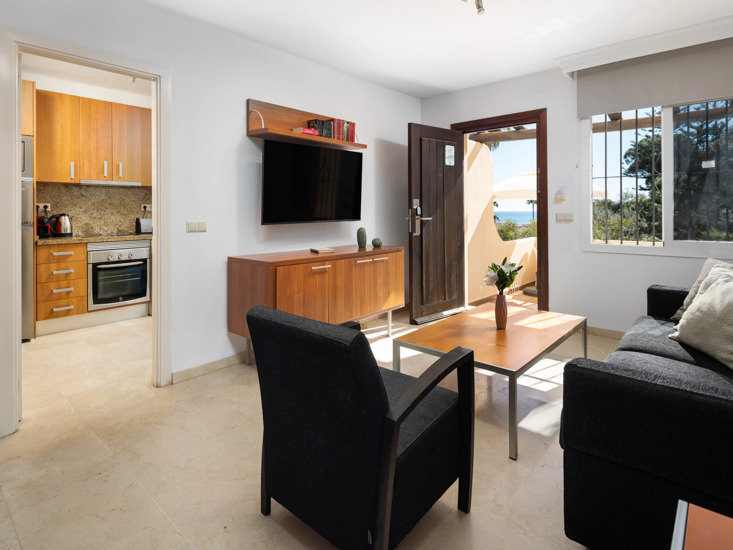 Logement de 92 m² meublé avec goût et totalement équipé, avec vue sur la mer et le jardin.