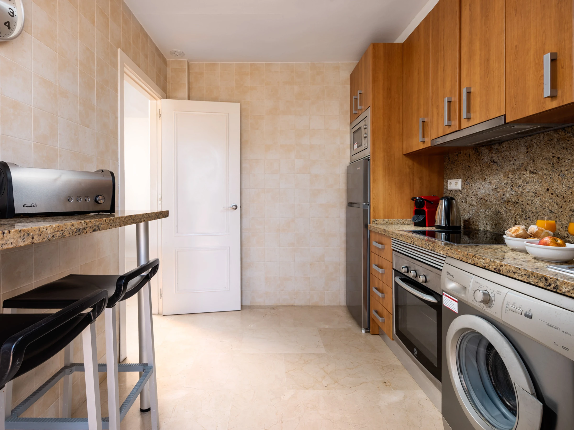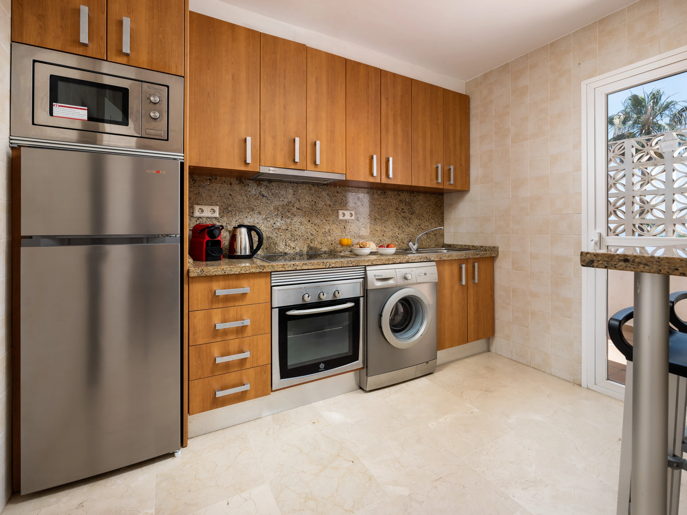La cuisine indépendante, à vitrocéramique, est équipée avec réfrigérateur, micro-ondes, four, congélateur, vaisselle/couverts, ustensiles/cuisine, cafetière, grille pain, bouilloire et presse-agrumes.