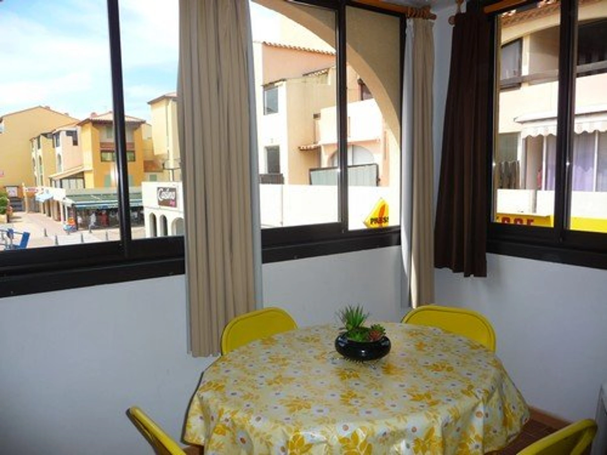 Studio Cabine + loggia fermée, composé d’un séjour/salle à manger avec un BZ (couchage 2 personnes) et TV. Un coin cuisine équipée : 4 plaques de cuisson, four, four micro-ondes, frigo congélateur, cafetière, nécessaire vaisselle et Lave linge. Un coin cabine avec lits en 90 superposés (2 couchages). Une salle de bain avec baignoire sabot et WC. Terrasse/loggia avec meubles pour coin repas. Accès direct à la plage et Equipé pour 4 personnes. L’appartement donne au dessus des commerces de la place du Tertre, animée en période estivale. A proximité : restaurants, snacks, commerces, pharmacie. Parking public et gratuit