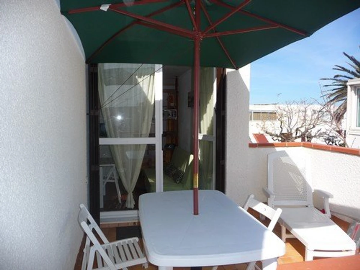 Au 1er et dernier étage : Studio Cabine d'environ 20m² avec chambre ouverte, aménagement agréable: séjour/salle à manger avec clic clac. Cuisine ouverte (deux plaques de cuisson (à gaz), micro-ondes, mini four, frigo/congélateur, lave linge). Une chambre ouverte avec lit 2 personnes et TV. Salle d'eau avec douche et WC. Terrasse de 9m² exposée plein sud avec meubles de jardin et barbecue électrique. Equipé pour 4 personnes (idéal 2 adultes et 2 enfants).Linge de maison et draps non fournis. Ménage de fin de séjour non inclus, prestation en supplément).