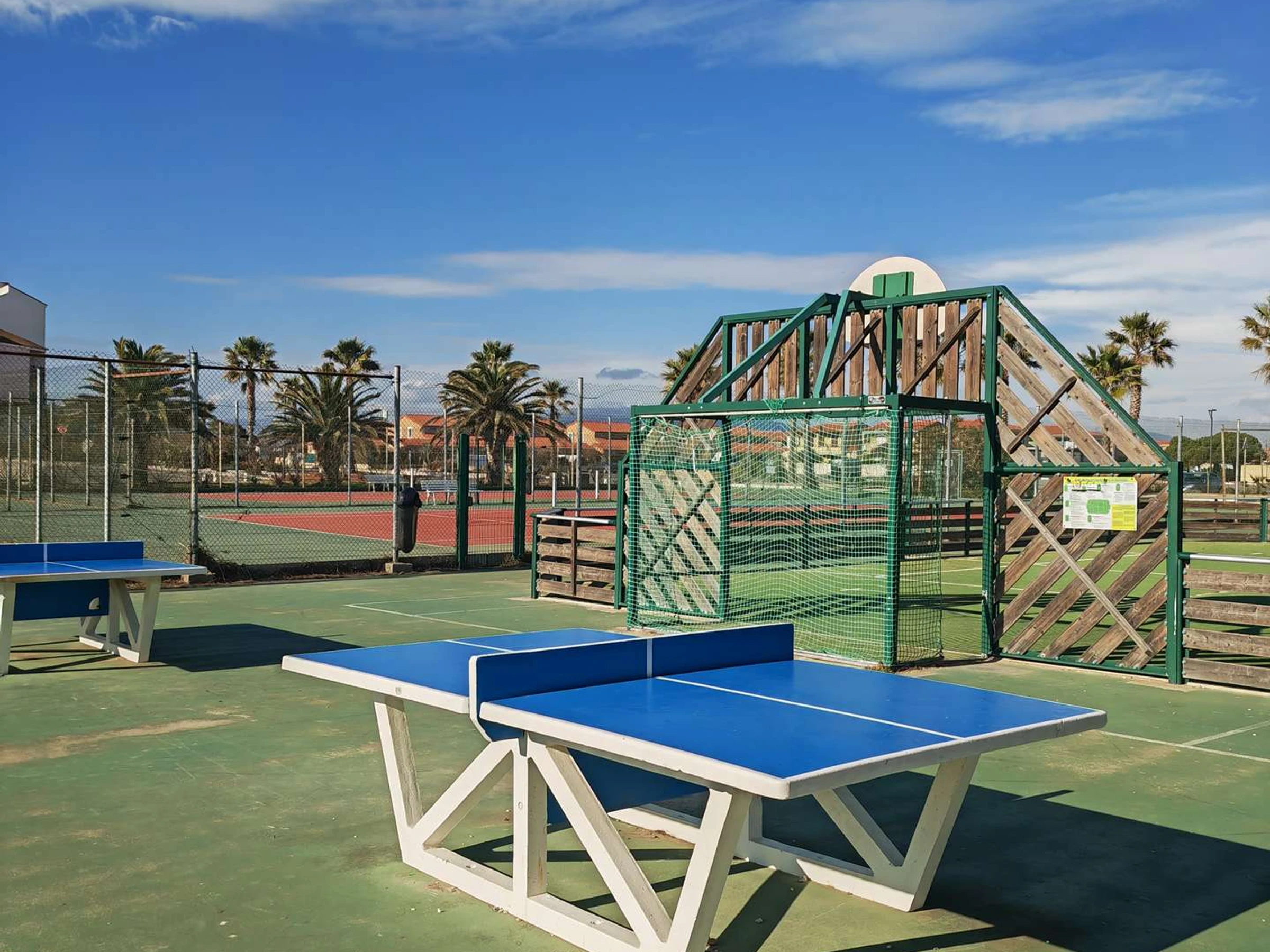 différents terrains de sport : terrain multisports, basket ball, terrains de tennis, terrains de pétanque ainsi qu'un demi terrain de football engazonné.