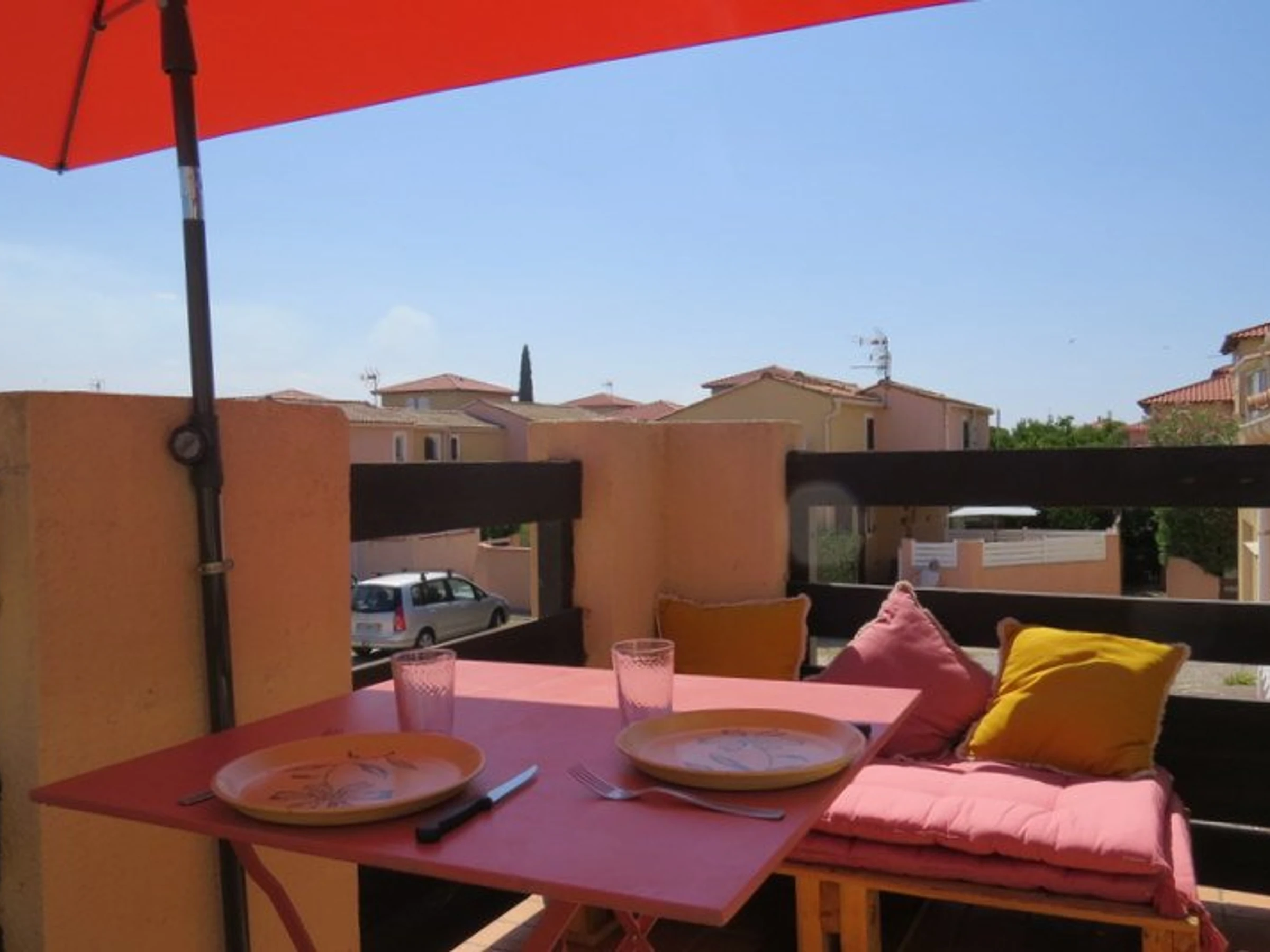 Terrasse avec salon de jardin, parasol.
