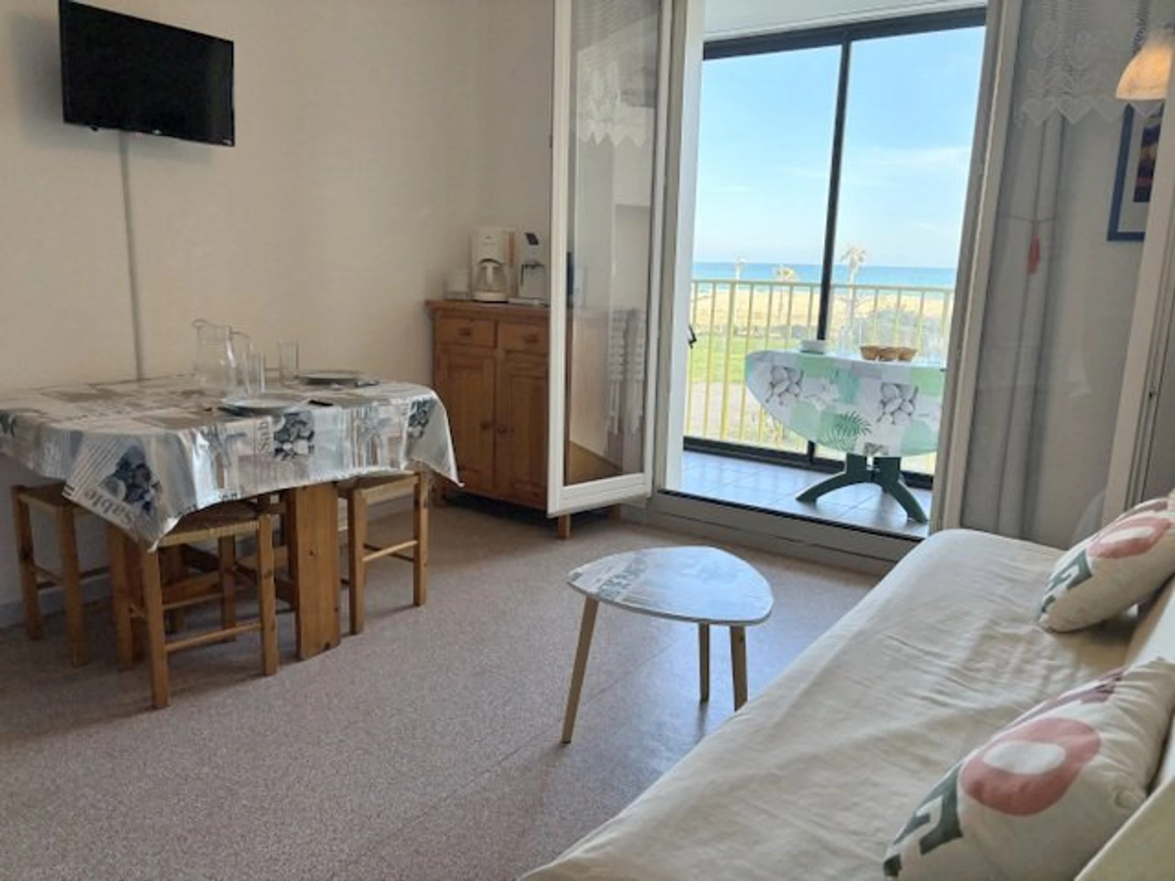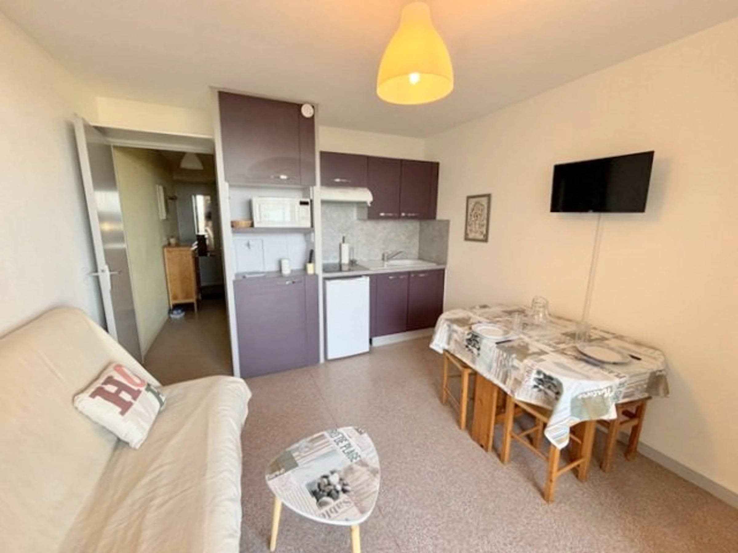 Un séjour avec canapé clic clac, télévision et table à manger. Une kitchenette équipée, deux plaques vitrocéramique, cafetière, micro-onde et frigo TOP.