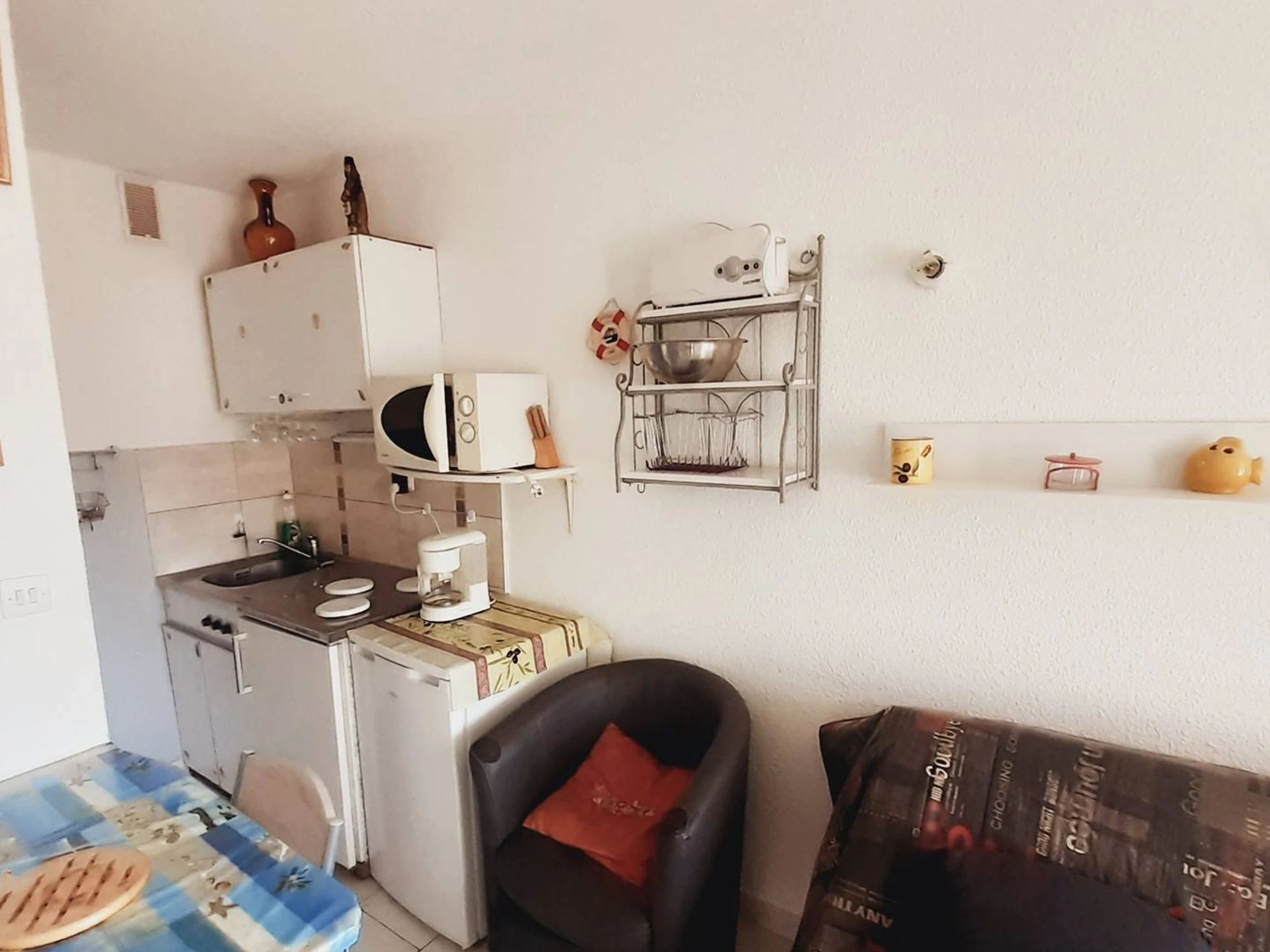 Au 3E étage (sans ascenseur), Studio cabine de 25 m2 (avec le balcon). Séjour/salle à manger avec canapé BZ (couchage 2 personnes) et TV. Coin cuisine équipée : 3 plaques de cuisson, micro-ondes, frigo top). Petite chambre avec 2 lits superposés en 90. Salle d'eau avec WC. Balcon semi fermé avec coin repas et une superbe vue sur le lac marin et les montagnes. ACCES PISCINE en saison (15 juin-15 septembre)