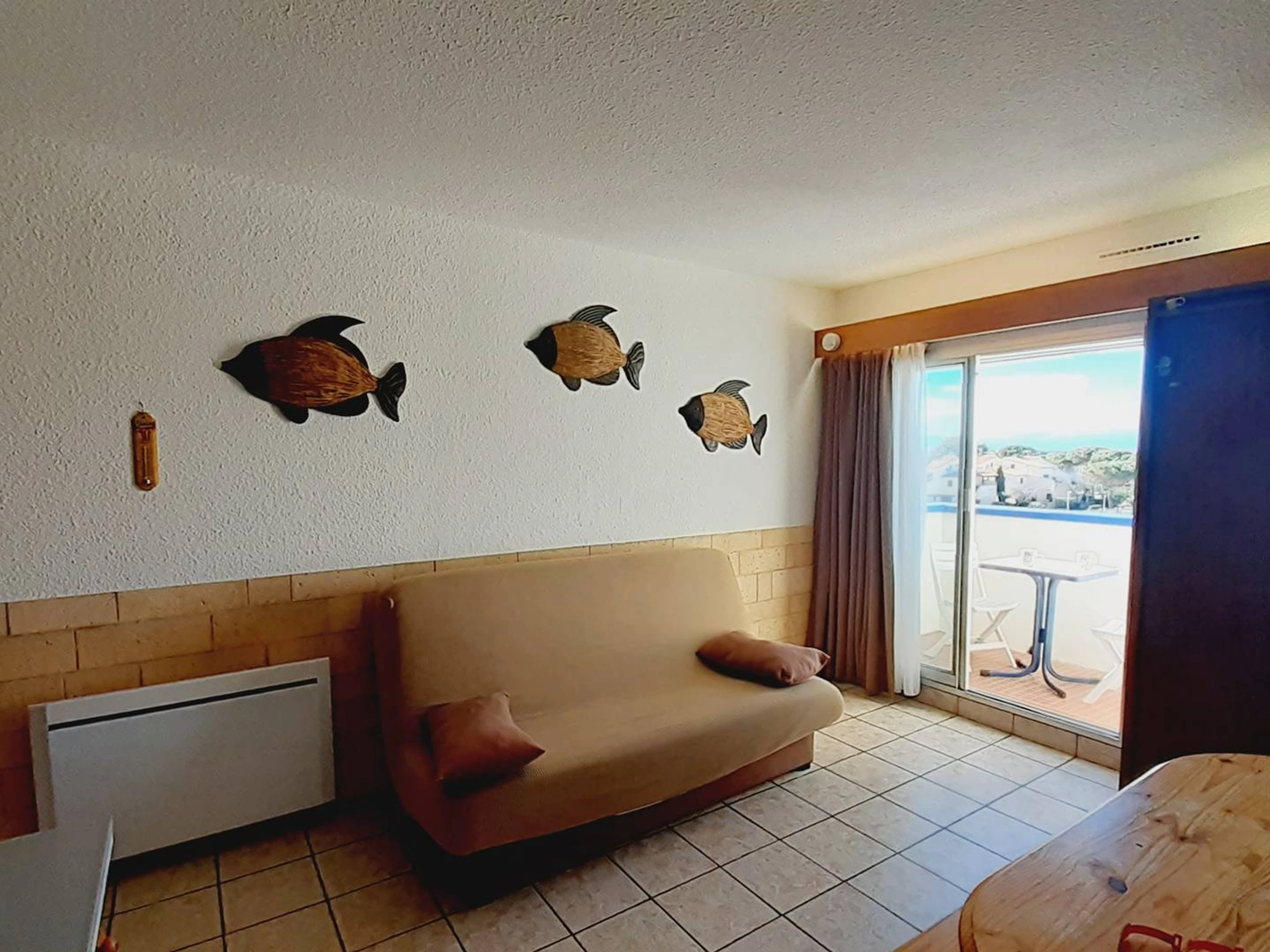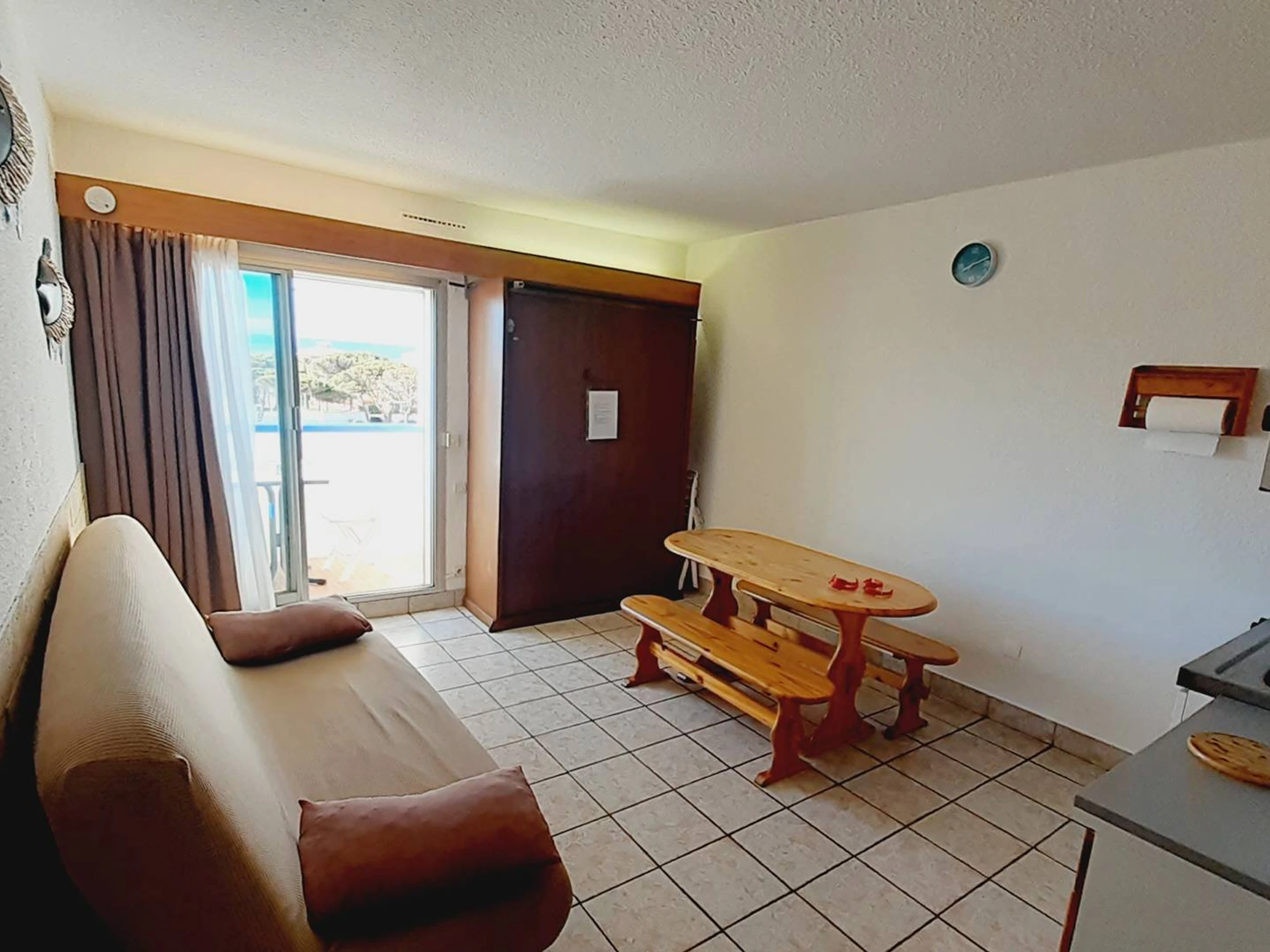 Au 2 E étage (ascenseur), Studio canine, ouvert sur Balcon comprenant un séjour avec un coin repas, TV et clic clac en 140 (couchage 2 personnes), coin cuisine équipée ( plaques, Micro onde, frigo top, lave linge). Coin cabine avec lits superposés en 90 (idéal couchages 2 enfants). Salle de bain avec WC. Balcon équipé exposée OUEST (coin repas avec table et chaises) et piscine (15 juin-15 septembre). Equipé pour 4 personnes.