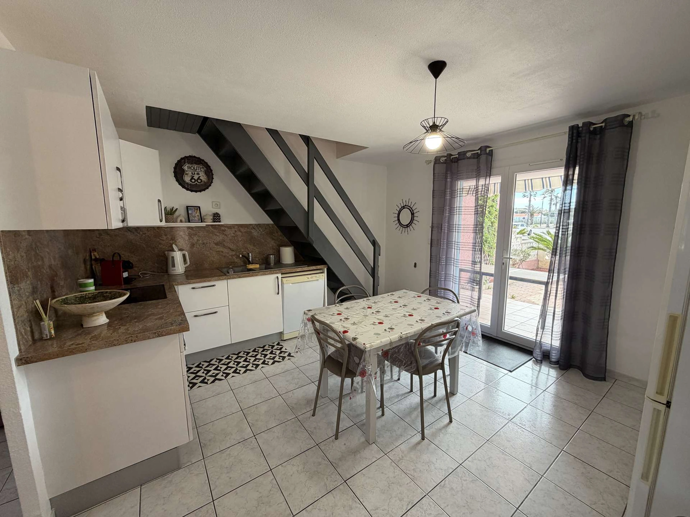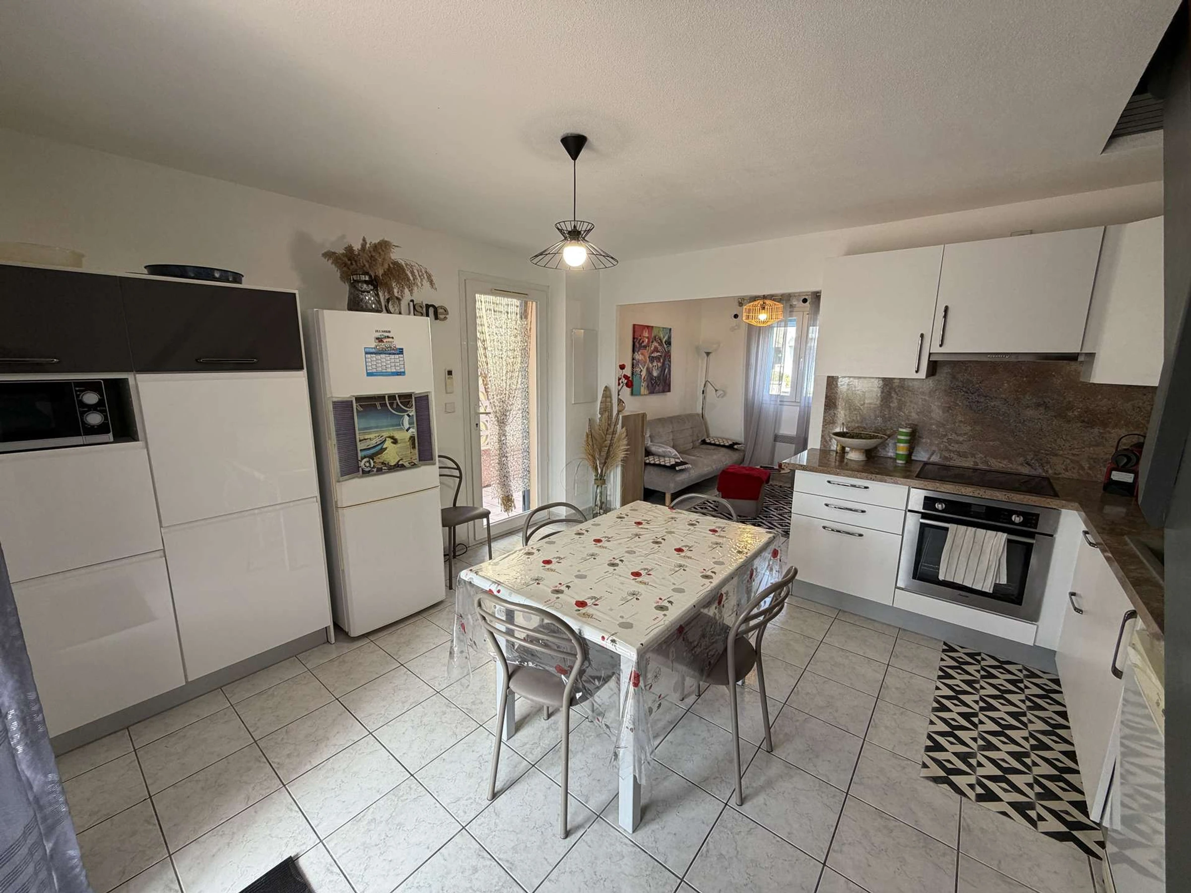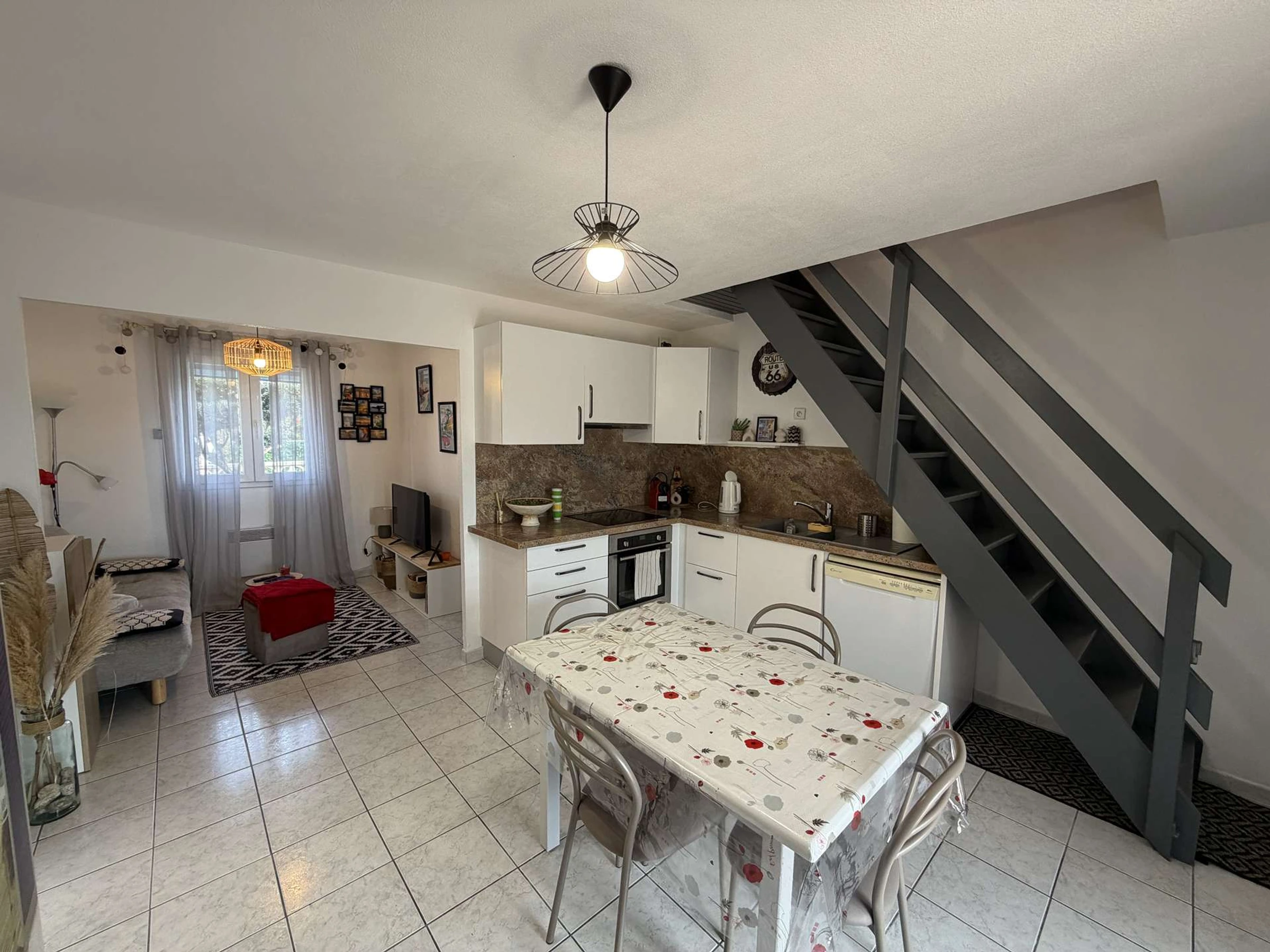 Villa de vacances 3 pièces (50 m2), confortable et agréable: Salon/séjour climatisé avec coin repas, et coin nuit (canapé clic clac, couchage 2 personnes), TV. Cuisine ouverte sur équipée (plaque de cuisson, four, lave-vaisselle, four micro-ondes, Frigo/ congélateur). WC séparé avec lave main. Cellier attenant (accès depuis la terrasse) avec lave linge et frigo top supplémentaire.