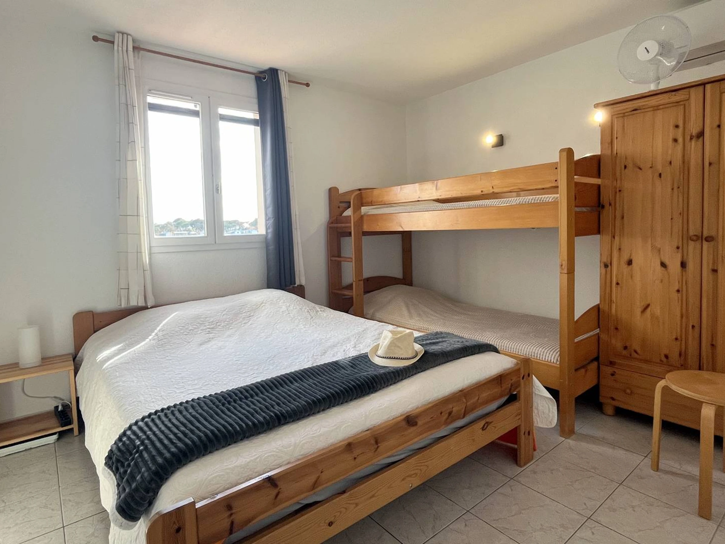 La seconde chambre, également climatisée, propose un lit double en 160 cm ainsi que deux lits superposés en 90 cm, idéale pour accueillir enfants ou amis en toute convivialité.