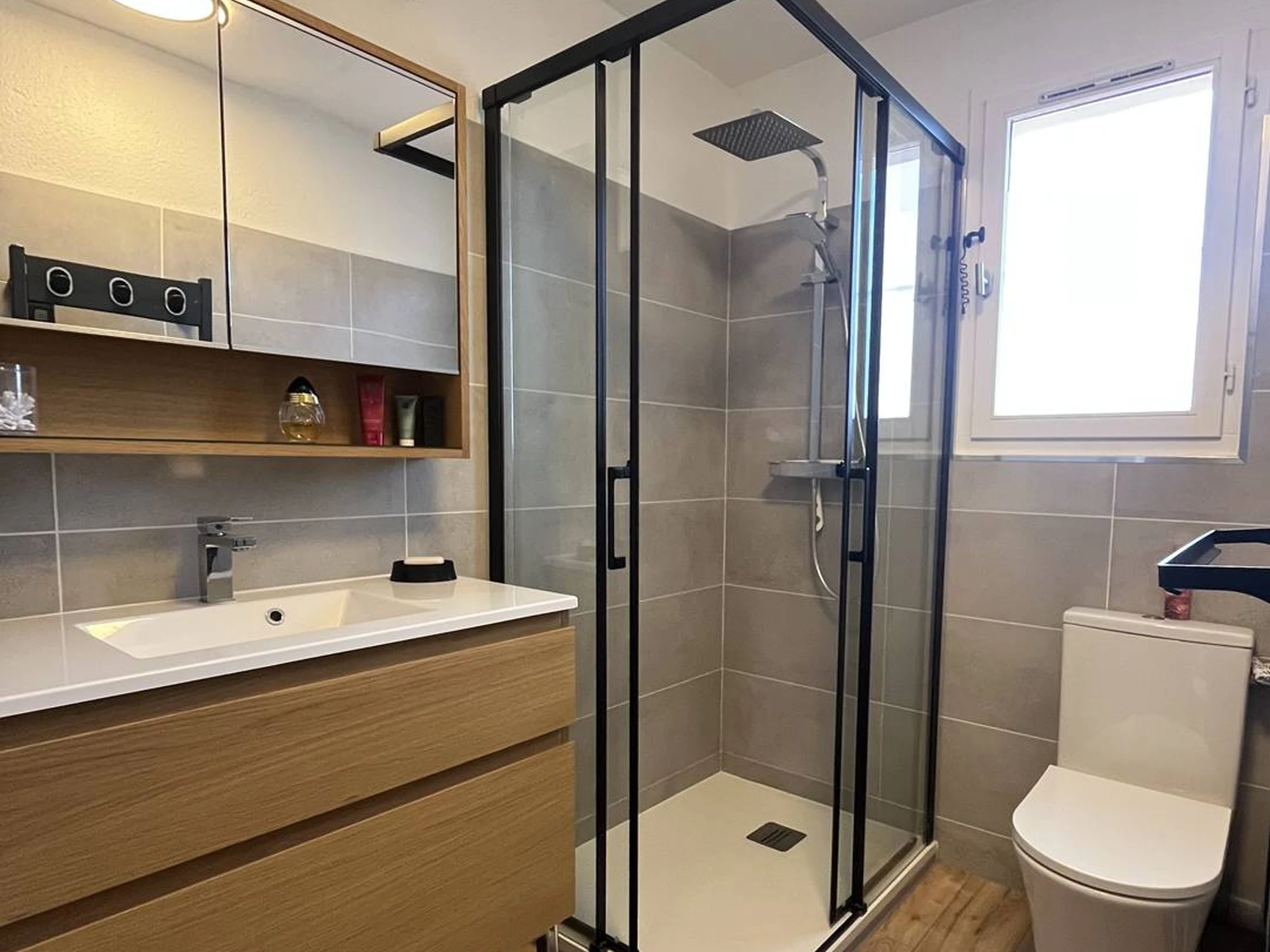 Vous bénéficierez également d’une salle d’eau moderne avec douche, vasque, WC et sèche-serviettes pour plus de confort.