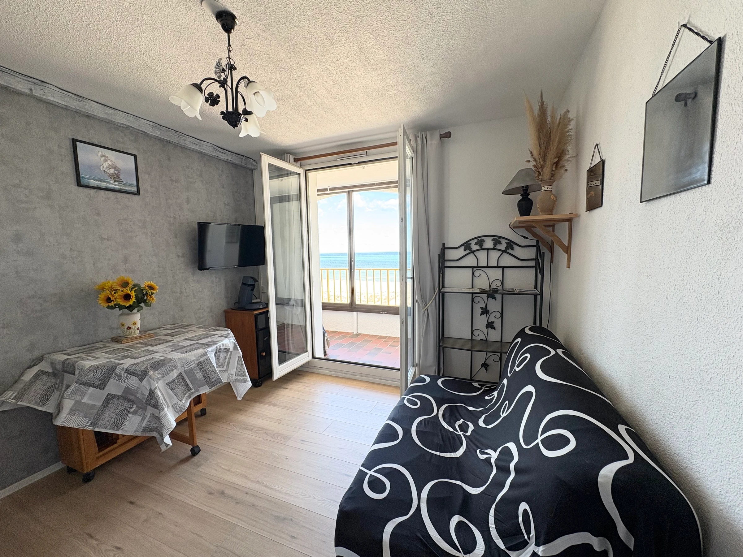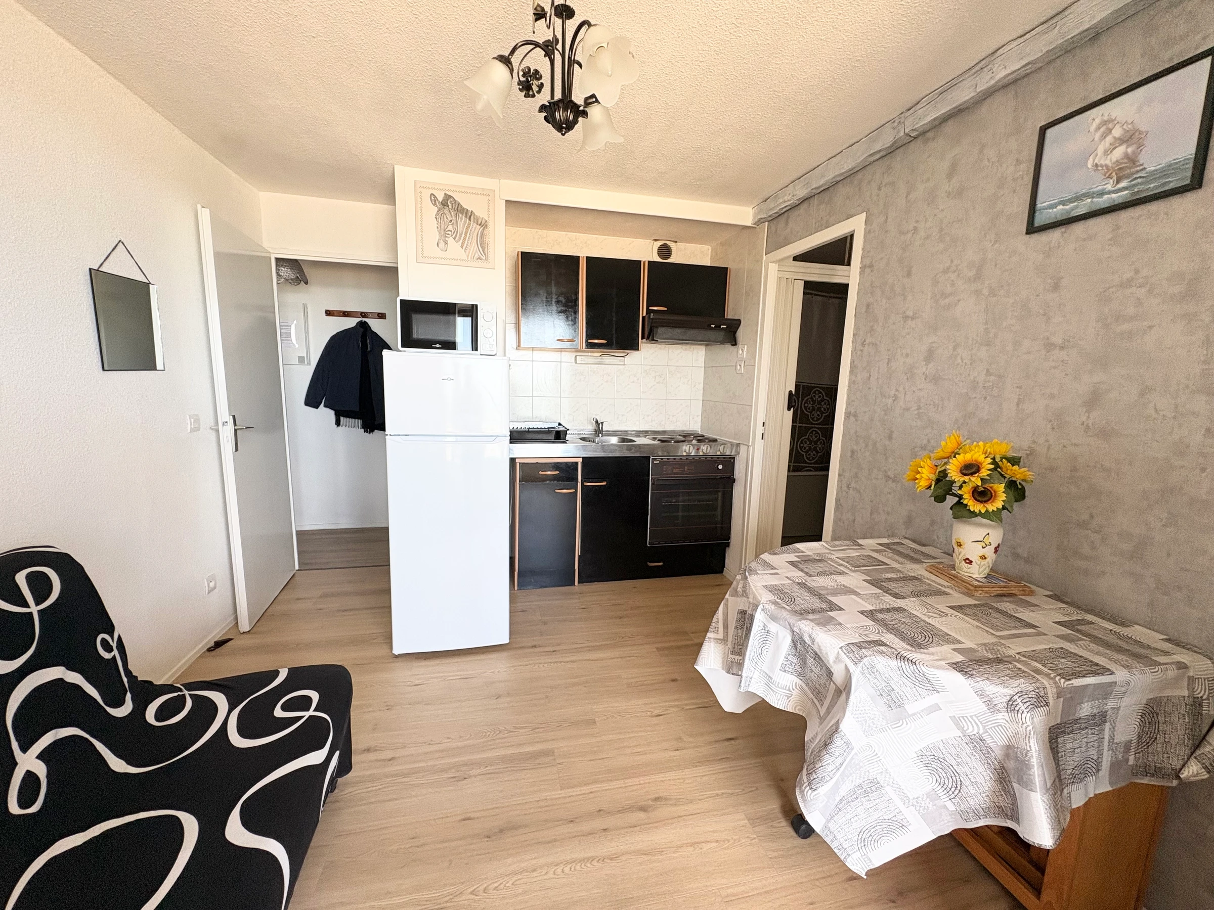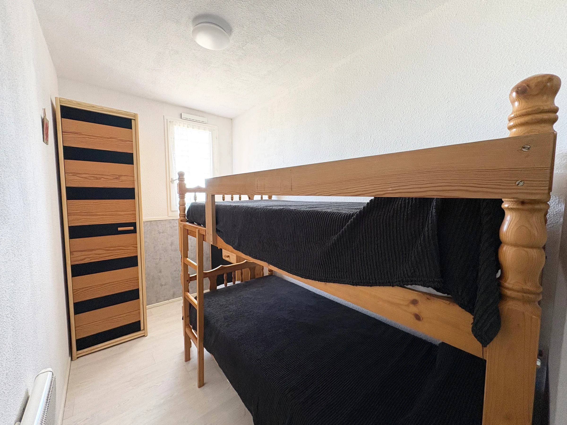 Le logement comprend une pièce à vivre lumineuse, un coin cuisine équipé, une chambre double (140), une chambre (lit superposé 90), une salle de bain, WC, ainsi qu’une belle loggia aménagée face mer pour profiter pleinement des beaux jours 🛋️🛏️.Equipements : Plaques électrique. Four encastré, micro ondes, frigo congélateur, Hotte aspirante. Télévision, ventilateur, Mobilier de Terrasse.