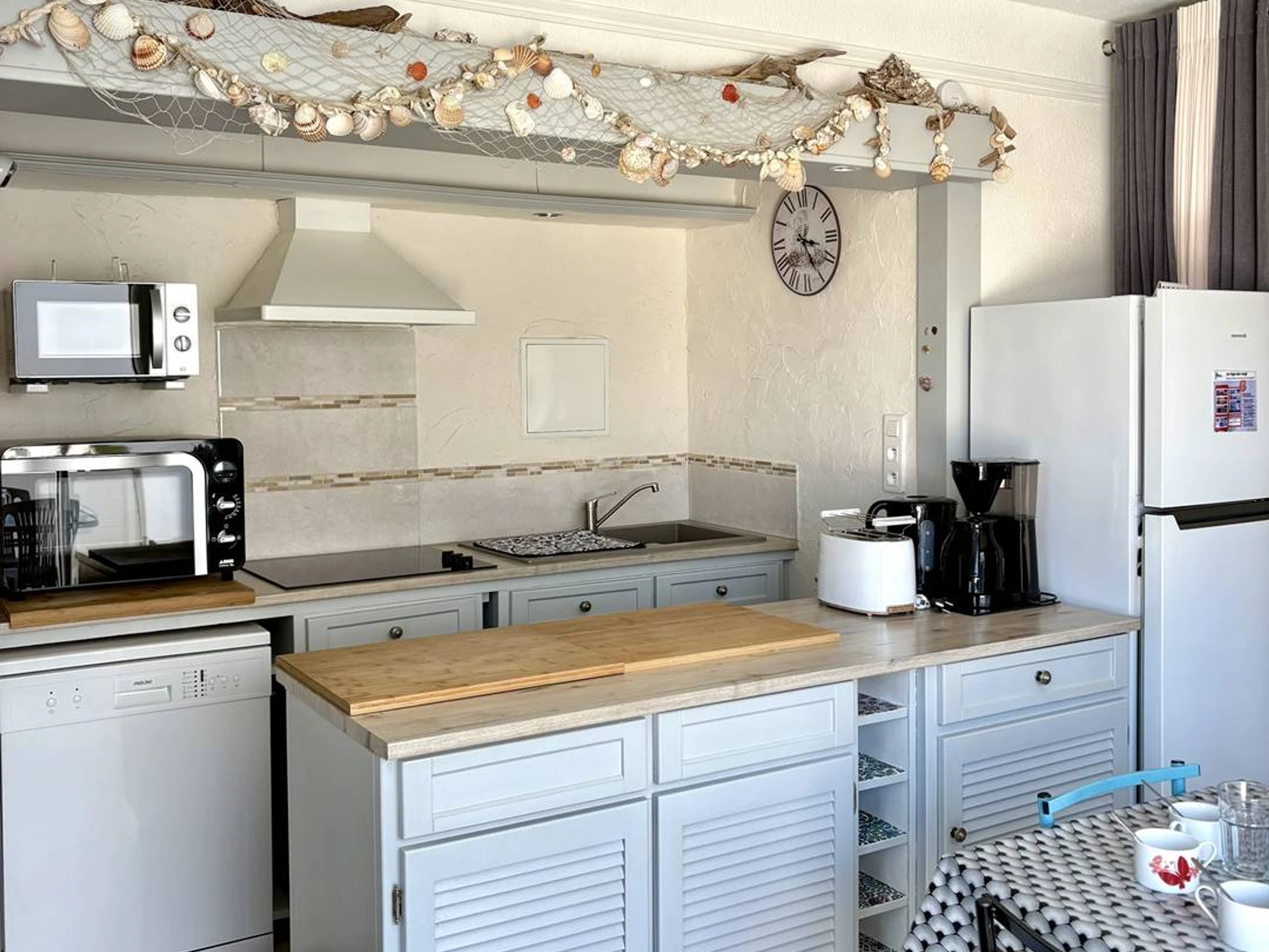 Cet appartement se composant d'une pièce principale séjour, coin nuit avec un canapé convertible pour deux et télévision, cellier avec lave-linge, d'un coin cuisine équipée, lave vaisselle, micro ondes, four, grille pain, bouilloire, cafetière à filtre.