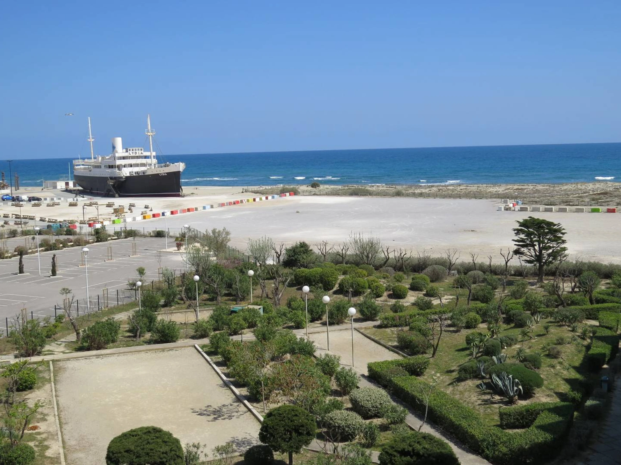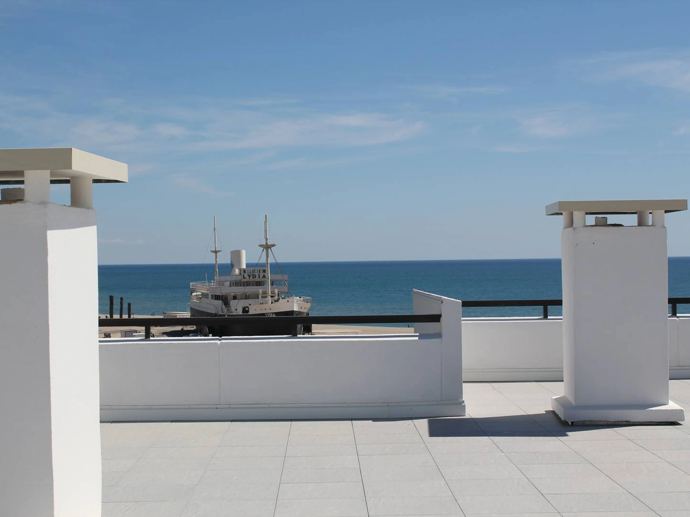 Terrasse avec salon de jardin et vue sur la mer et le Lydia.