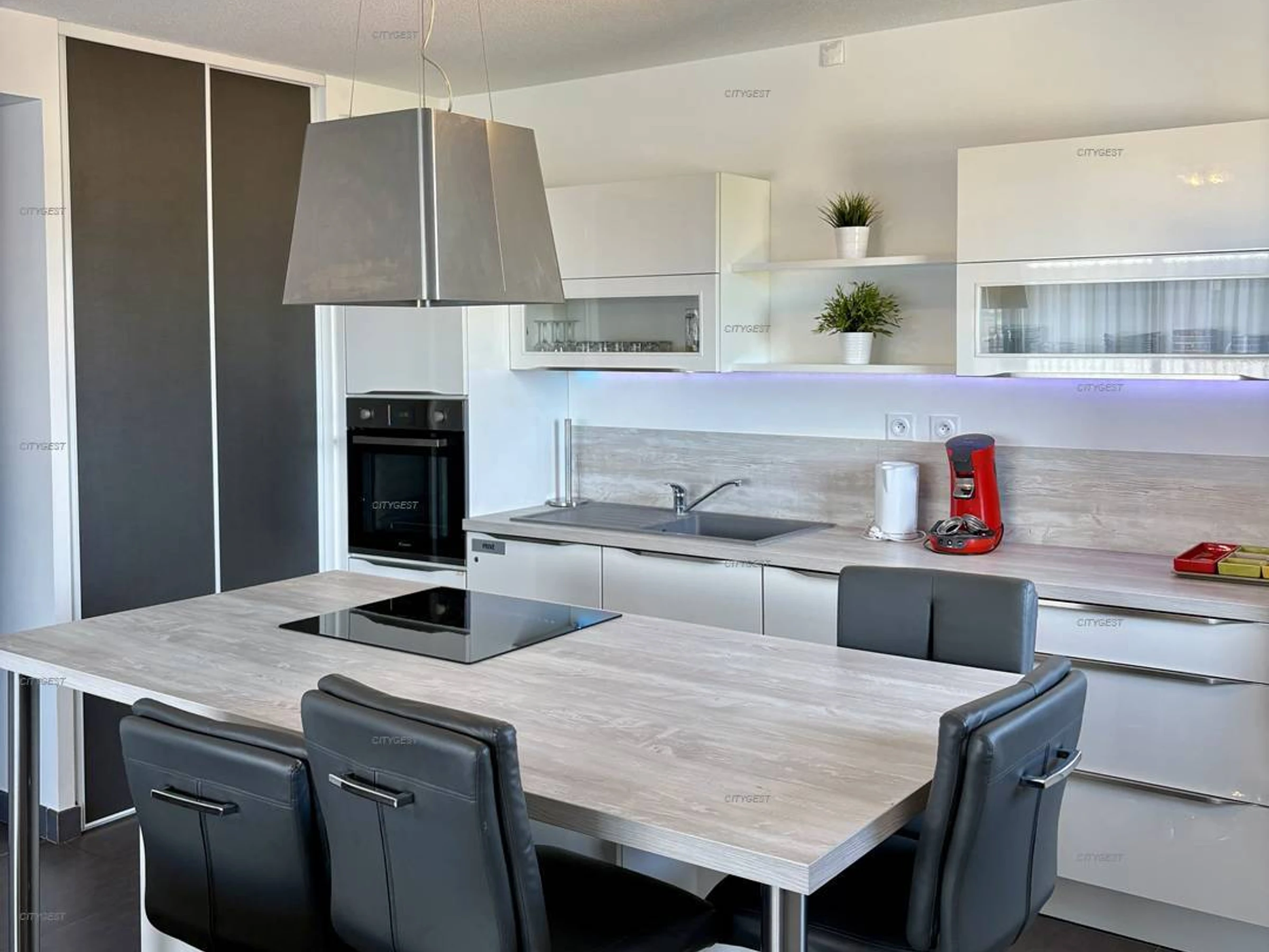 Cuisine ouverte équipée d'un micro-onde, plaque induction, four, lave vaisselle, réfrigérateur / congélateur, cafetière (Senseo), bouilloire.