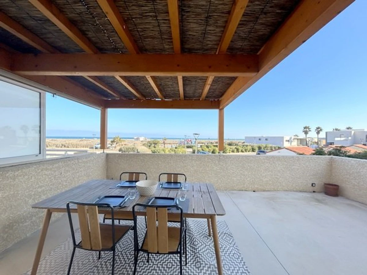 Grande terrasse vue mer 35 m² avec salon de jardin, plancha électrique et seconde terrasse derrière avec salon de jardin.