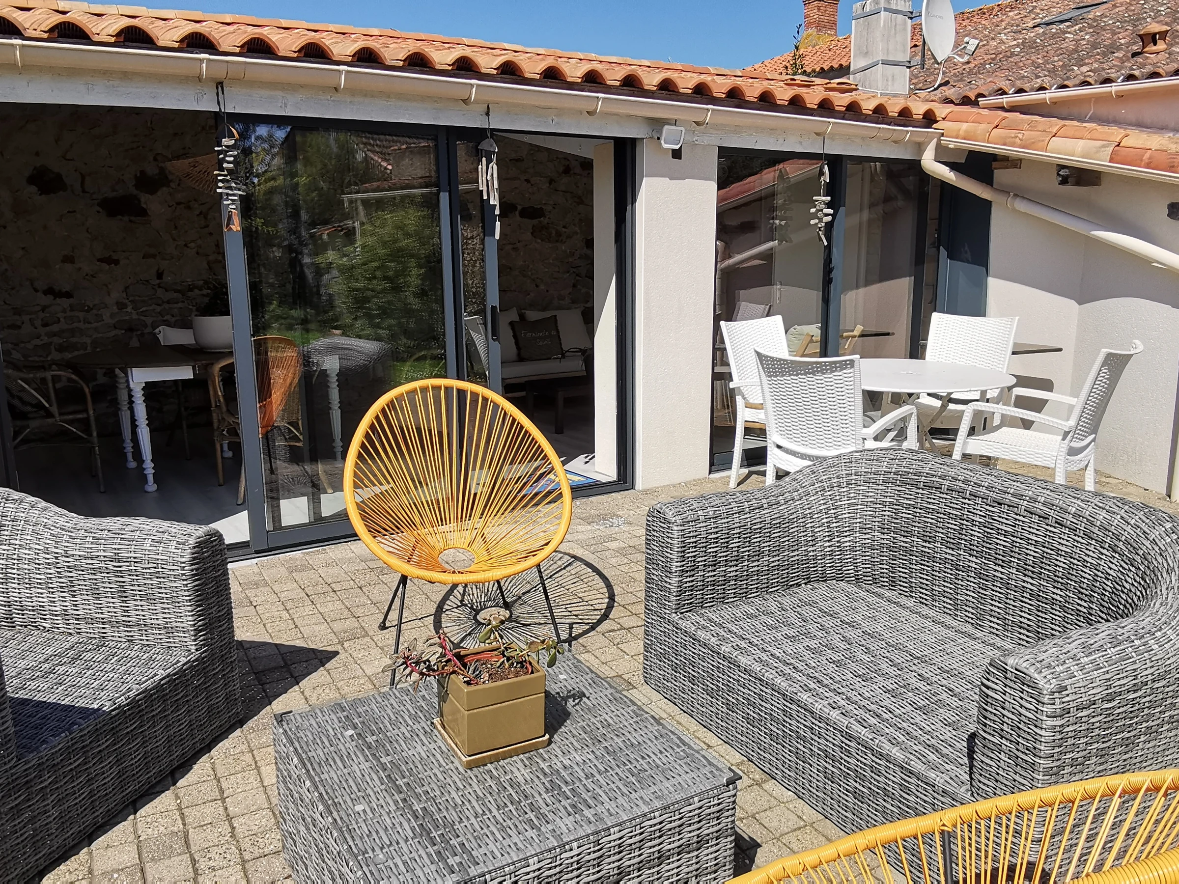 Un salon d'été avec son salon, transats, grill-plancha gaz (fermé par des baies vitrées).