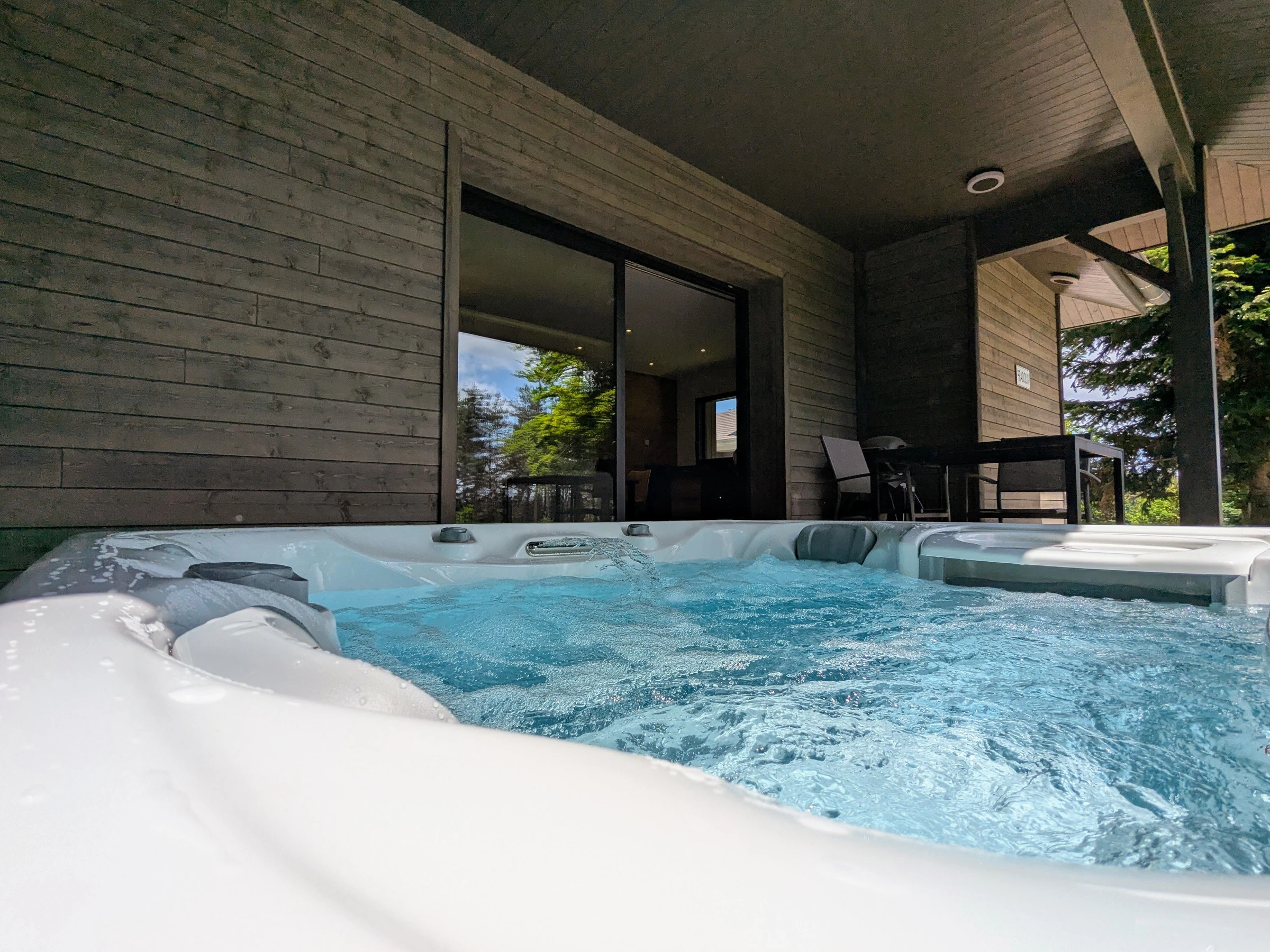 Vous pourrez profiter d’un extérieur couvert avec barbecue électrique, lits de repos, table et chaises, bain à remous privatif (durée conseillée 30 minutes) chauffé toute l’année.