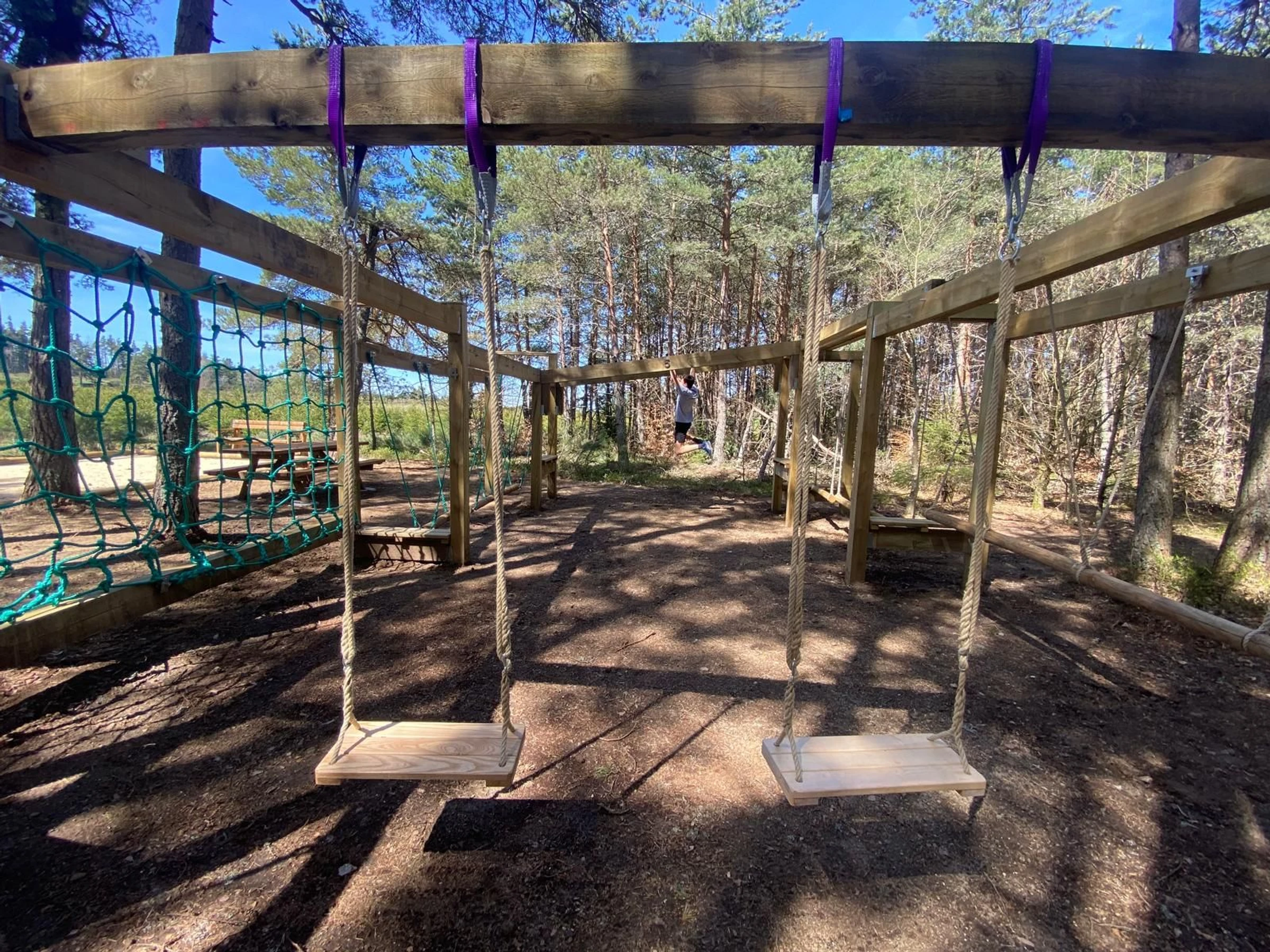 9 ateliers d’équilibre et de difficulté croissante (pont suspendu, trapèze en rondin, filet à grimper, etc).