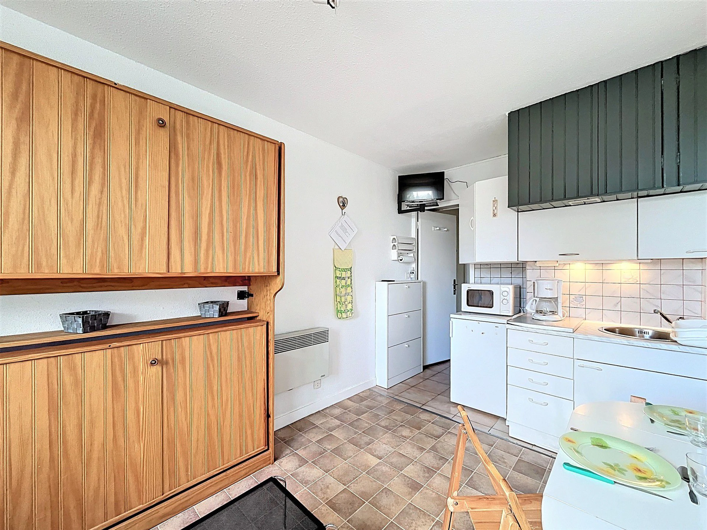 Ce studio bien entretenu sera idéal pour 2 adultes et 1 enfant. Il comprend : une entrée, un placard de rangement, une salle de bain avec toilettes, un coin kitchenette équipé de 2 plaques vitrocéramiques, un réfrigérateur top, un four micro-ondes, une cafetière électrique, une bouilloire, appareil à raclette et à fondue.