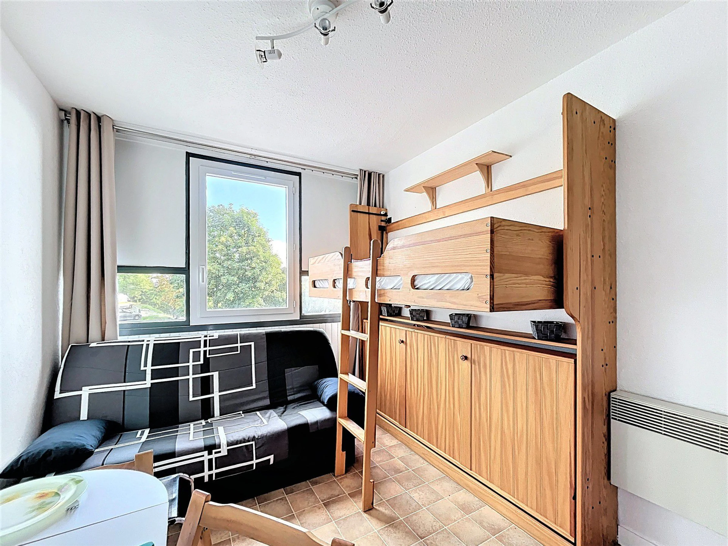 Un séjour avec 1 canapé convertible clic clac et 1 lit superposé pour 1 personne ainsi qu'une télévision à écran plat.