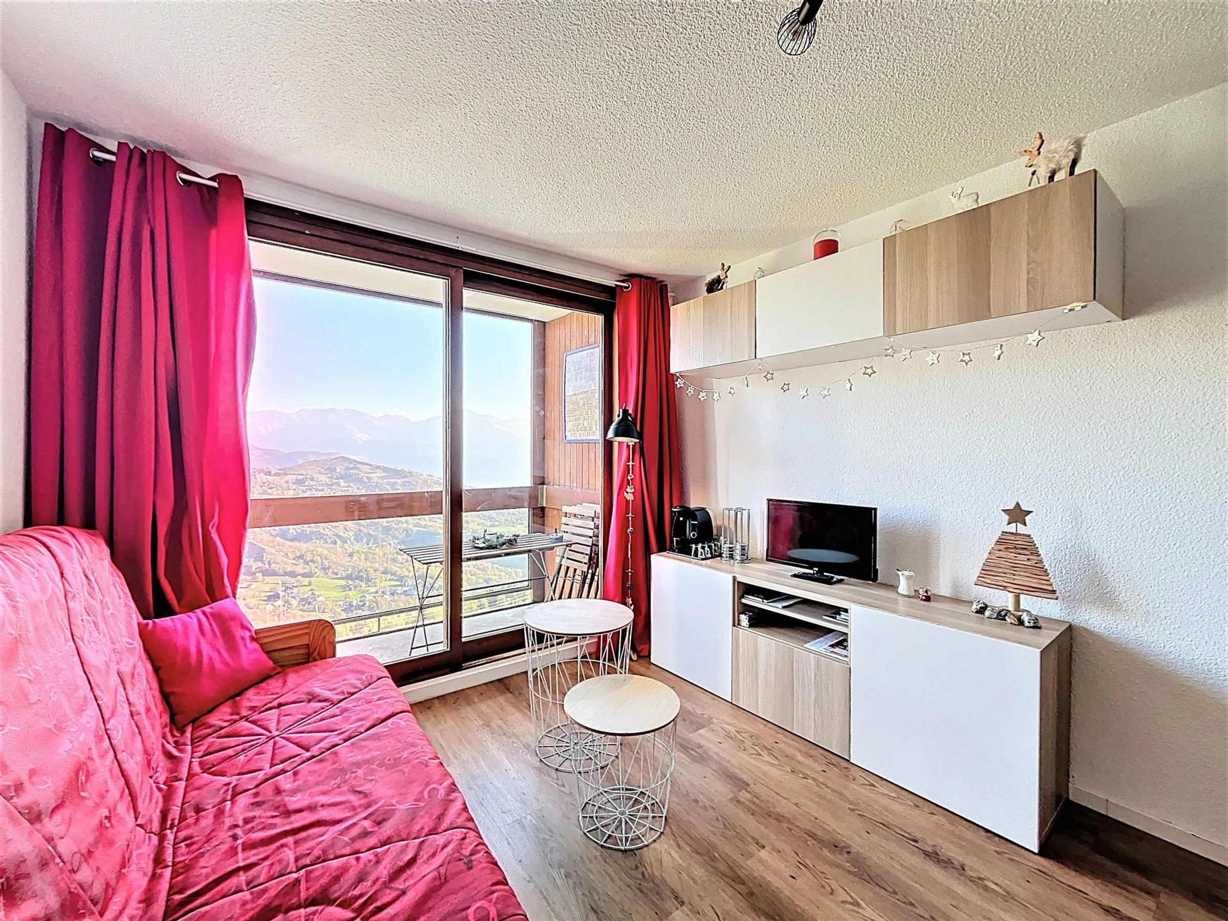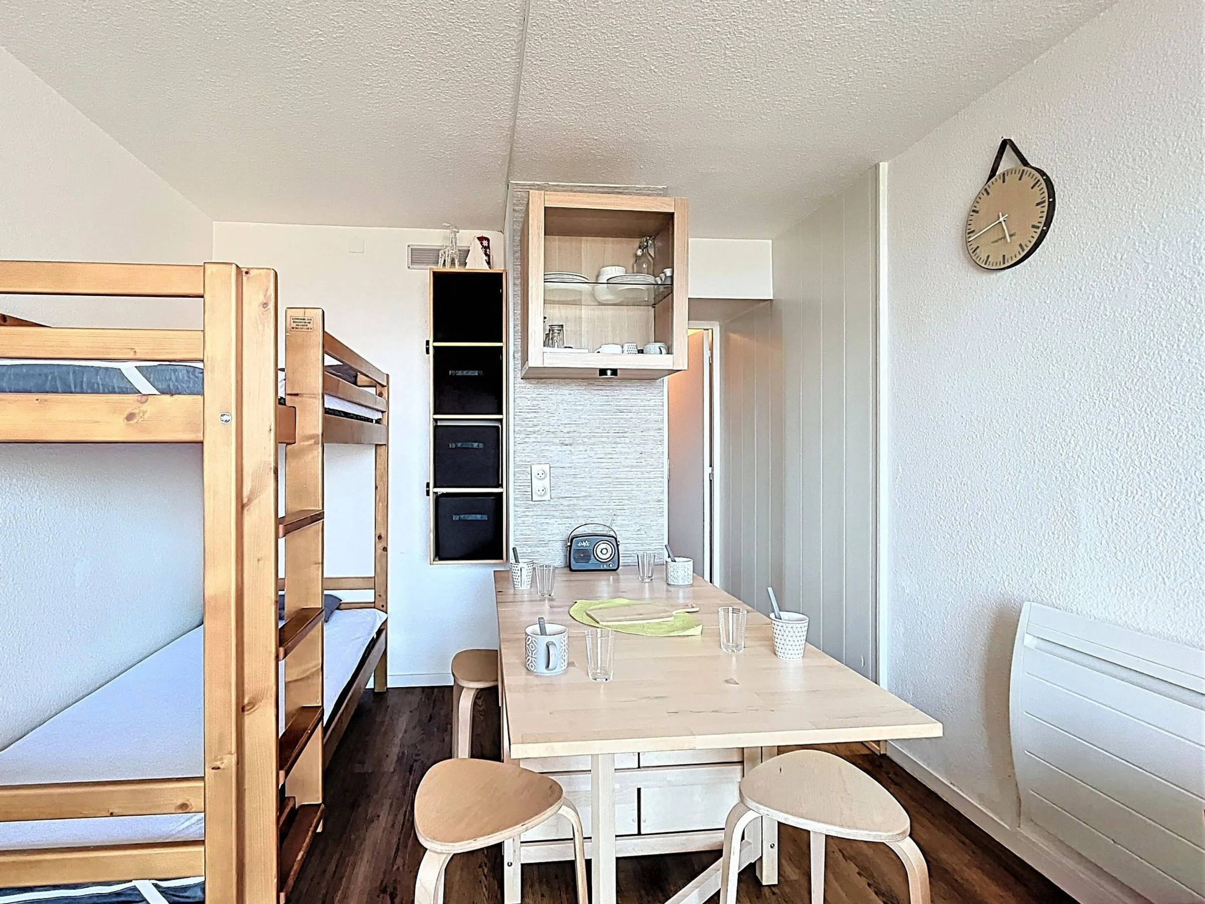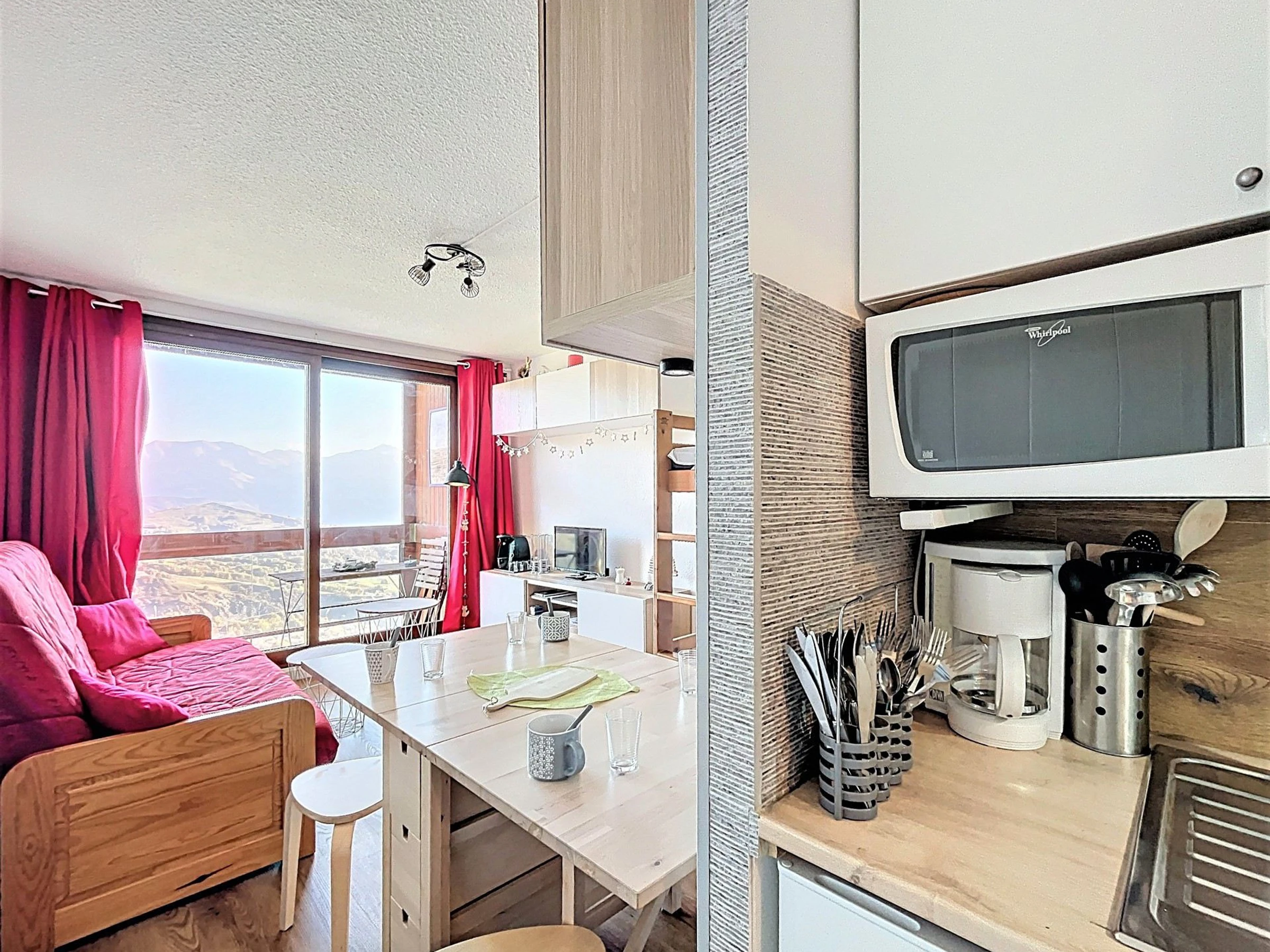 Beau studio de 22m², entièrement rénové, pour 4 personnes, Situé Résidence Soyouz, au 18ème étage, Balcon orienté nord, Vue montagne