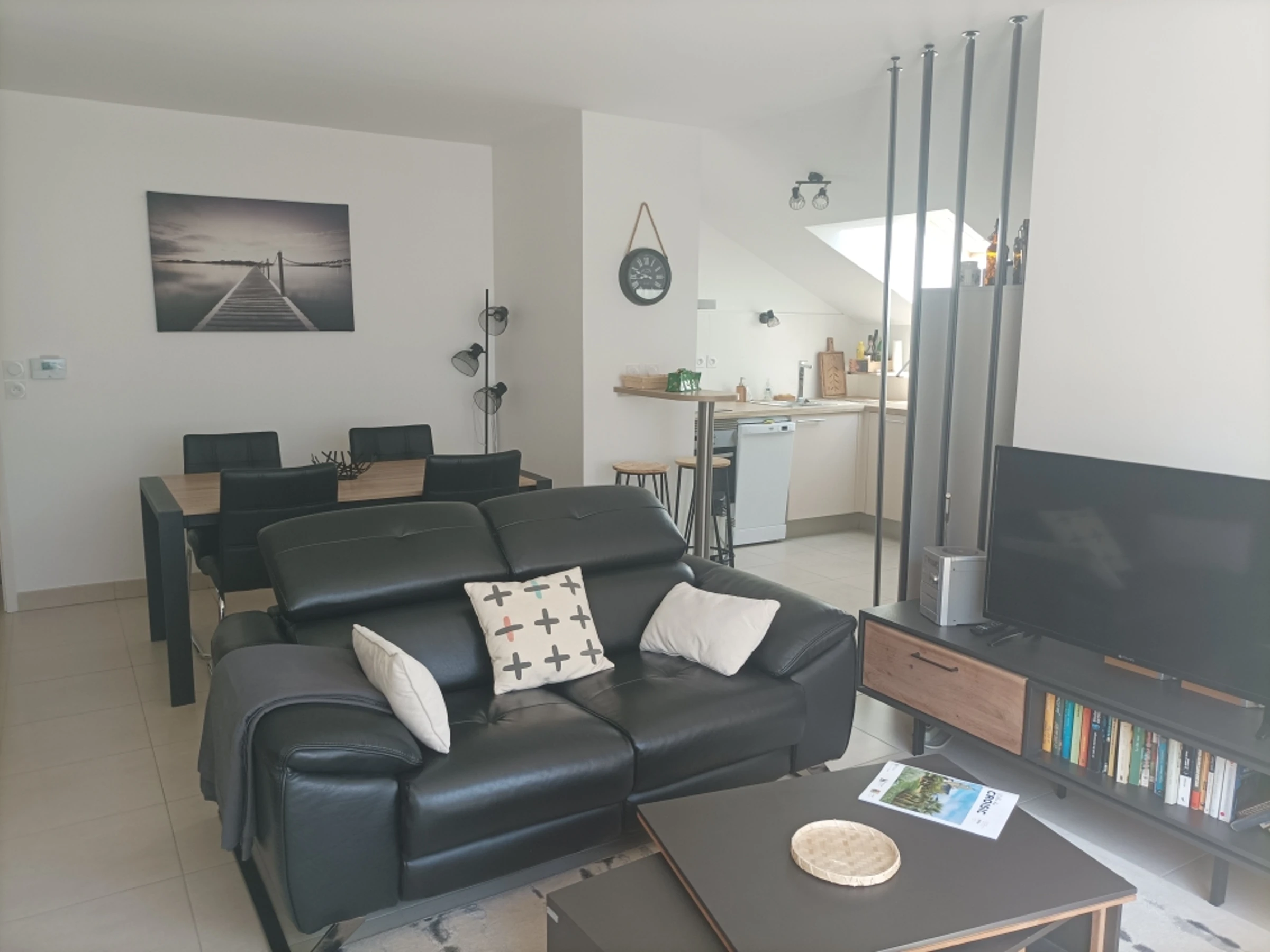 Dans résidence récente LA ROSE DES SABLES, au deuxième et dernier étage (avec ascenseur), cet appartement en duplex vous propose entrée, pièce de vie donnant sur terrasse avec vue mer, cuisine aménagée et équipée ouverte sur séjour (plaques induction, four, micro-ondes, hotte, lave-vaisselle, lave-linge, réfrigérateur/congélateur, petit électro-ménager cafetière à filtre + une DOLCE GUSTO), chambre 1 (lit 160), salle d'eau, WC avec lave-mains. En duplex, chambre 2 (1 lit 160 + 1 lit d'appoint), salle de douche avec WC.