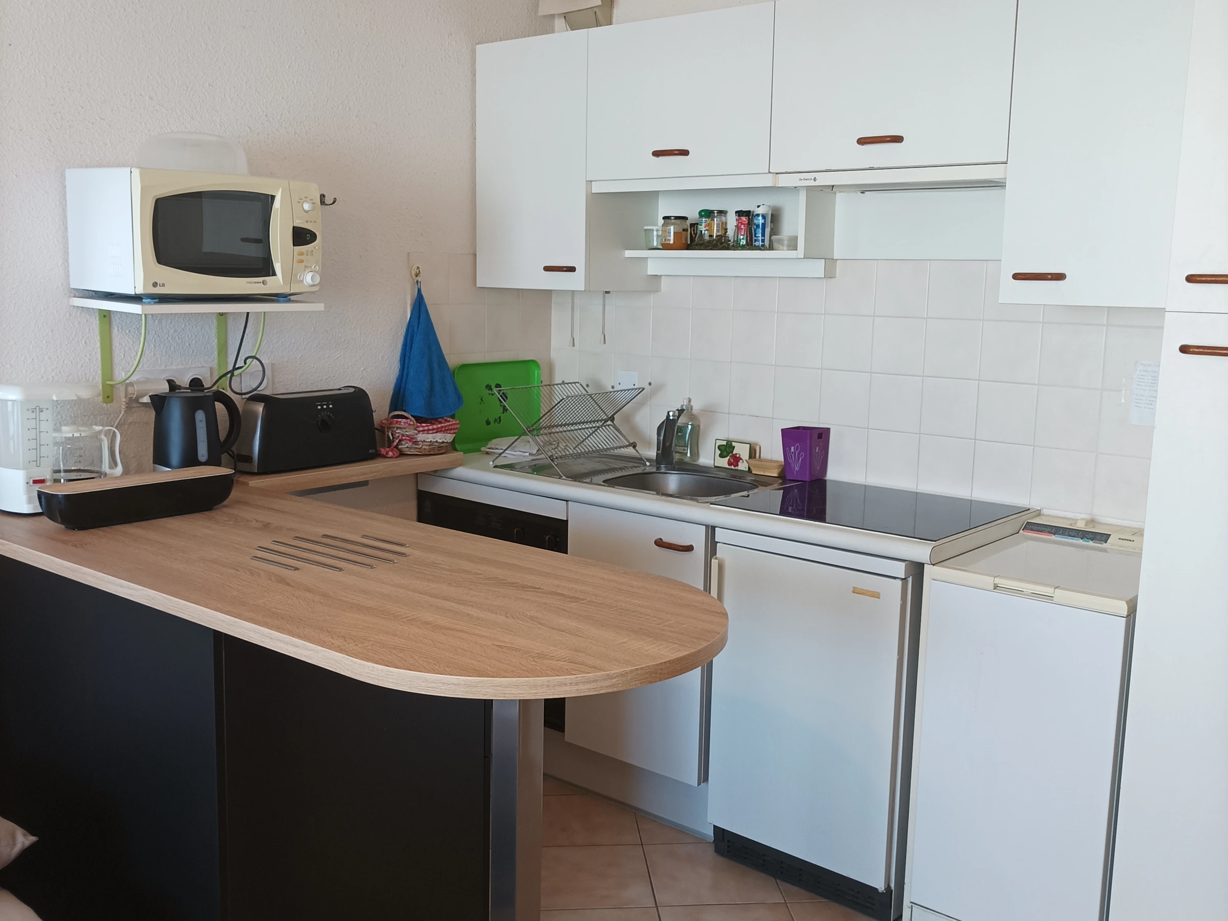 Il est composé de : entrée avec placard, pièce de vie (clic-clac 2 personnes) avec cuisine aménagée et équipée (3 feux induction, 1 four électrique, 1 four micro-ondes, 1 réfrigérateur top, 1 lave-linge, petit électro-ménager, cafetière à filtre), chambre avec 1 lit 140 et 1 lit 90 (+ 1 lit parapluie), salle d'eau,WC indépendant. Terrasse (table, chaises,transat) exposée ouest.